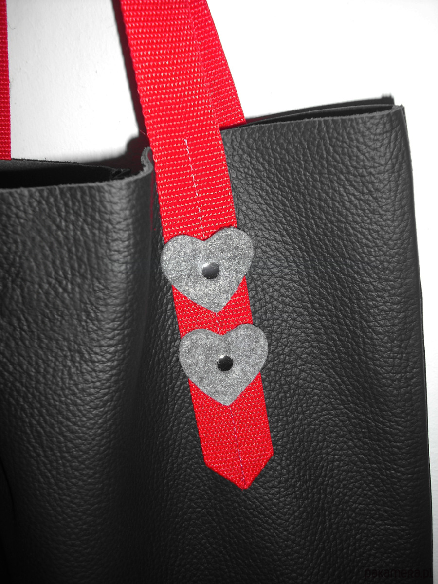 Wygodne czerwone rączki parciane z serduszkami i srebrnymi nitami.