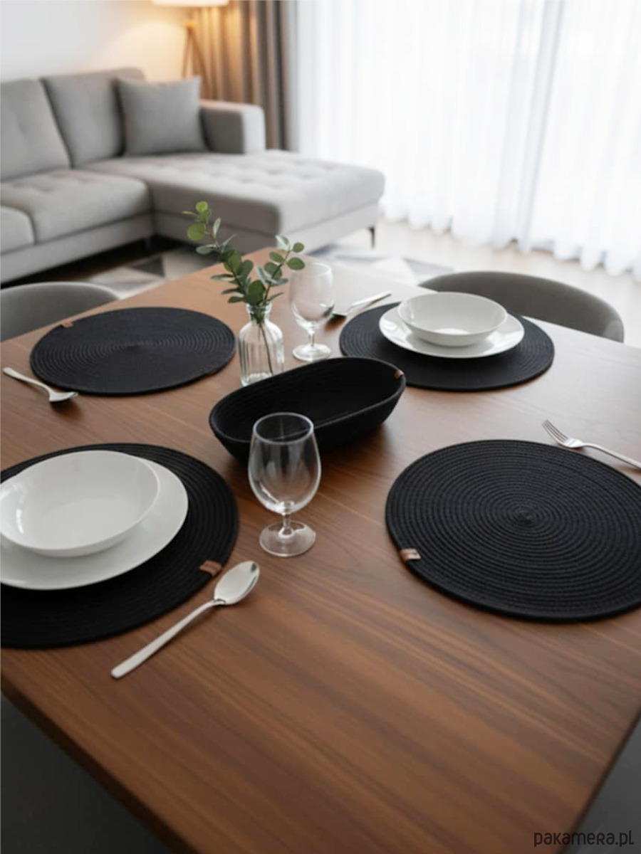 Nasze czarne podkładki ze sznurka to idealny dodatek do każdego wnętrza. Zestaw 4 podkładek pod talerze i koszyk na sztućce wykonany z bawełnianego sznurka z recyklingu. Minimalistyczny design i wysoka jakość materiałów sprawiają, że ten zestaw doskonale pasuje do wielu wnętrz.