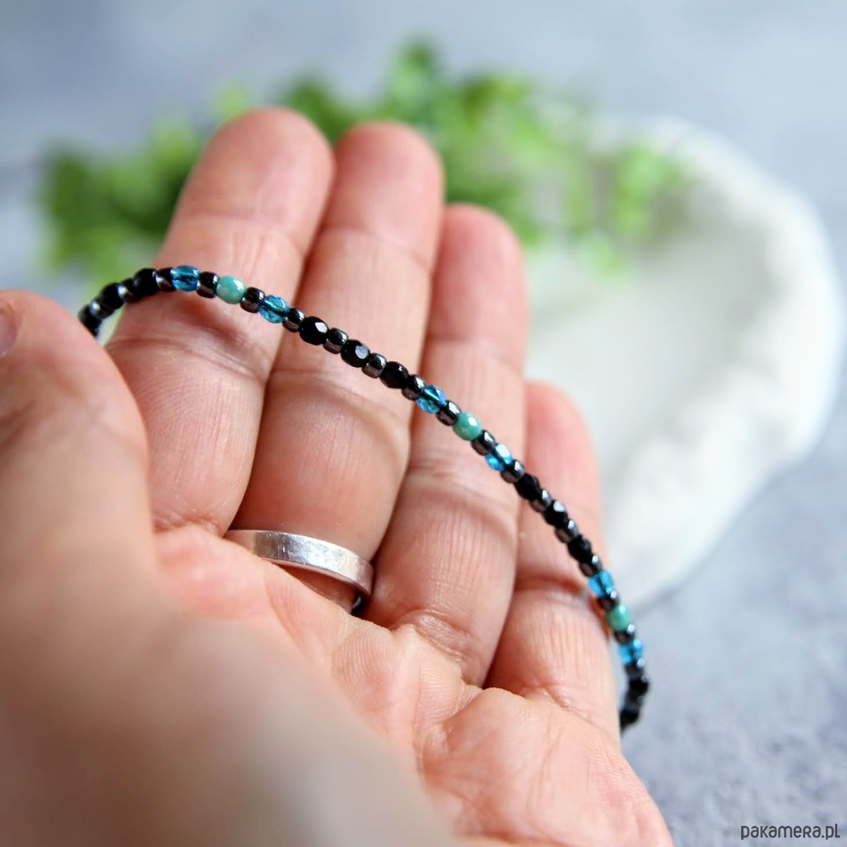 Bransoletka do noszenia na nodze/kostce ze szklanych koralików - szlifowanych czarnych oraz mniejszych w kolorze grafitowym.