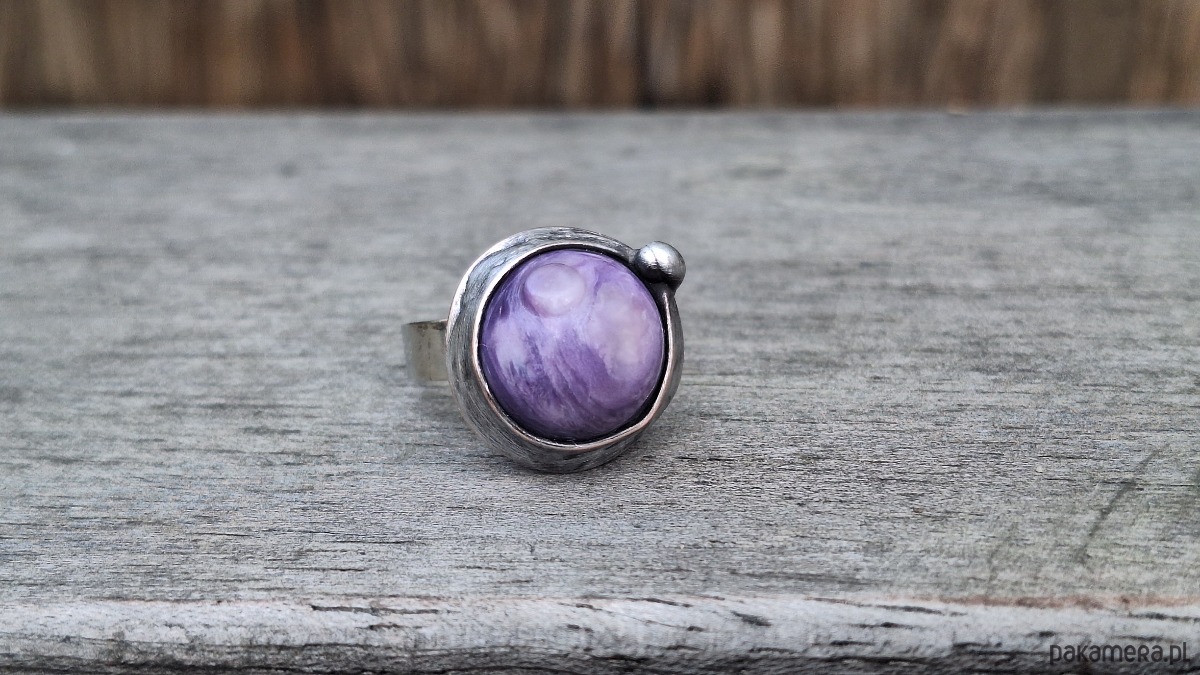 Pierścionek wykonany z miedzi, cyny i czaroitu. Wymiary ok. 1.5 na 1.5 cm. Regulowany. Kamień nie jest idealny.