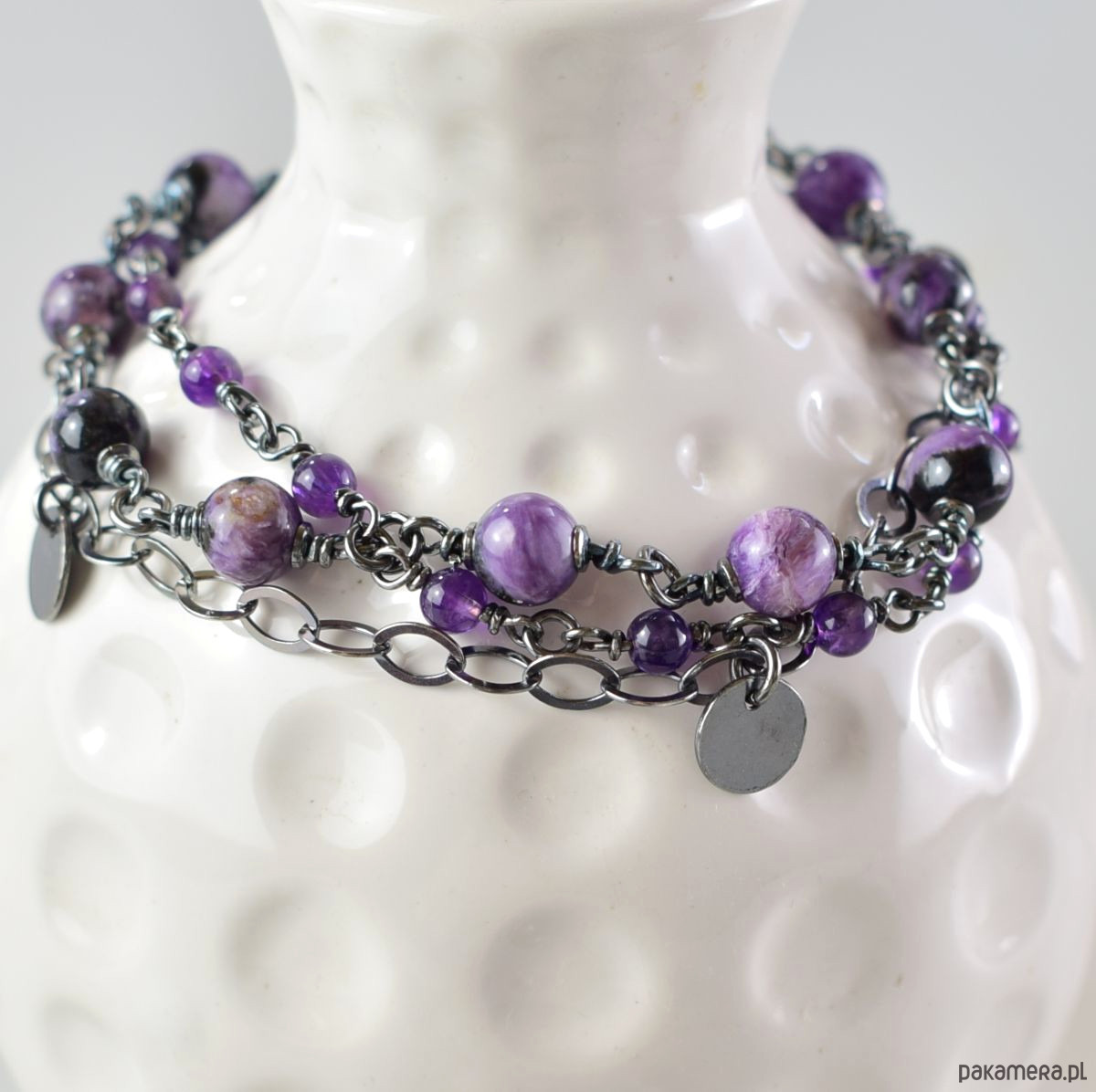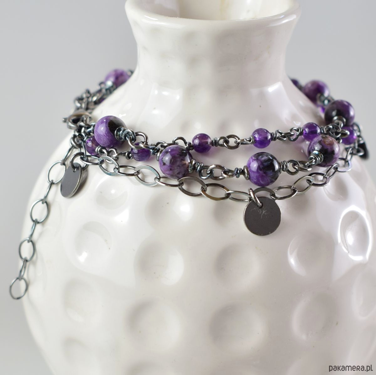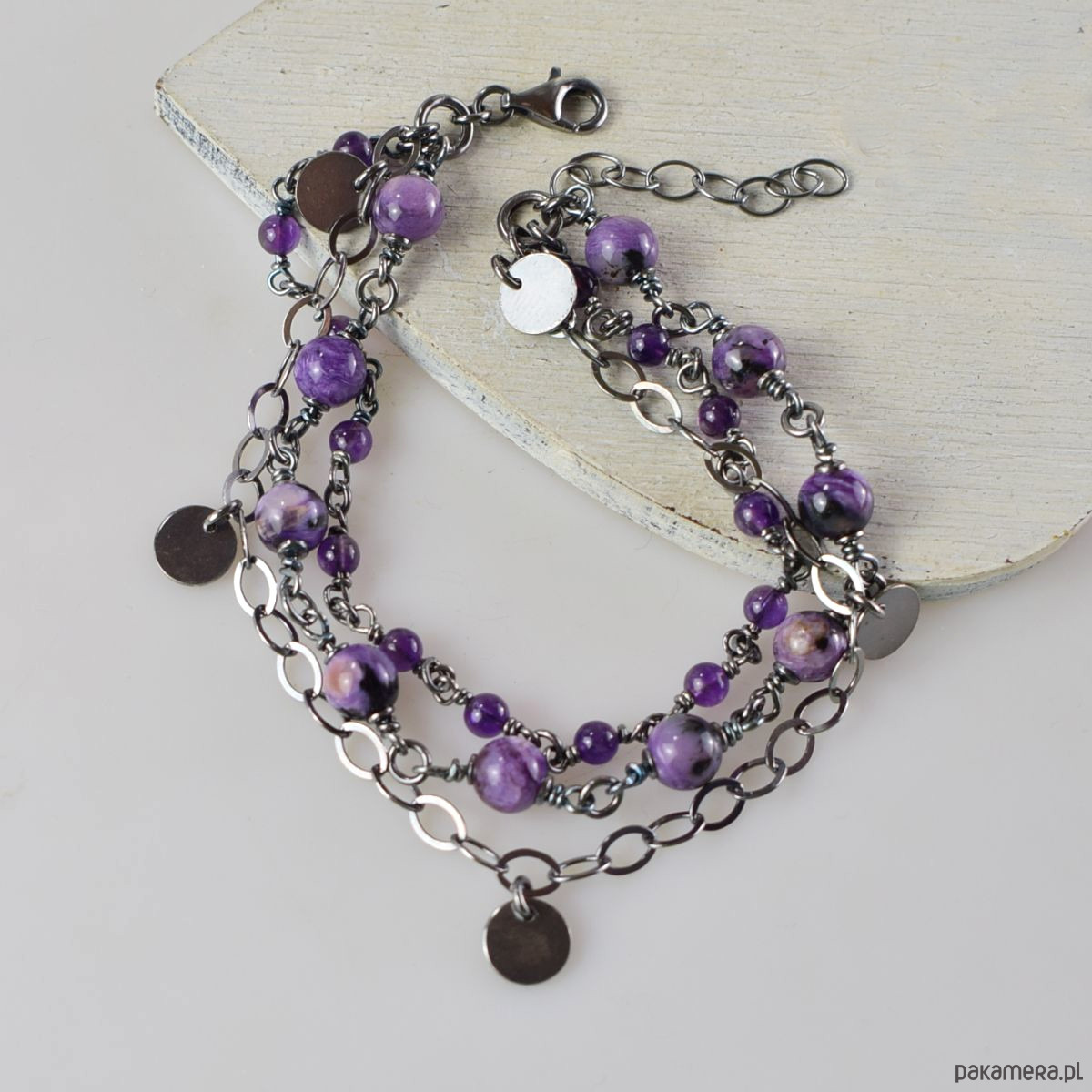 Bransoletka wykonana w całości ze srebra (próba 925) z czaroitem i ametystem. Całość została zoksydowana (przyciemniona) i wypolerowana. Długość regulowana 21 - 25 cm. Biżuteria zostanie ozdobnie zapakowana.