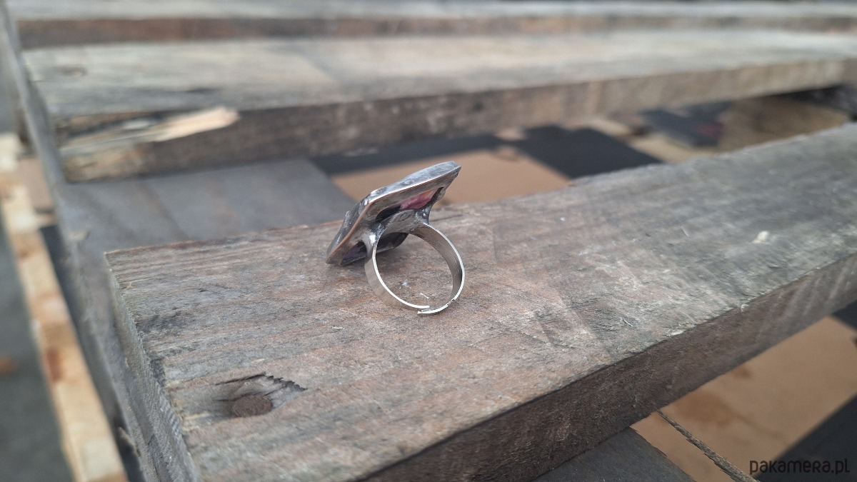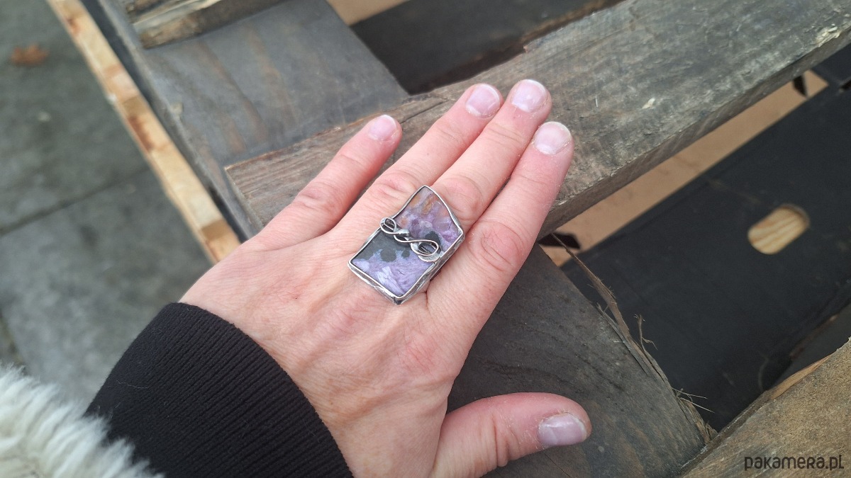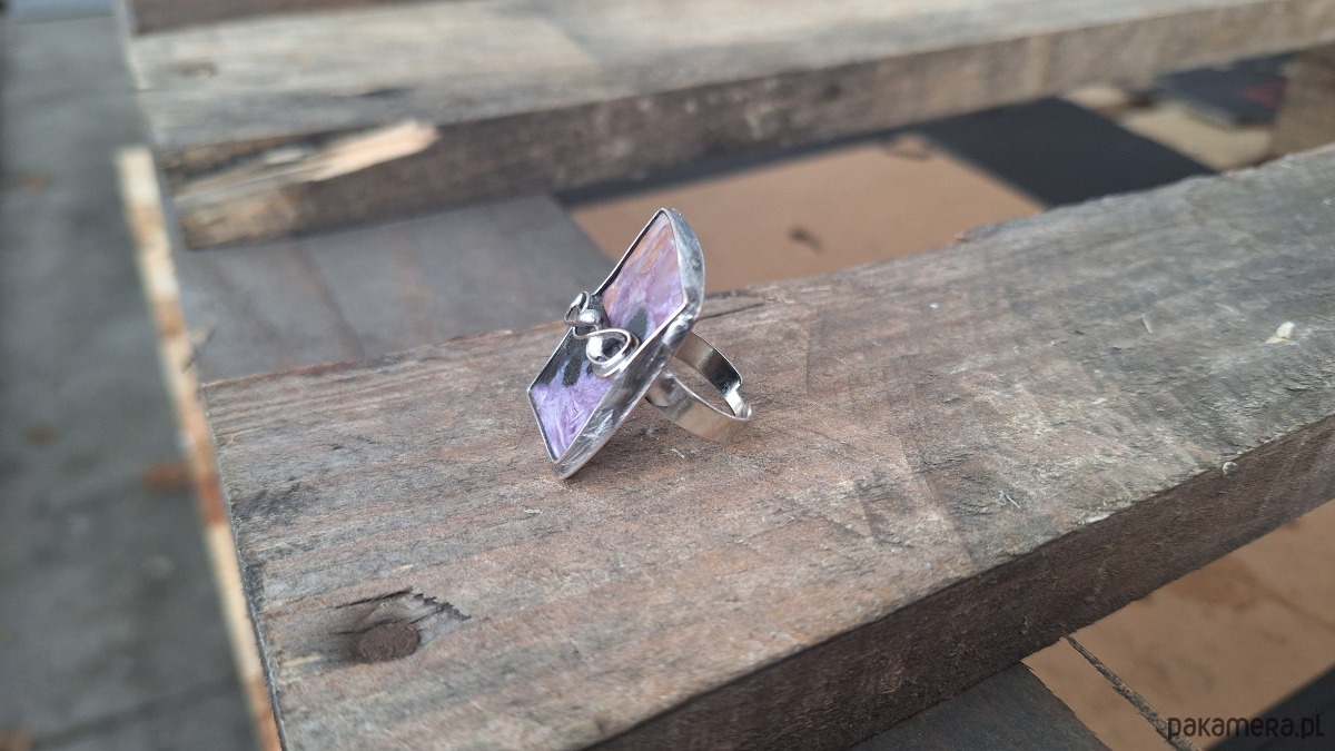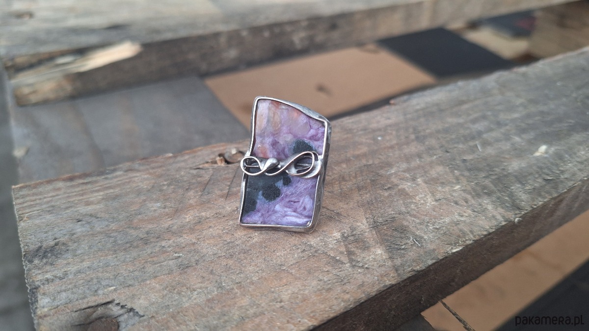 Pierścionek wykonany z miedzi, cyny i czaroitu. Wymiary ok. 3 na 2 cm. Regulowany.