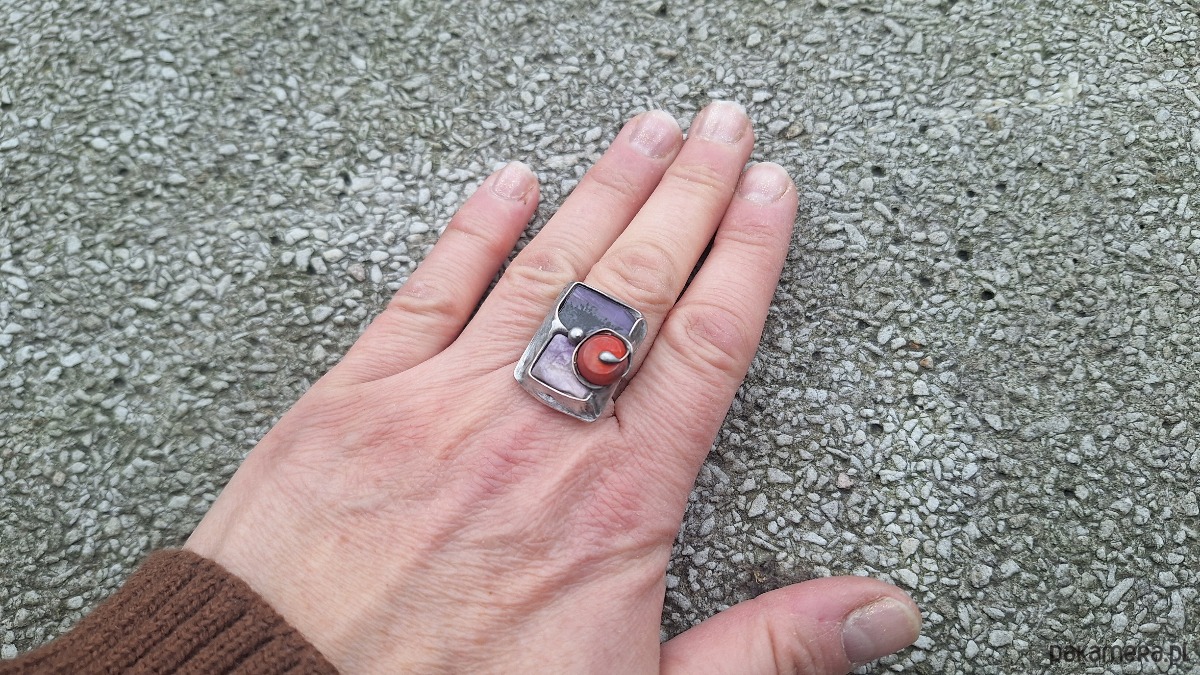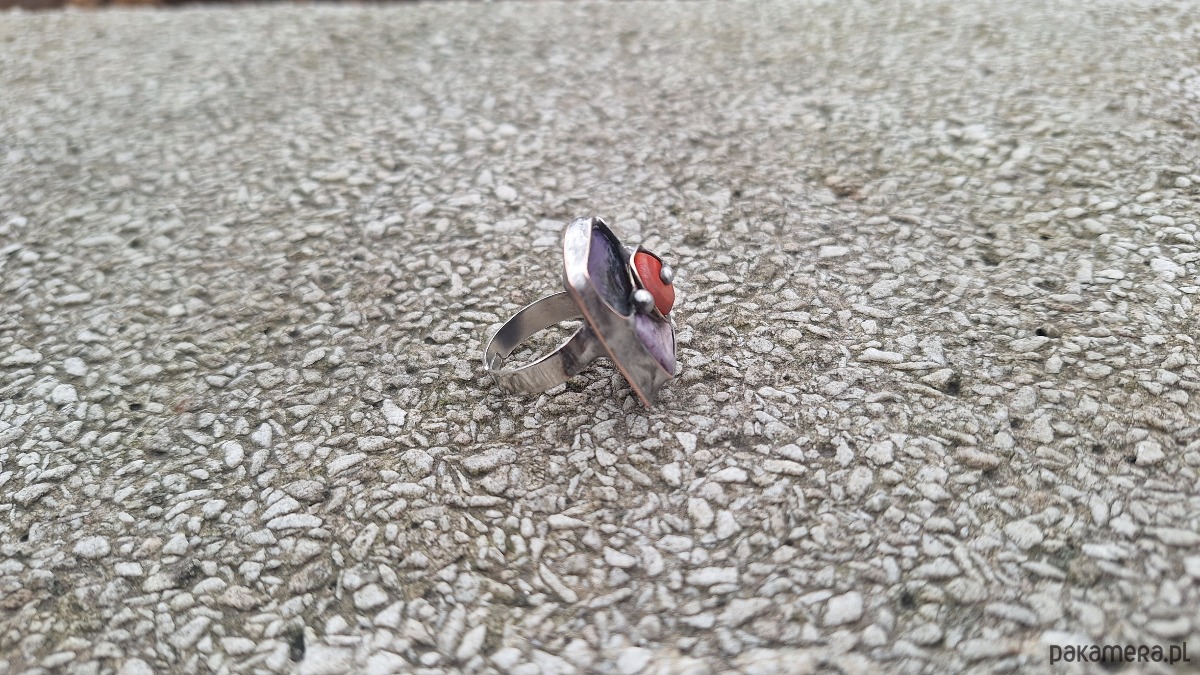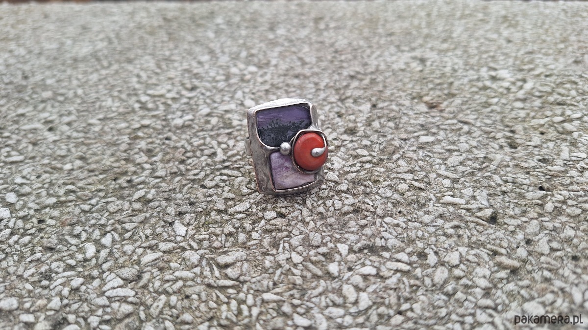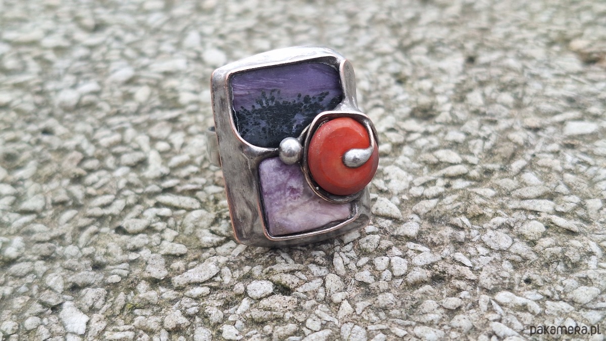Pierścionek wykonany z miedzi, cyny, koralowca i czaroitu. Wymiary ok. 2.5 na 1.8 cm. Regulowany.