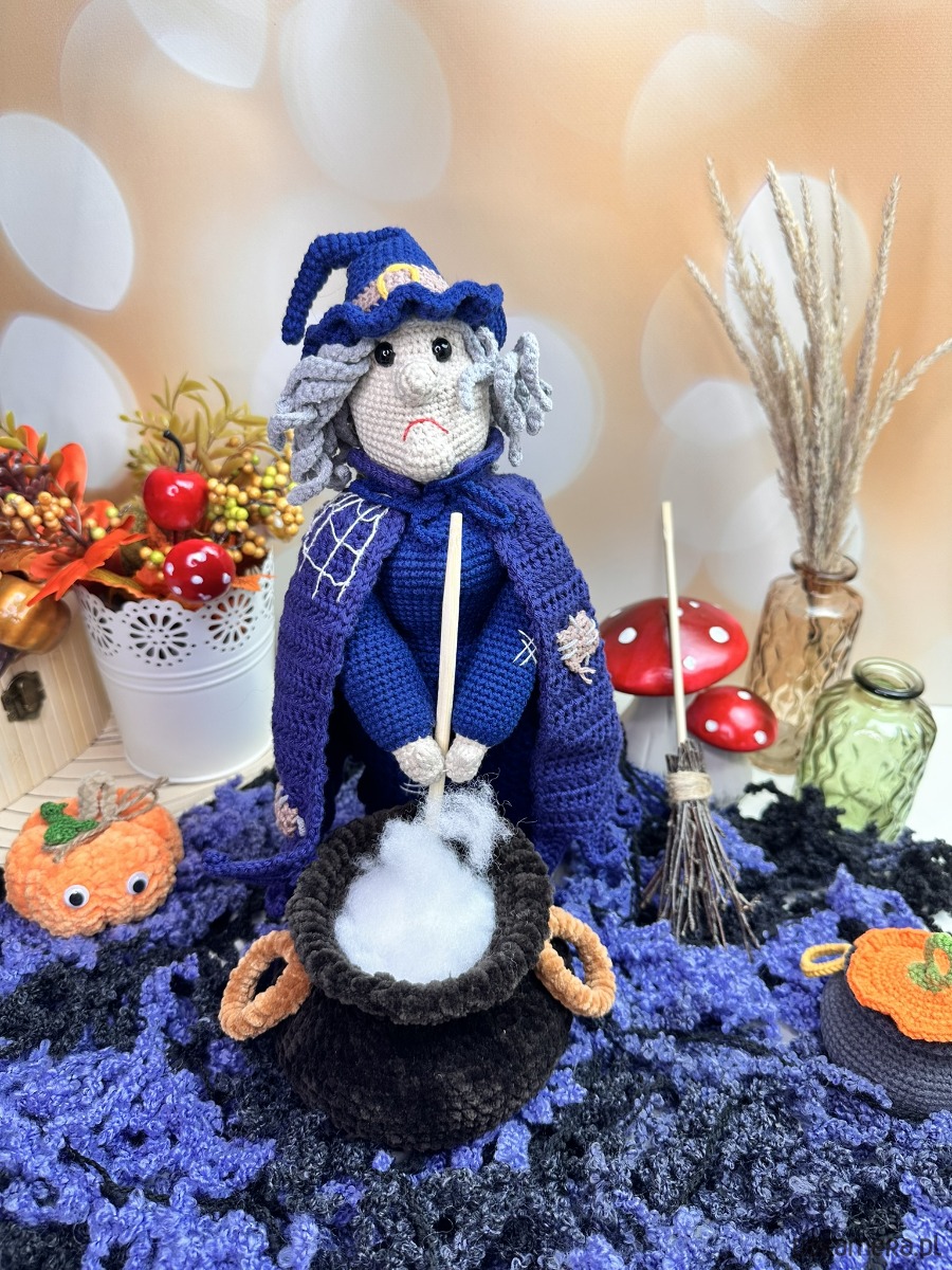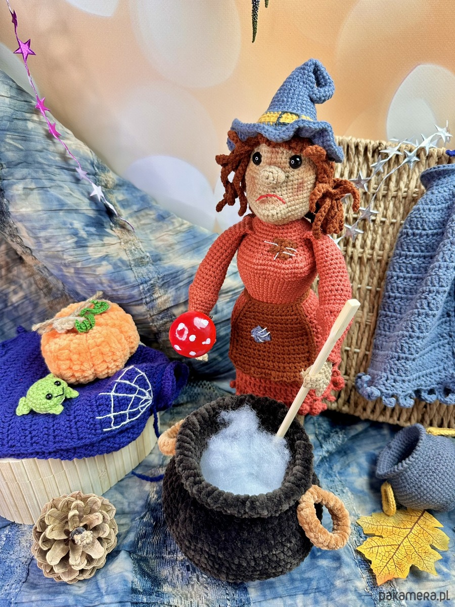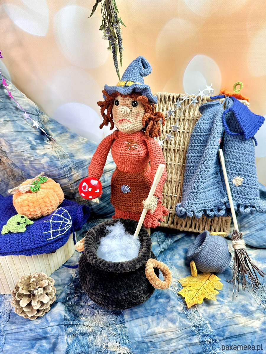 - Razem z czarownicą otrzymasz niezbędne akcesoria: plastikowy kociołek oraz małą miotłę