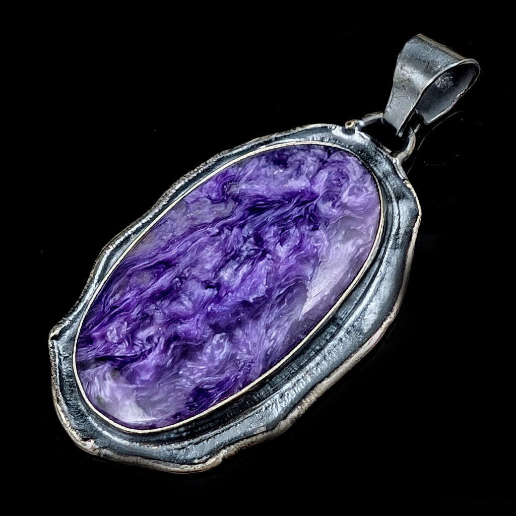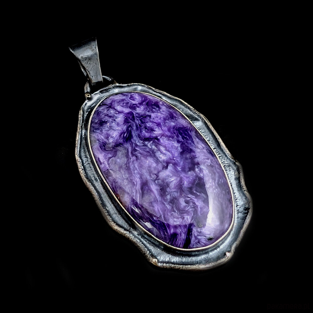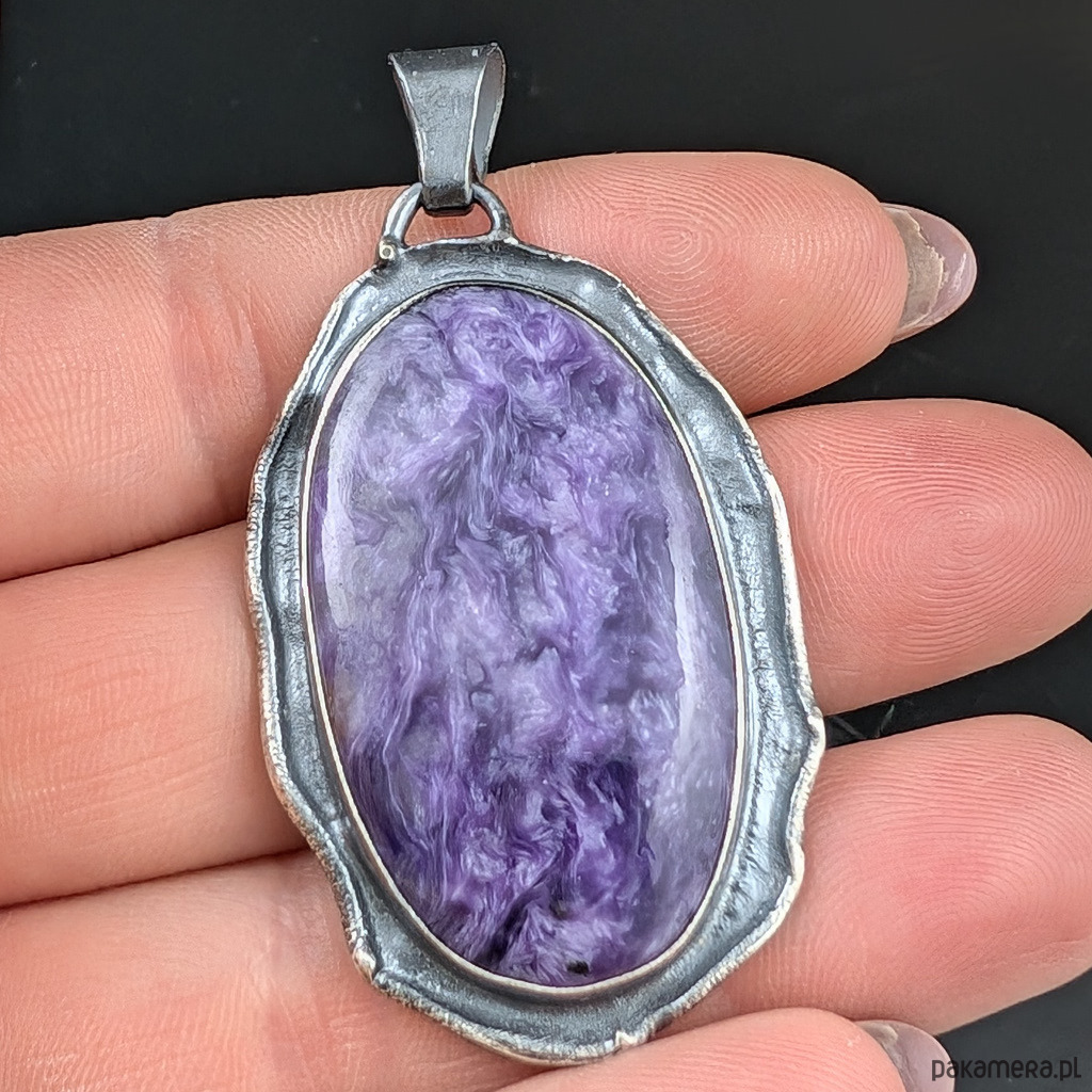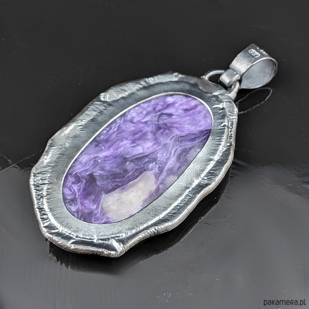 Wisior wykonany z oksydowanego srebra pr. 925 oraz czaroitu o przepięknych odcieniach fioletu. Na tafli kamienia, oprócz charakterystycznych inkluzji, można zaobserwować też poruszające się wstegi, efekt kociego oka. Wymiary oprawy 45 x 30 mm. Z krawatką 57 mm. Waga 13 gramów. Wisior zostanie zapakowany w ozdobne pudełeczko.