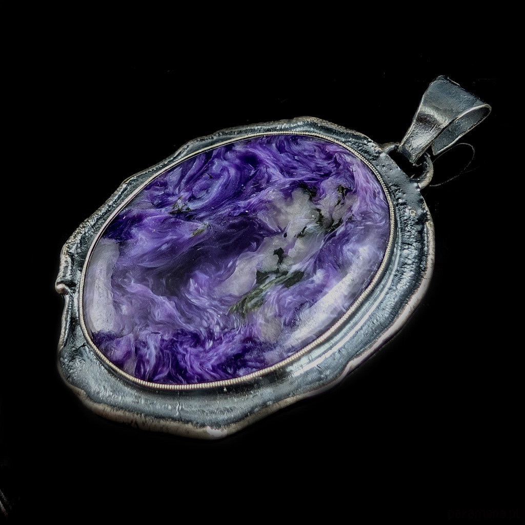 Wisior wykonany z oksydowanego srebra pr. 925 oraz czaroitu o przepięknych odcieniach fioletu. Na tafli kamienia, oprócz charakterystycznych inkluzji, można zaobserwować też poruszające się wstegi, efekt kociego oka. Wymiary oprawy 48 x 35 mm. Z krawatką 57 mm. Waga 18 gramów. Wisior zostanie zapakowany w ozdobne pudełeczko.