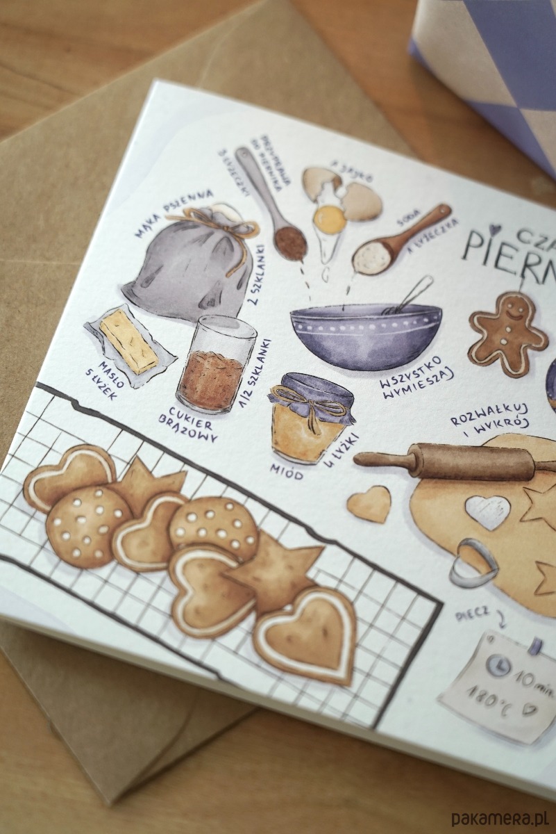 Kartka z ilustrowanym przepisem na pierniczki do podarowania bliskiej osobie lub sobie samej ;)