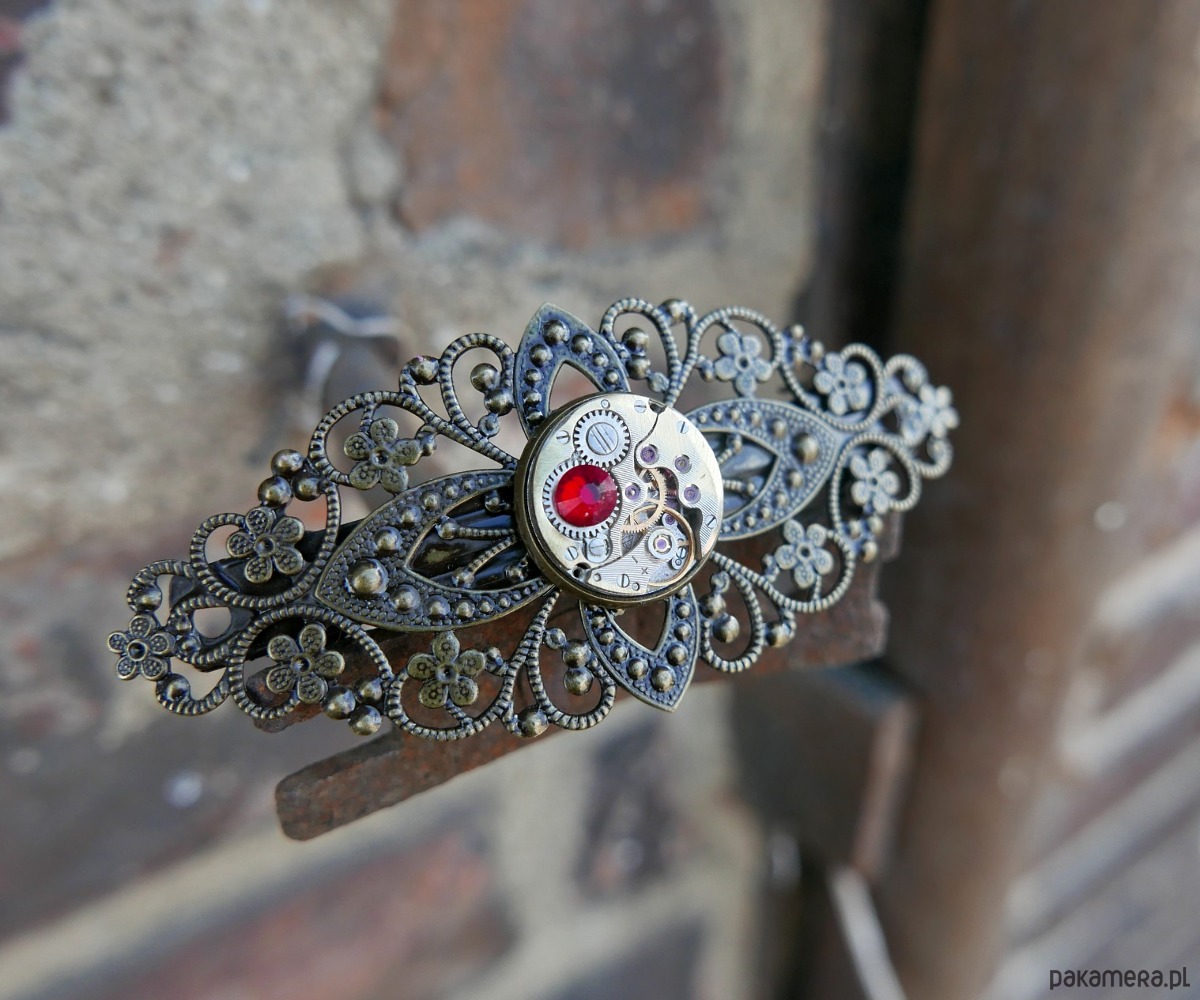 Wyjątkowa spinka do włosów łącząca subtelną koronkową formę z industrialnym charakterem stylu steampunk. Wykonana z mosiądzu o pięknym, antycznym wykończeniu, ozdobiona oryginalnym kryształkiem Swarovskiego,.