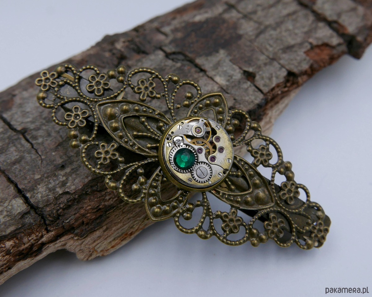Wyjątkowa spinka do włosów łącząca subtelną koronkową formę z industrialnym charakterem stylu steampunk. Wykonana z mosiądzu o pięknym, antycznym wykończeniu, ozdobiona oryginalnym kryształkiem Swarovskiego,.