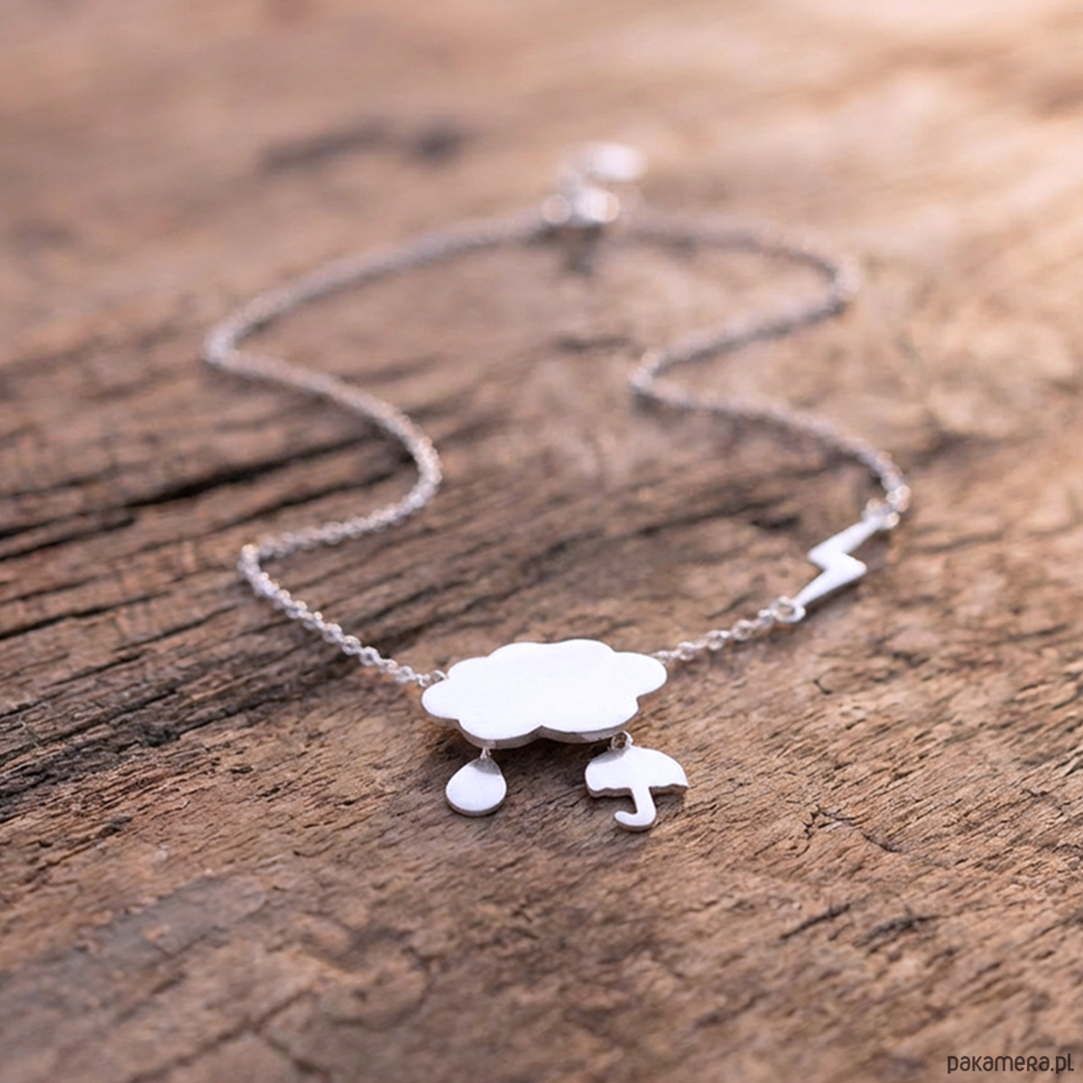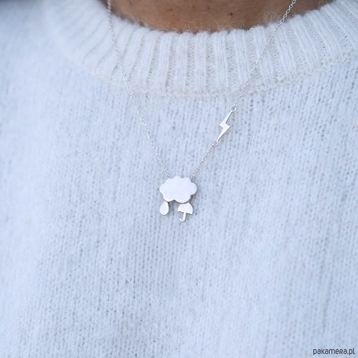 Delikatna zawieszka w formie czterech symboli – chmurki, kropli deszczu, parasolki i błyskawicy – tworzy lekką, kobiecą kompozycję, idealną dla osób wrażliwych na magię drobnych momentów.