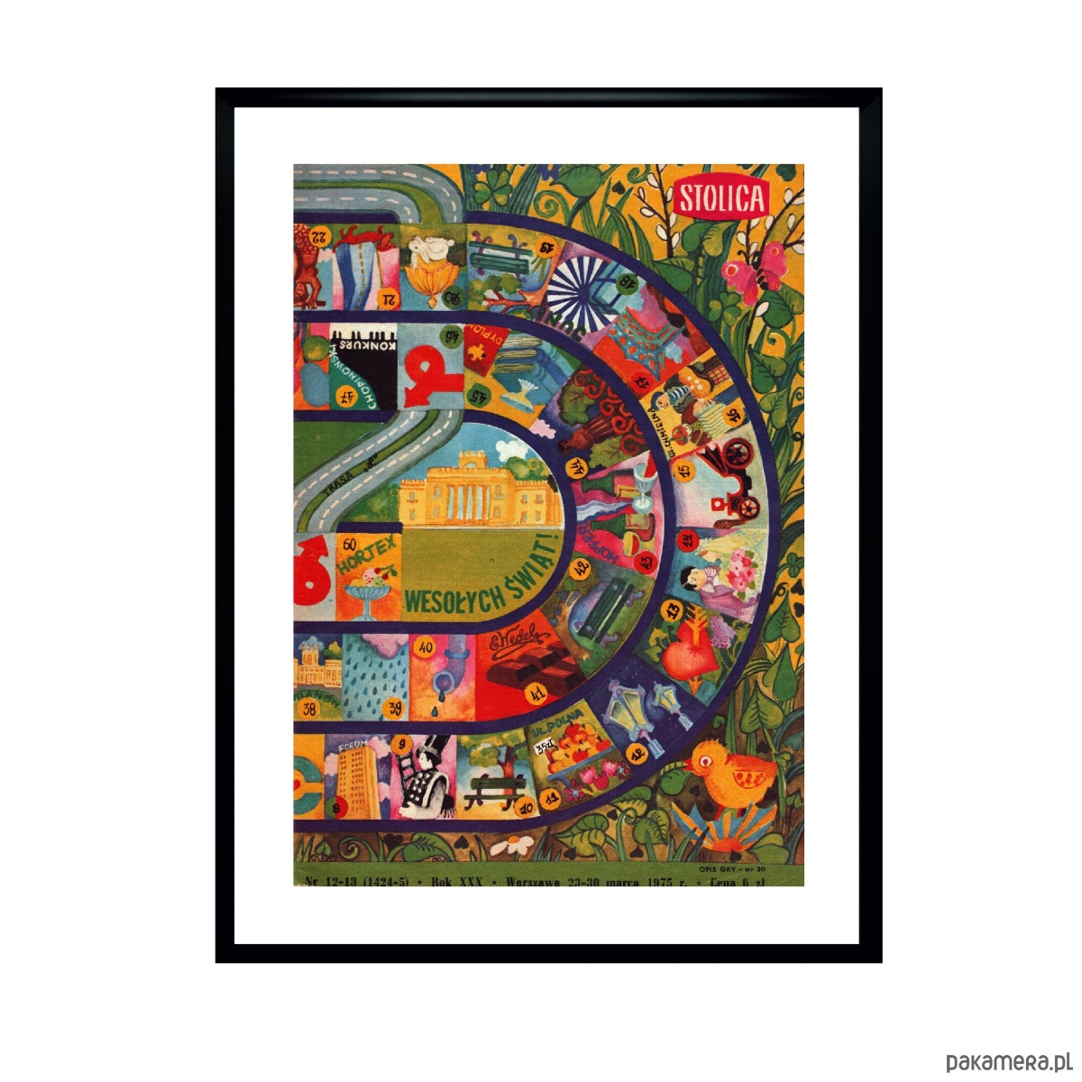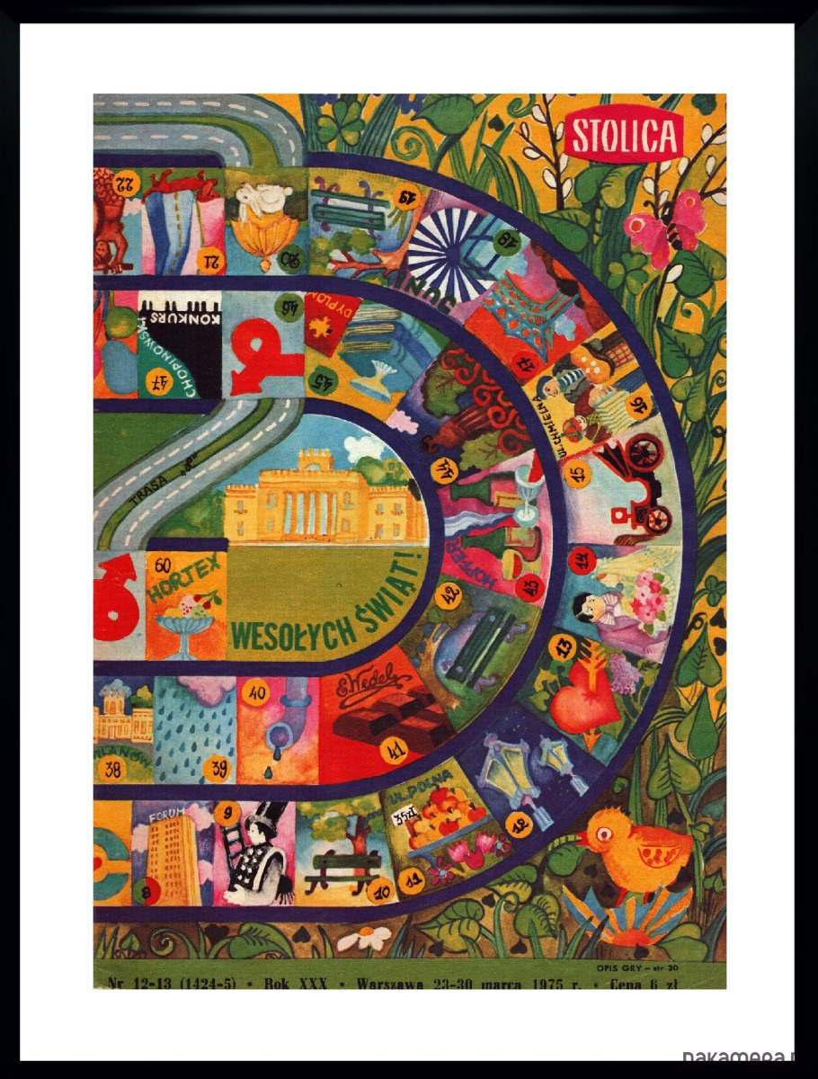 Wyjątkowa, pełna detali okładka magazynu „Stolica” z 1975 r., przedstawiająca barwną, spiralną kompozycję przypominającą planszę gry. Dynamiczny układ prowadzi wzrok przez ilustracyjne sceny z życia codziennego, motywy miejskie oraz elementy kultury wizualnej epoki PRL. W centrum kompozycji znajduje się architektura Pałac na Wyspie w Łazienkach Królewskich, otoczona hasłem „Wesołych Świąt”, co nadaje całości nostalgiczny, świąteczny charakter.