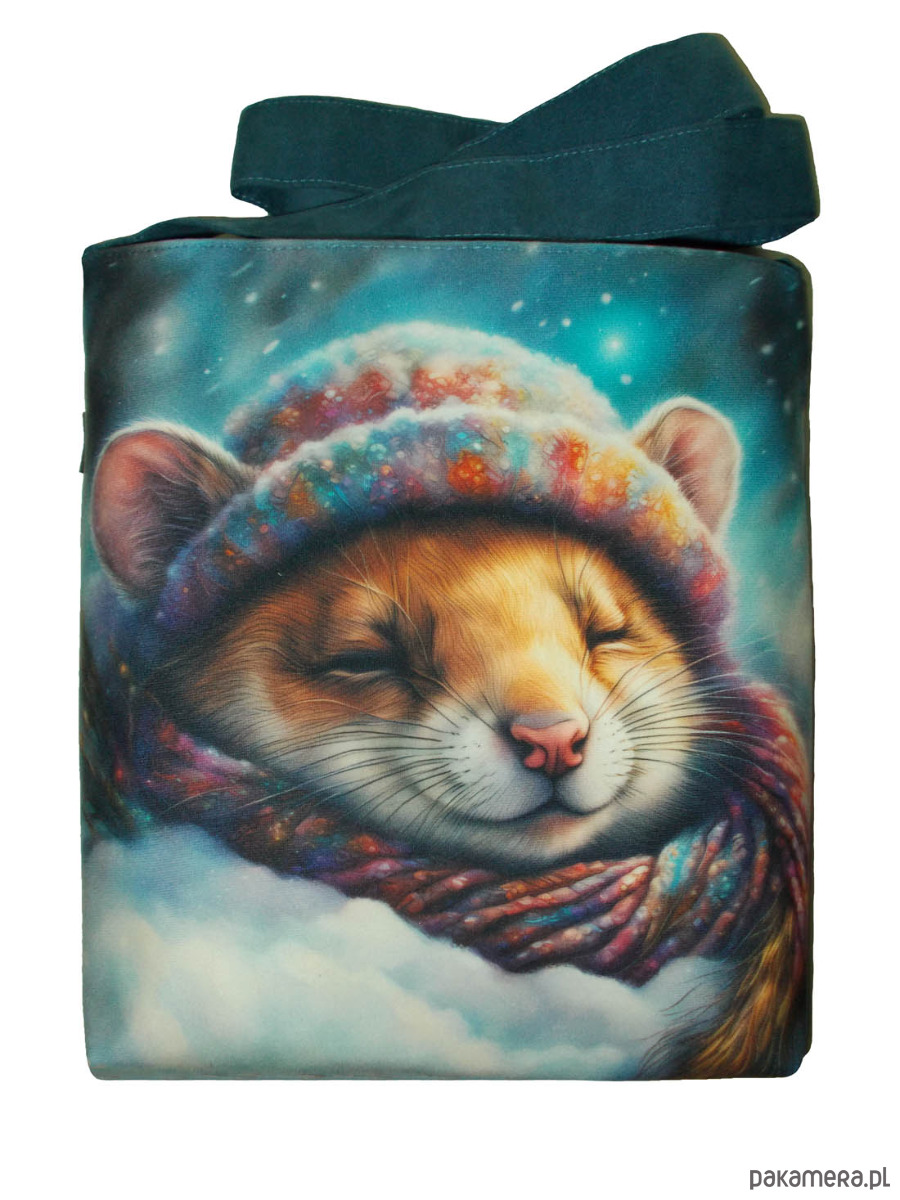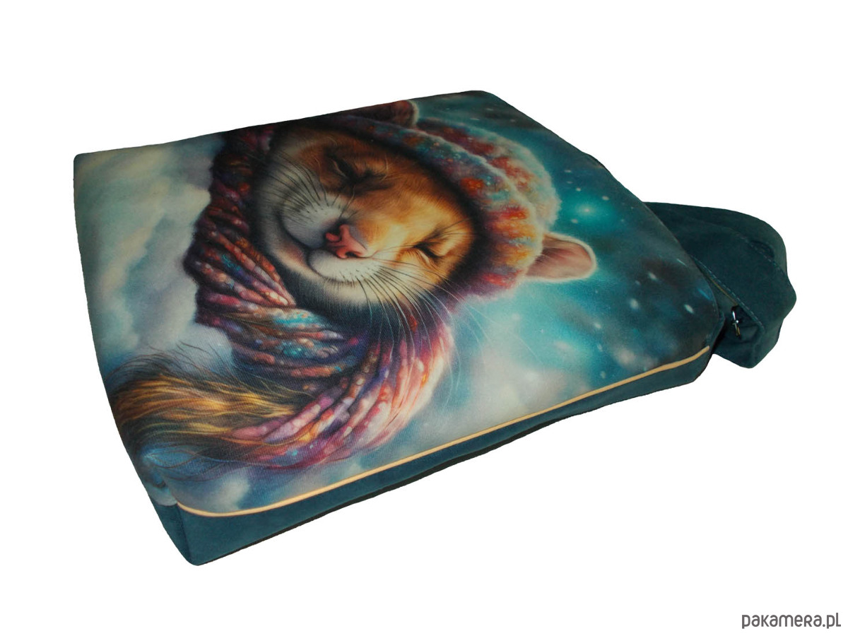 Autorska torba z usztywnionego eko zamszu, zapinana na zamek. Przód z weluru tapicerskiego. Pasek regulowany. Tył w korze paska (niebieski) Torba trzyma fason. Wewnątrz dwie kieszenie - jedna na zamek, druga z miejscem na telefon i coś jeszcze. W szwach wypustka. Denko poszerzone. szerokość 32cm wysokość 30cm plus denko 8cm