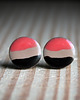 Ceramiczne kolczyki w formie sztyftów, ręcznie wykonane z delikatnej gliny kamionkowej, jednostronnie szkliwione mieszanką brązowych i różowych szkliw z efektem plamek, na antyalergicznych sztyftach w kolorze srebrnym. Średnica ok. 9mm.Polecam