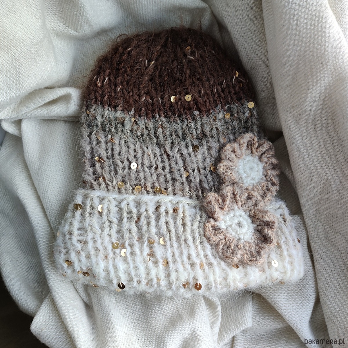 Czekoladowo beżowa czapka cekiny kwiaty z alpaki i moheruCHOCO