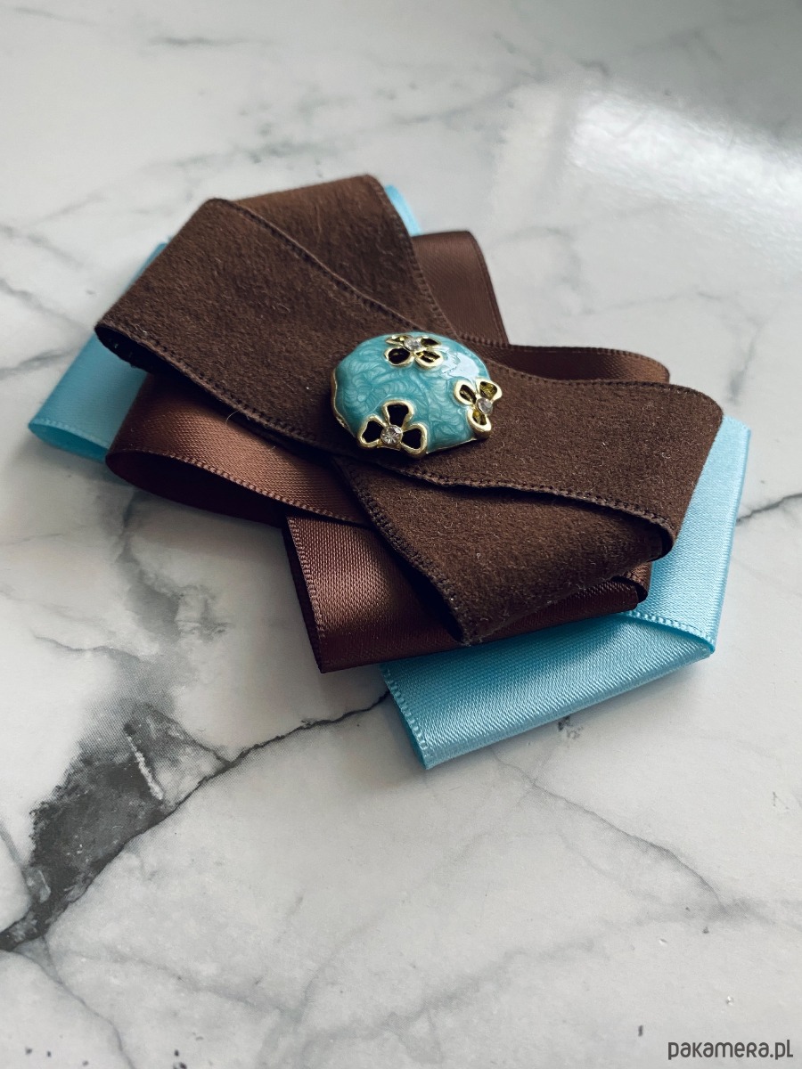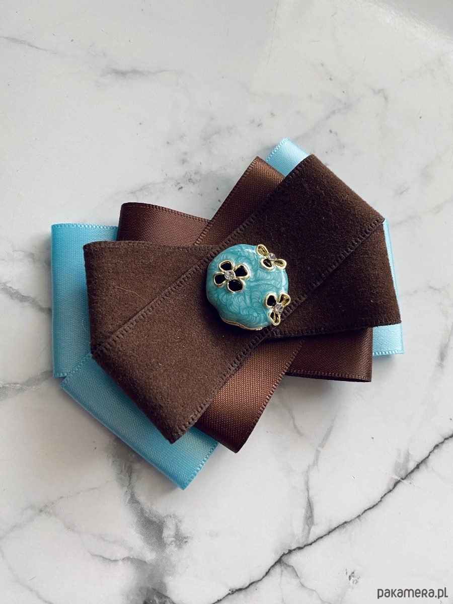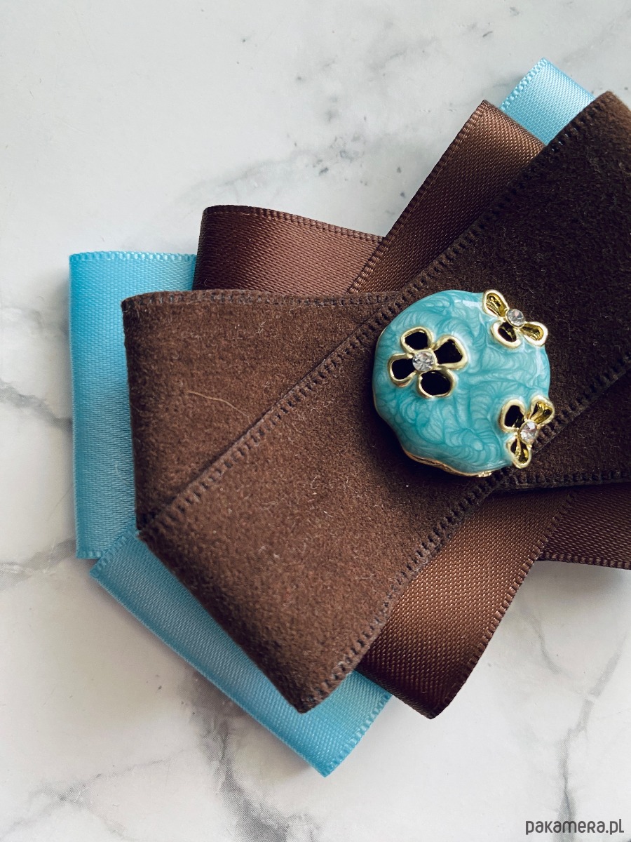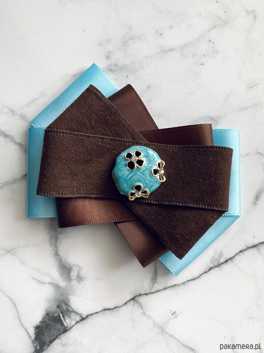 Broszka w kolorach czekoladowego brązu i błękitu.