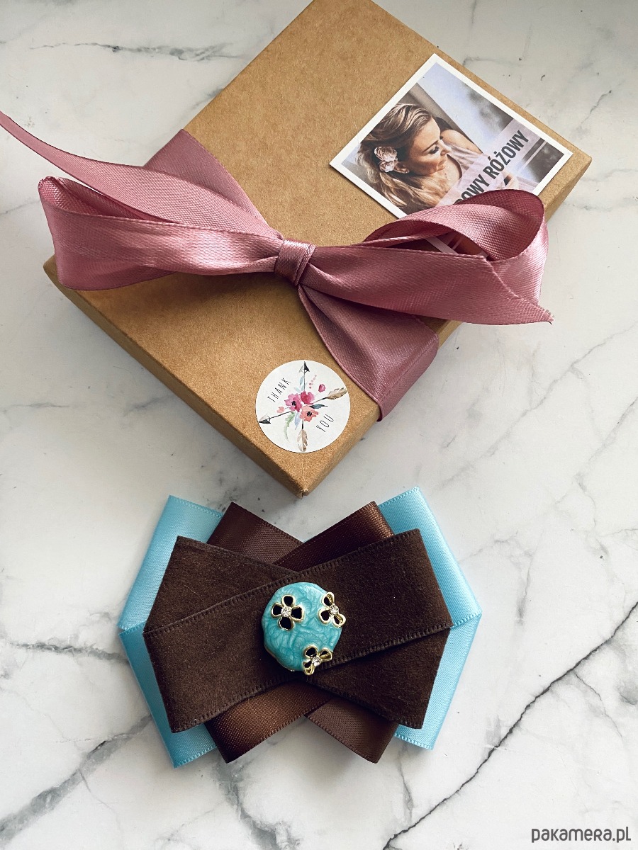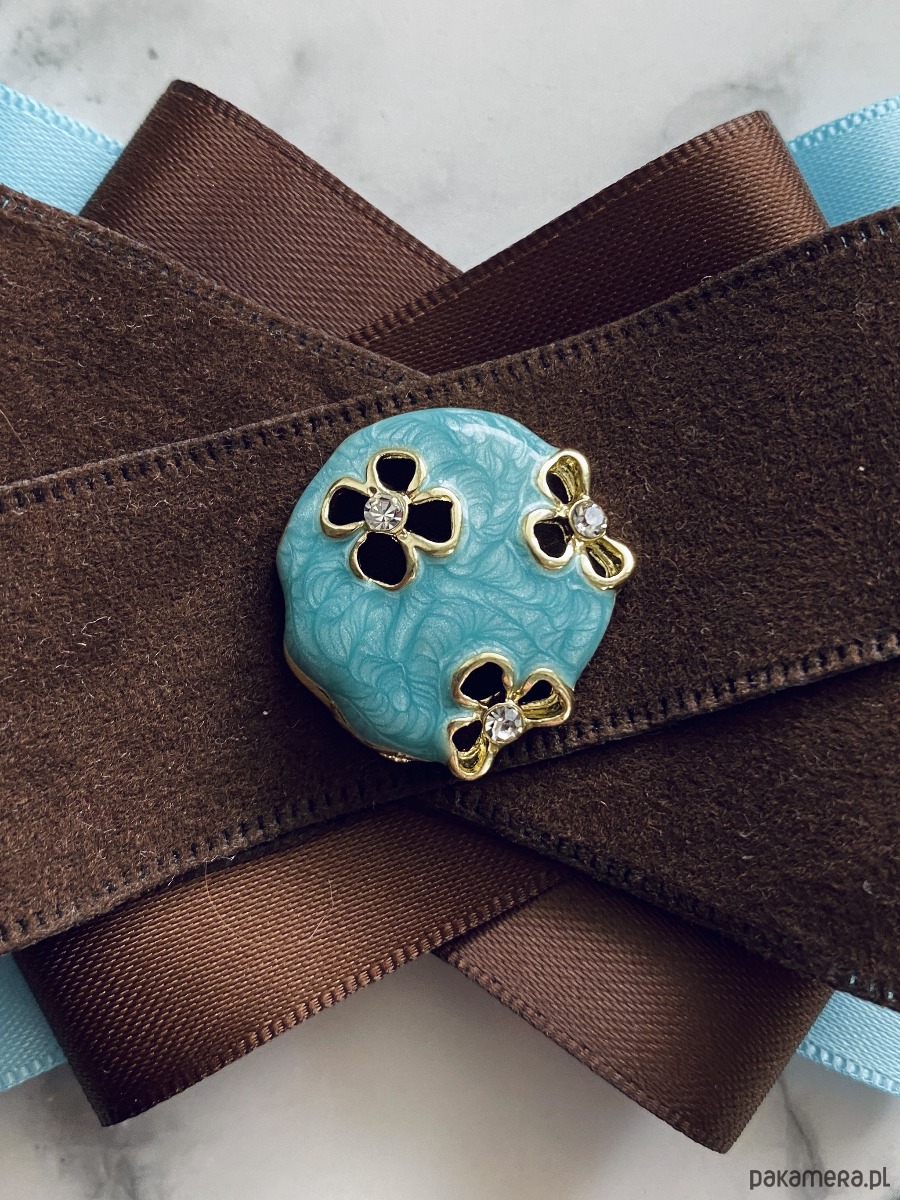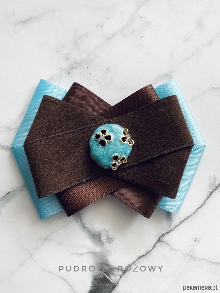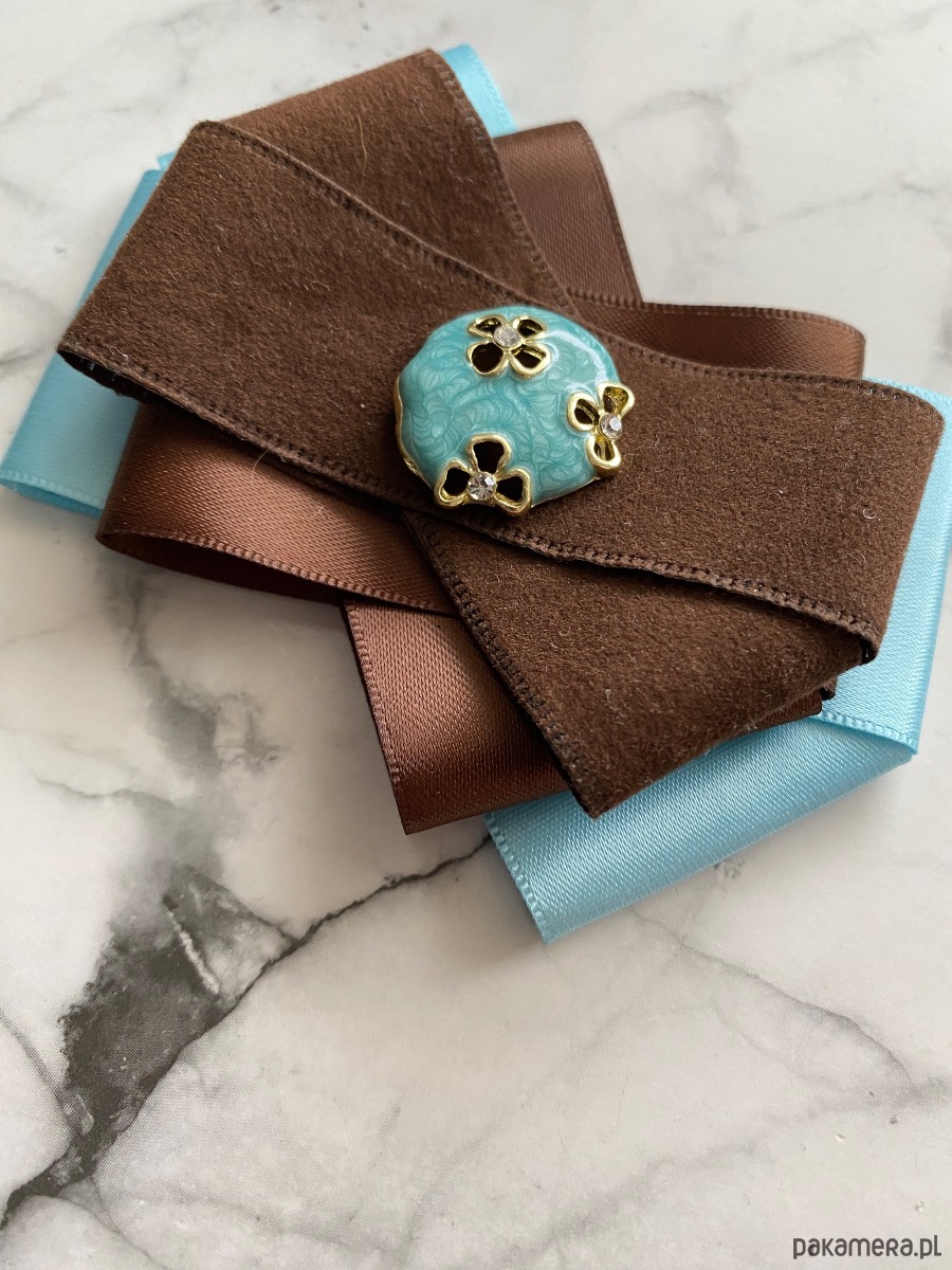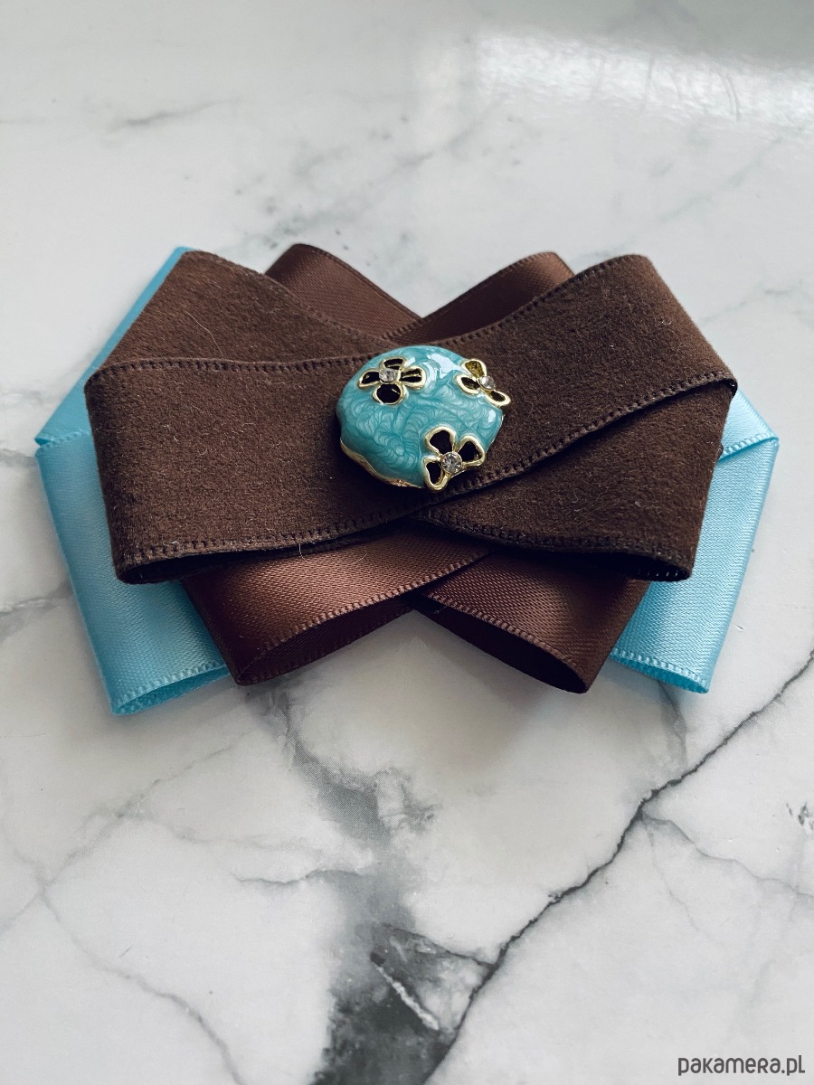 Broszka w kolorach czekoladowego brązu i błękitu.