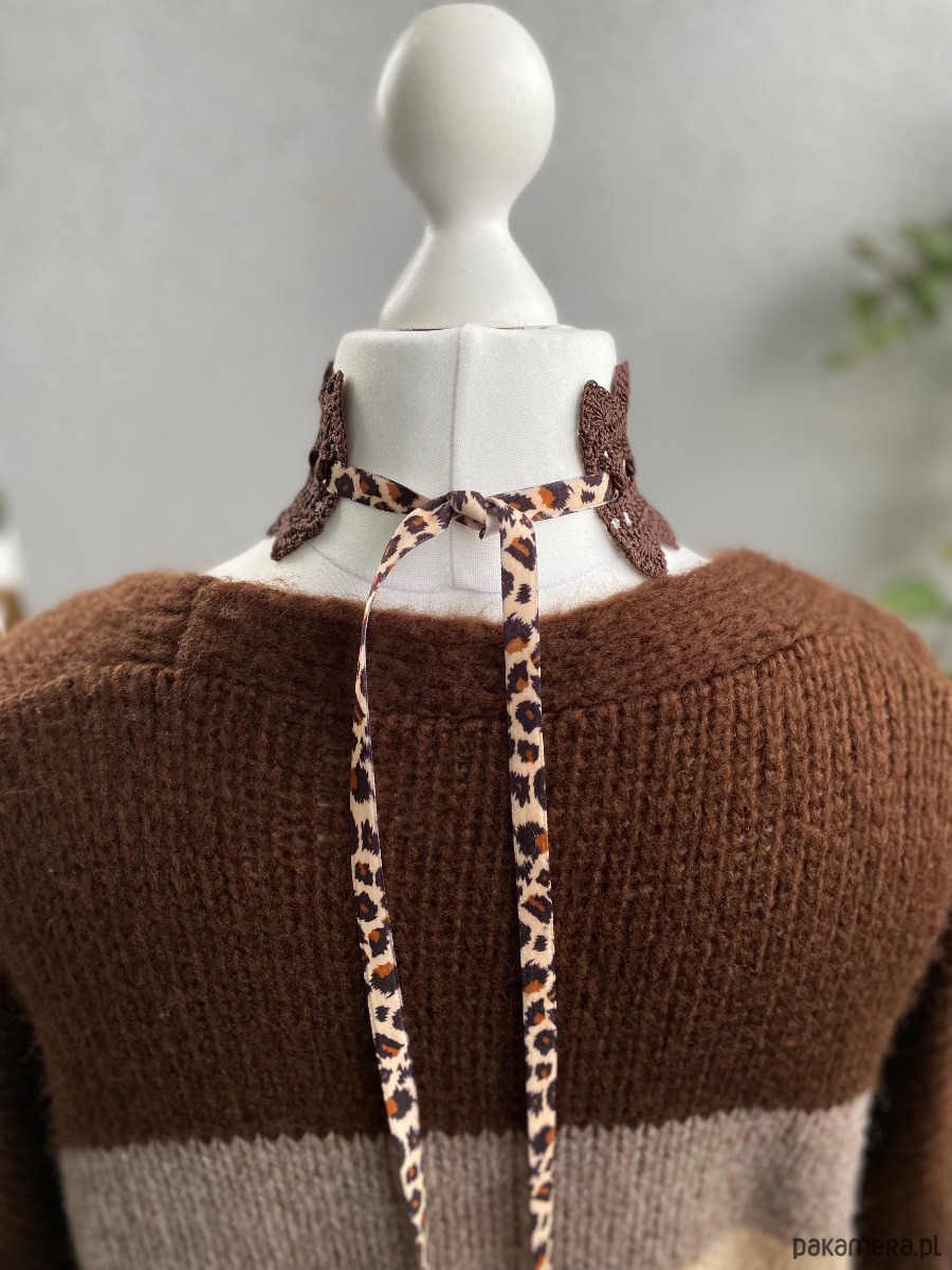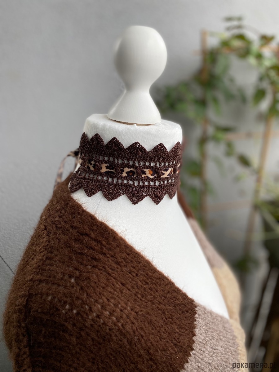 Naszyjnik choker koronkowy przeplatany alsamitną wstążeczką krówką/panterką brązowy❣️Skromny ale z pazurem‼️💪🏻