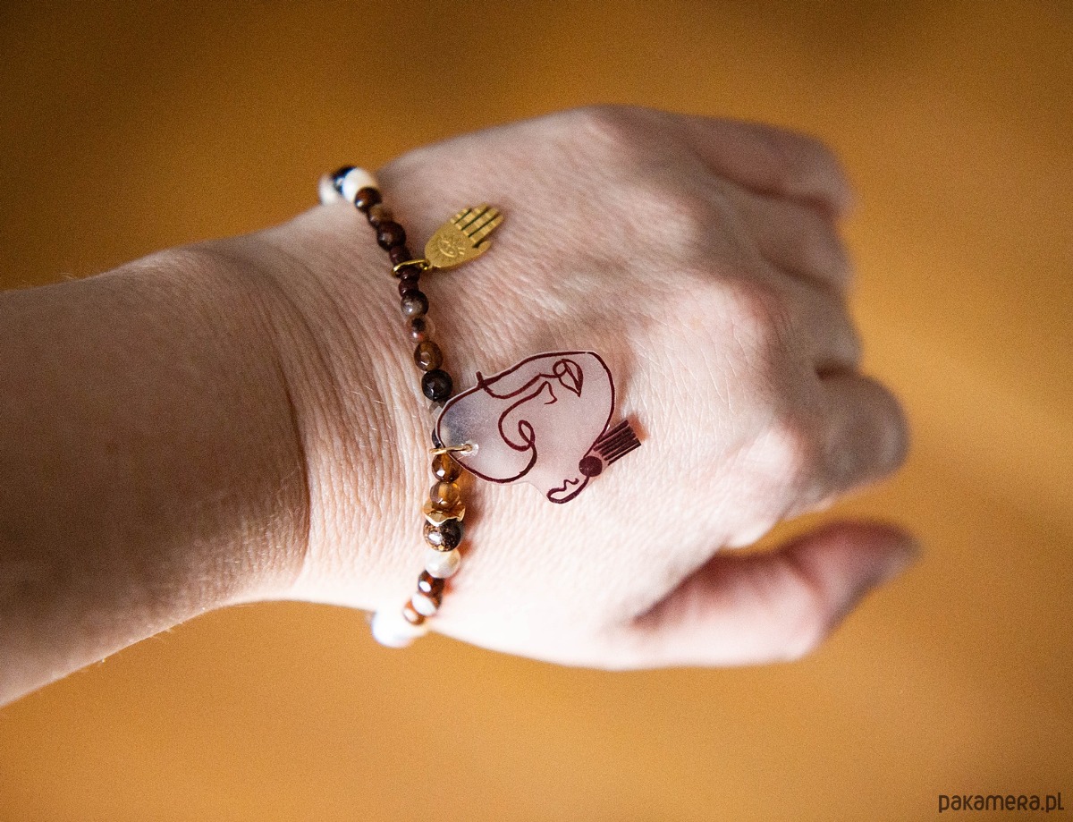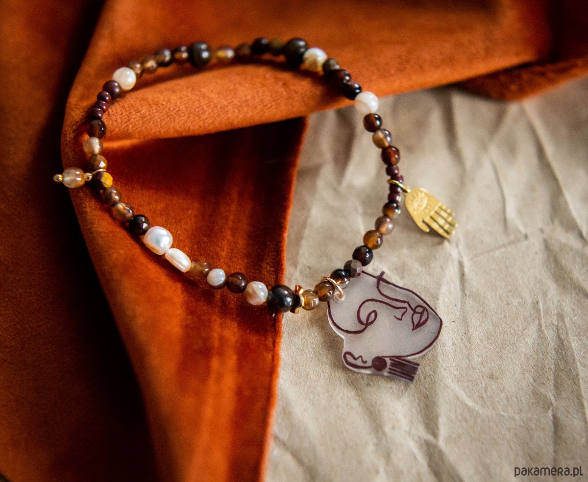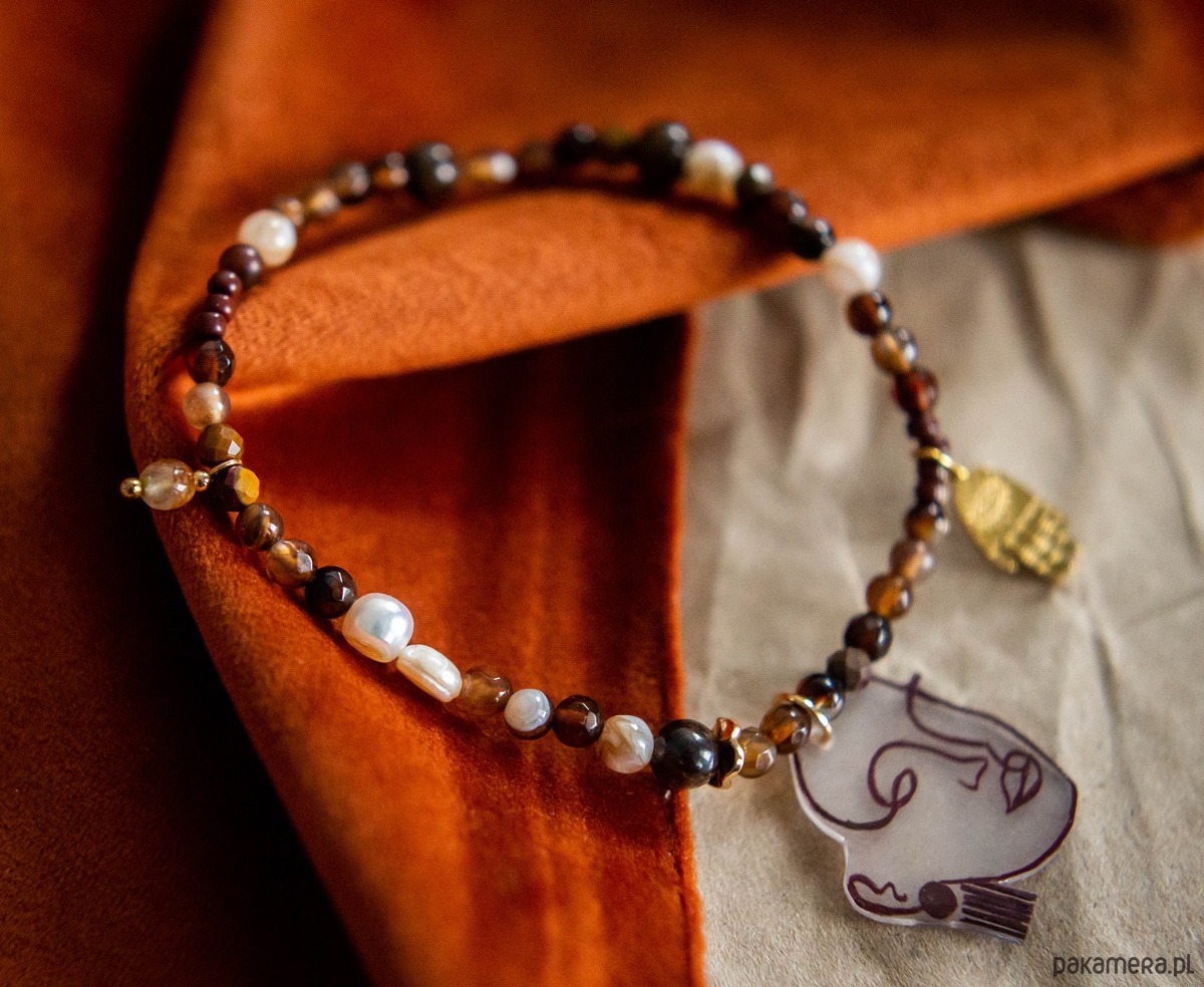 Bransoletka w kolorze czekolady wykonana z naturalnych kamieni, ozdobiona stylową zawieszką w kształcie twarzy.