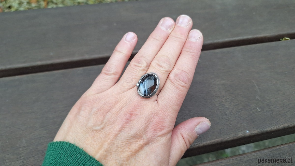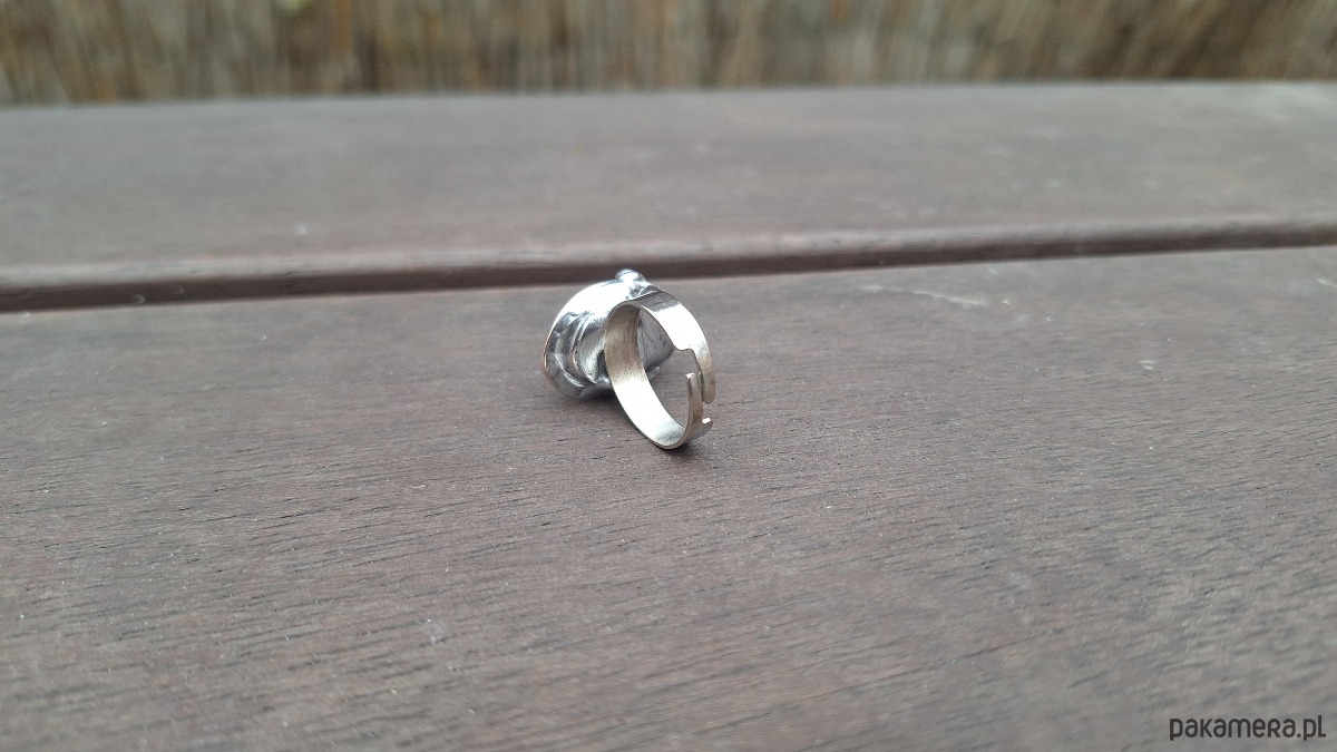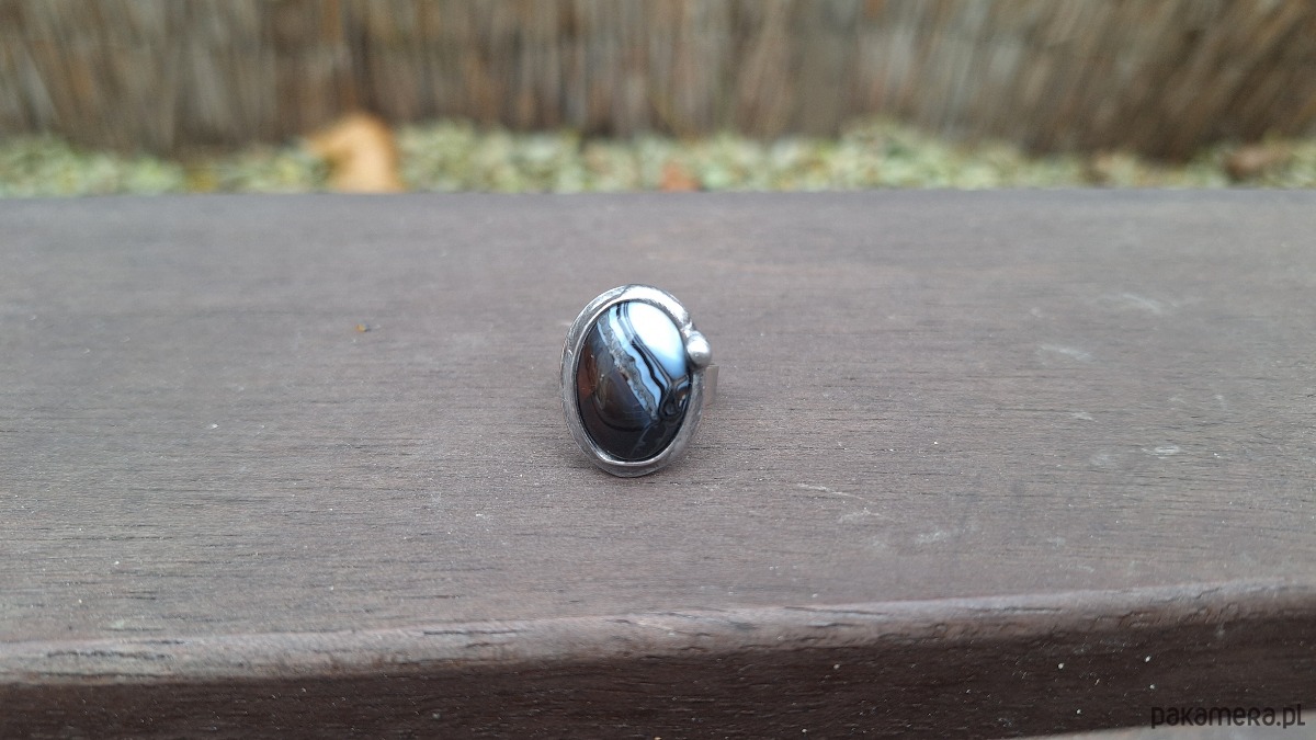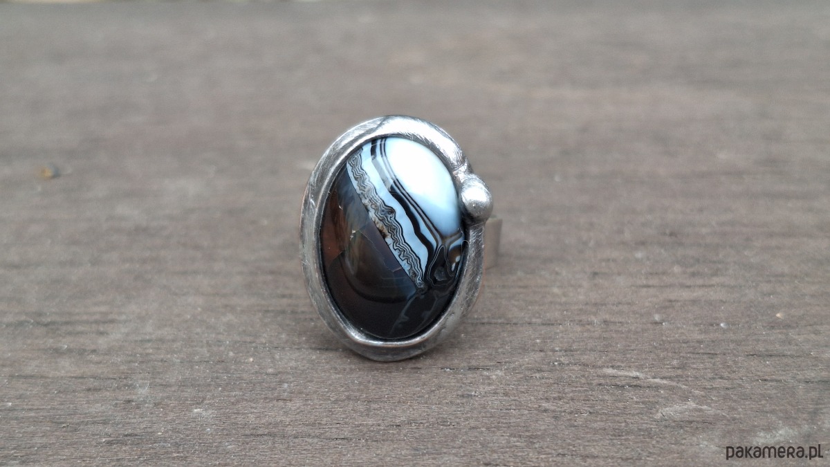 Pierścionek wykonany z miedzi, cyny i agatu. Wymiary ok. 2 na 1.5 cm. Regulowany. Nie jest ciężki.