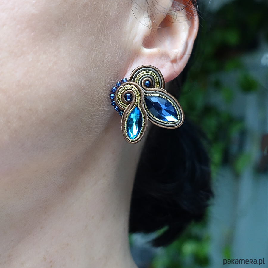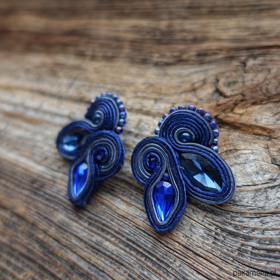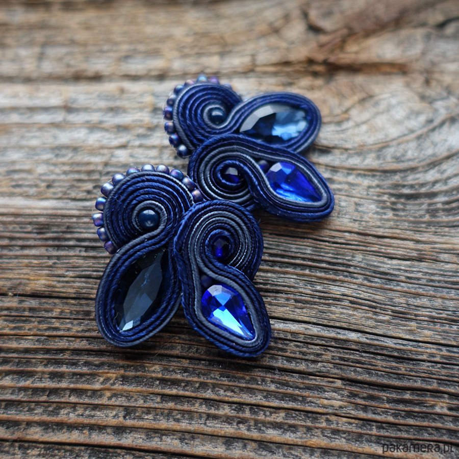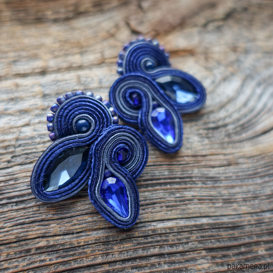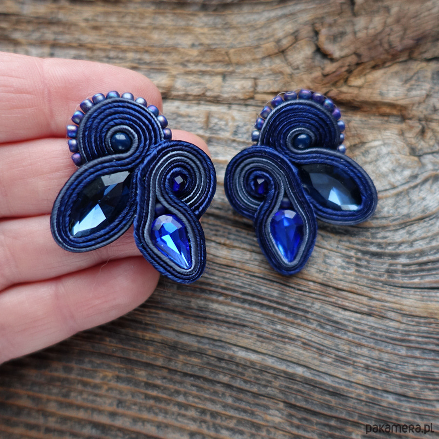 Kolczyki wykonane w technice haftu soutache w głębokim, granatowym odcieniu z subtelnym połyskiem. Elegancka forma i szlachetna kolorystyka sprawiają, że są wyrazistym, ale ponadczasowym dodatkiem. Fasetowane kryształki pięknie odbijają światło, dodając biżuterii wyjątkowej głębi i klasy.