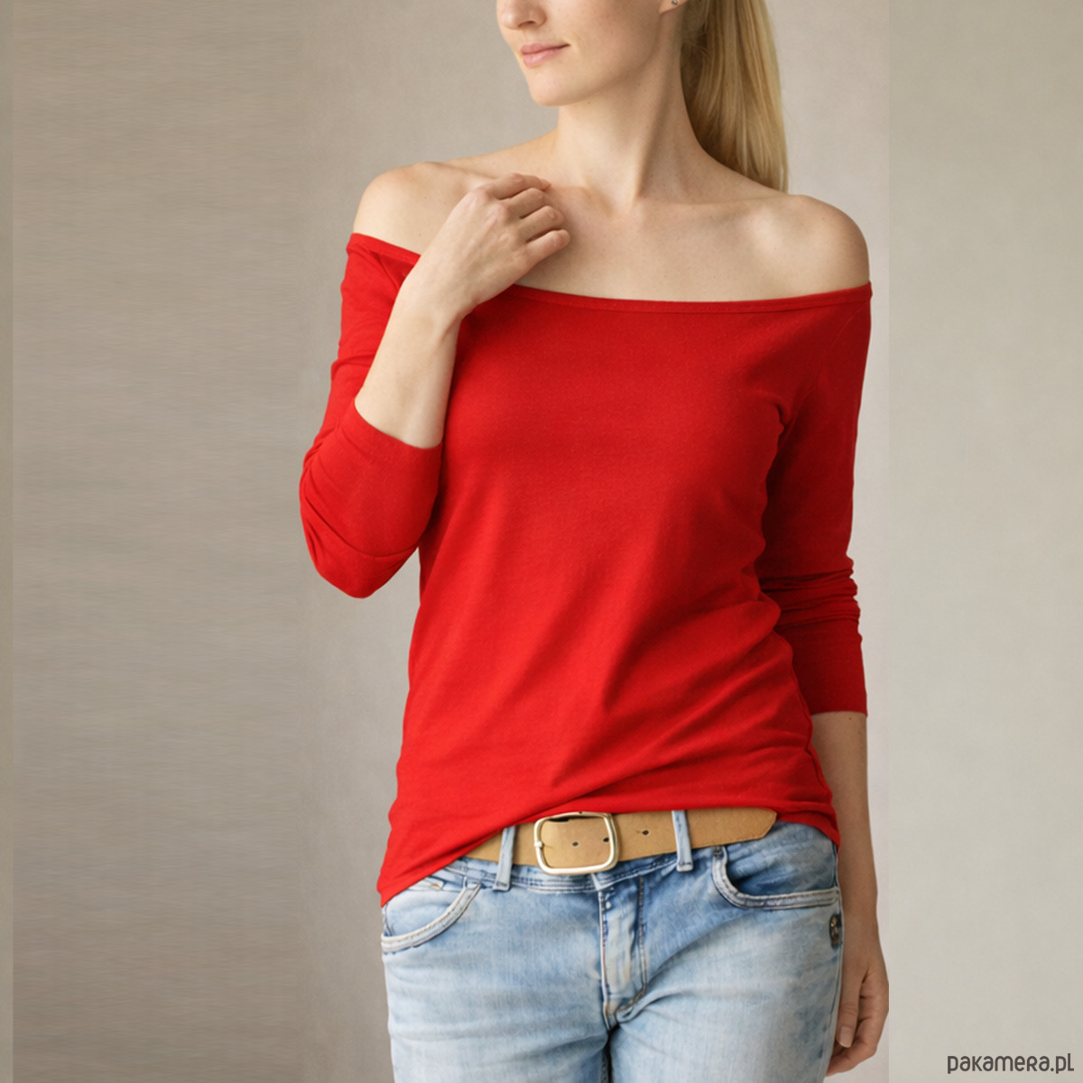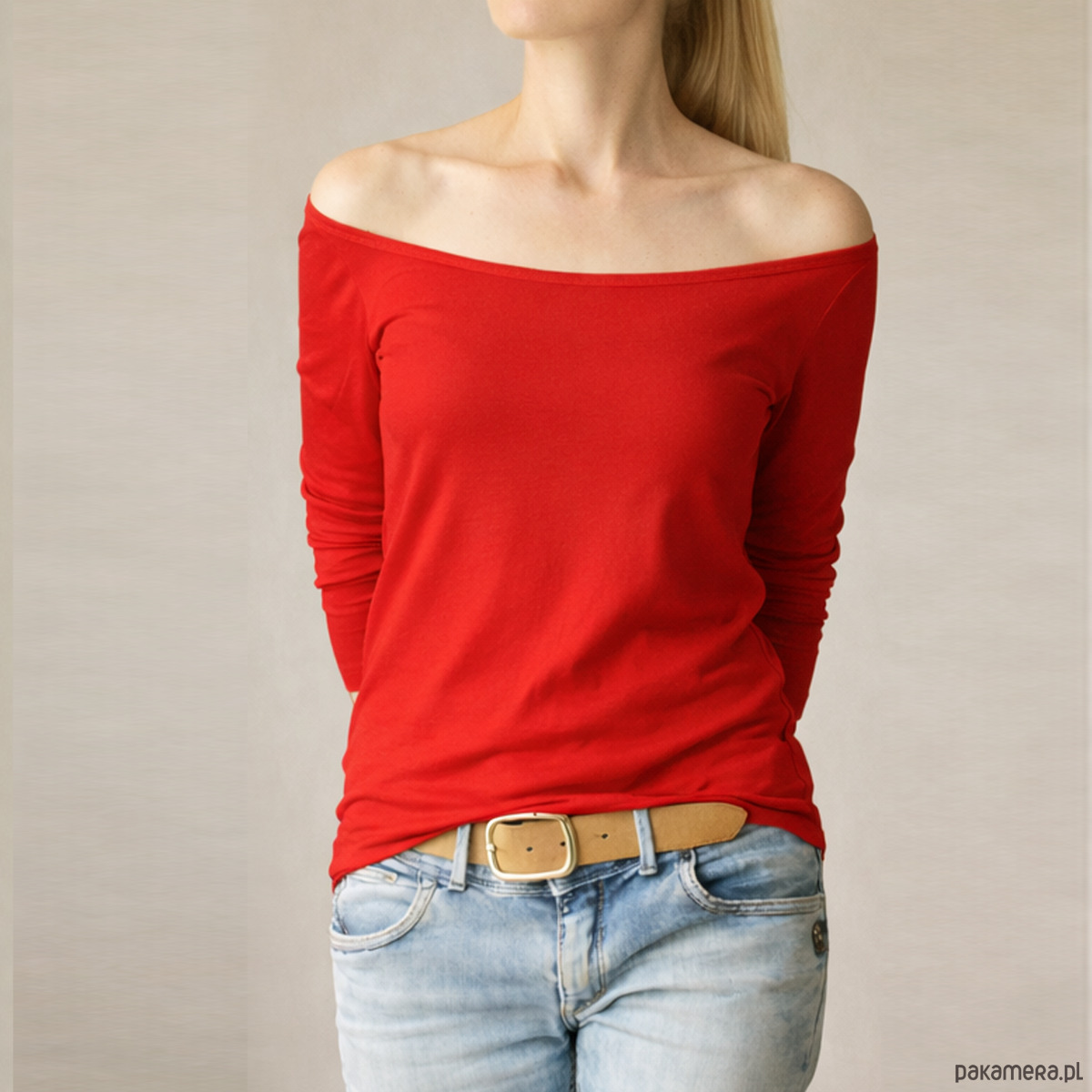 Czerwona dopasowana długi rękaw szeroki dekolt