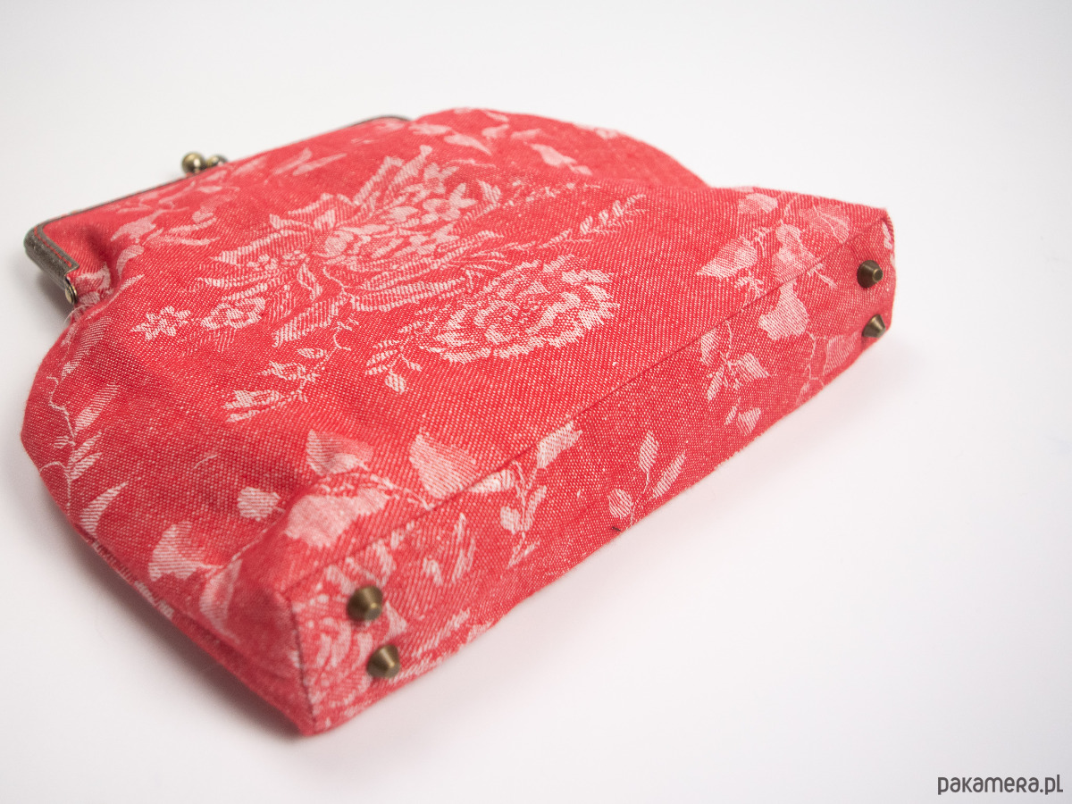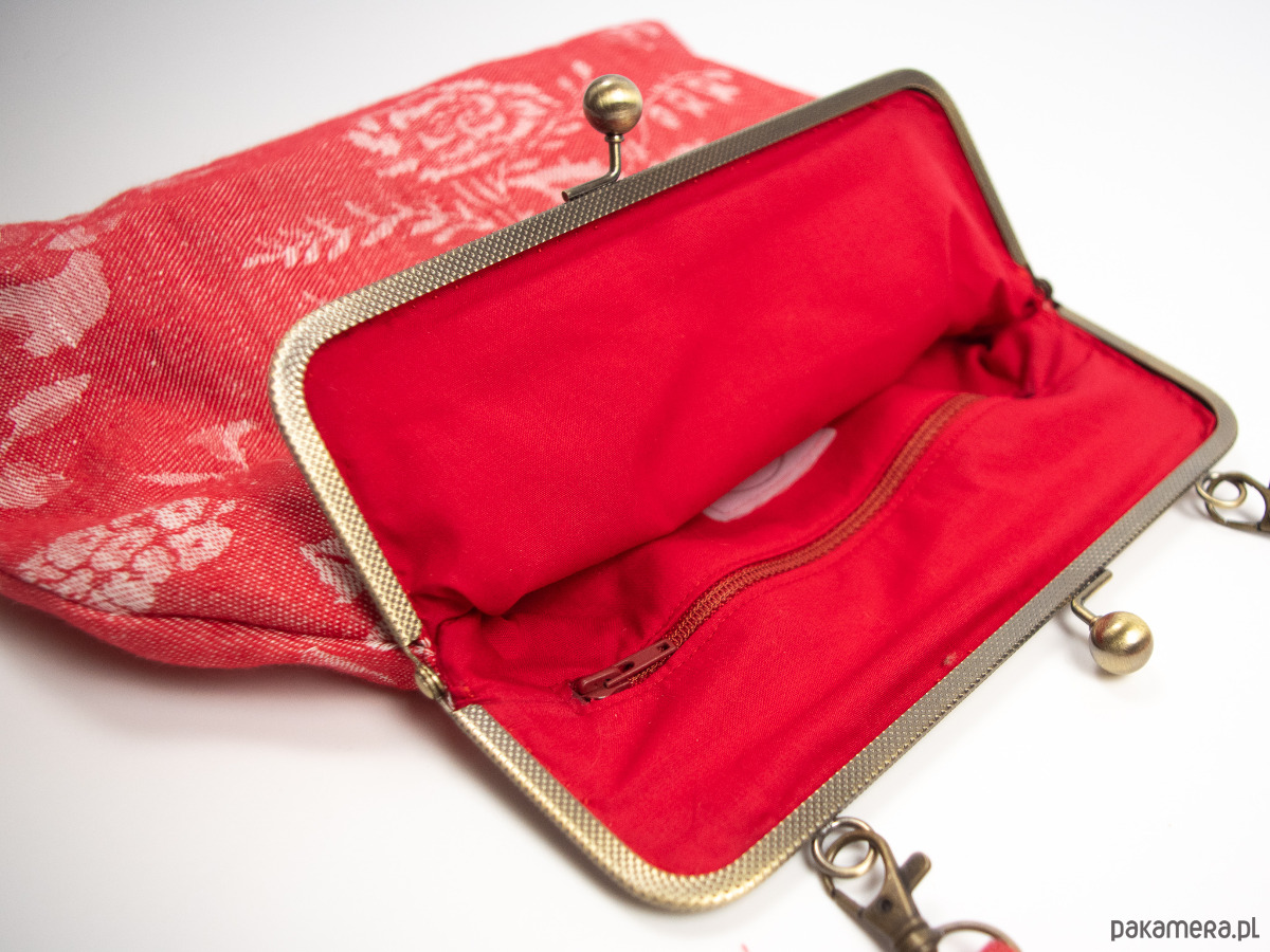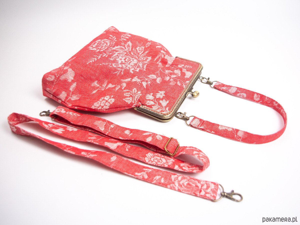 Torebka w kolorze czerwonym w jasny, kwiatowy wzór, na podszewce bawełnianej (czerwonej). W środku pojemna kieszonka na suwak. Zapięcie jest wszyte ręcznie (nie ma niebezpieczeństwa, że się odczepi od tkaniny). Zapięcie oraz nóżki wykonane z metalu w kolorze starego mosiądzu. Pasek można odczepić lub wymienić.