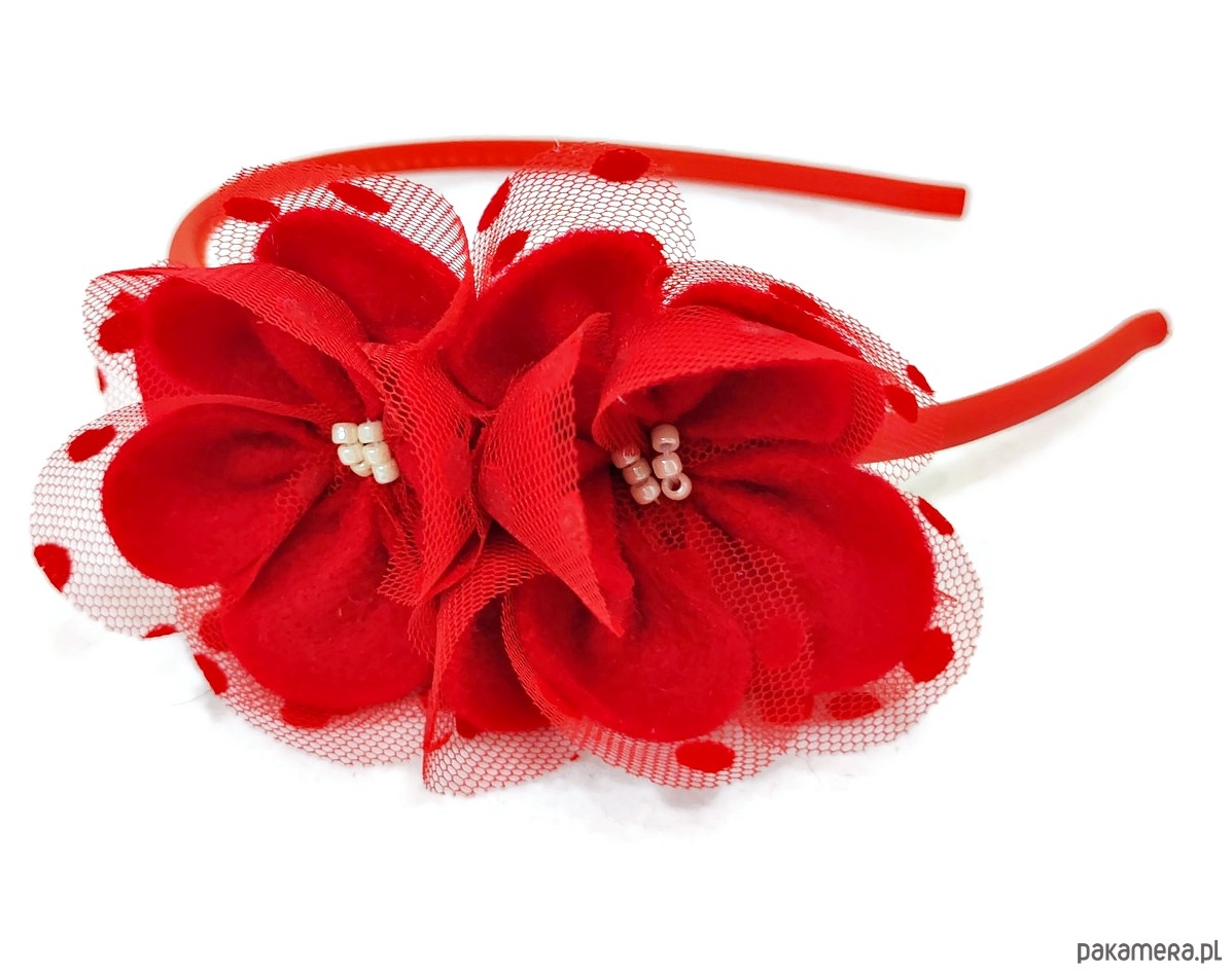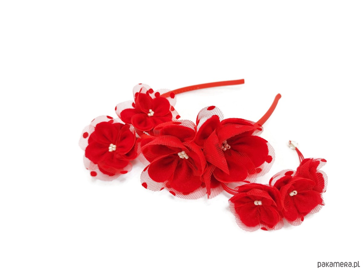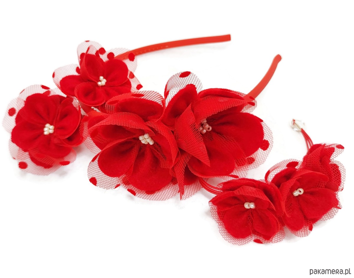 Zestaw z kwiatuszkami wykonanymi z filcu i tiulu, opaska, bransoletka i 2 spineczki