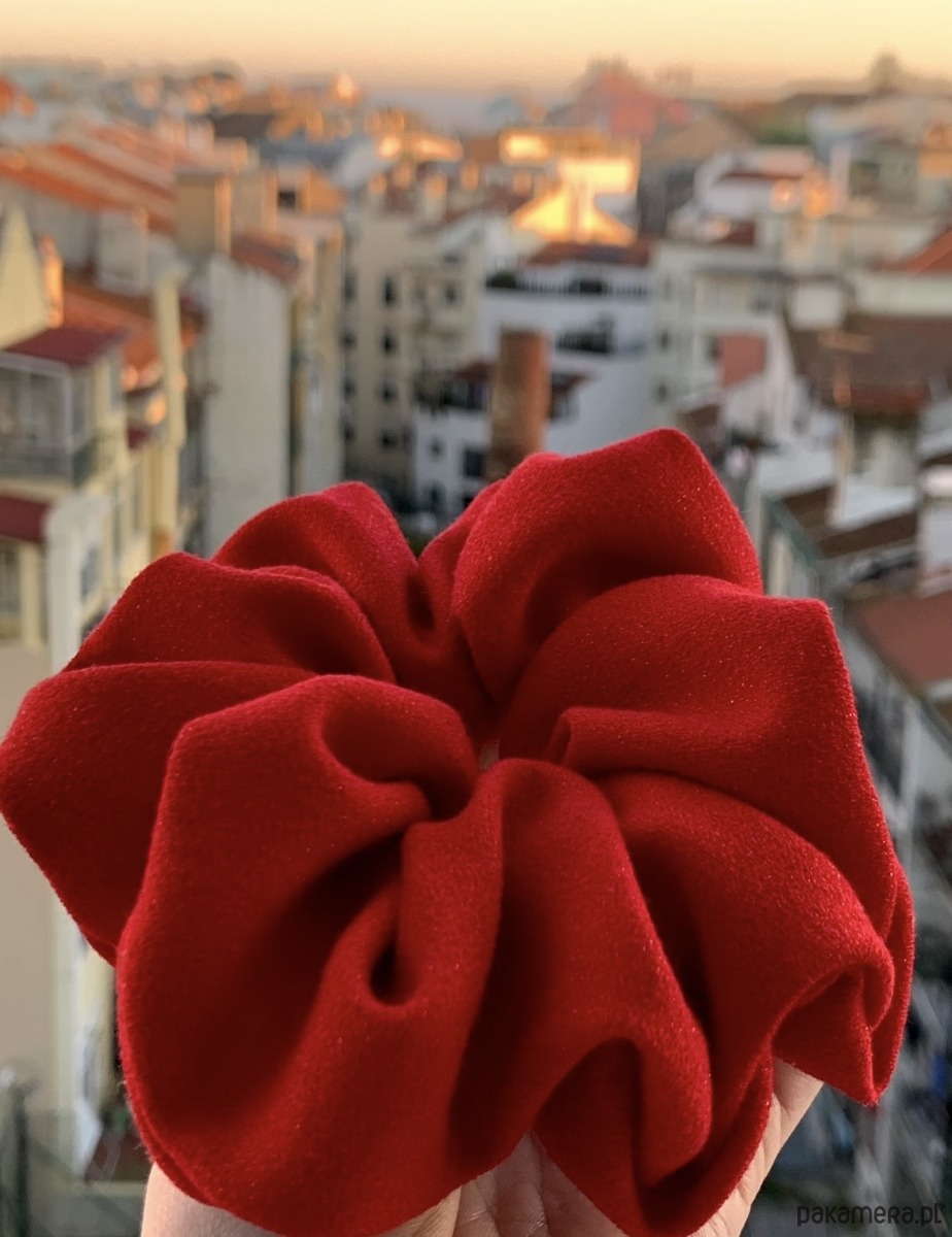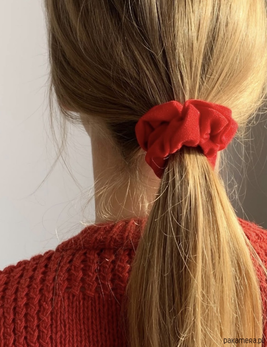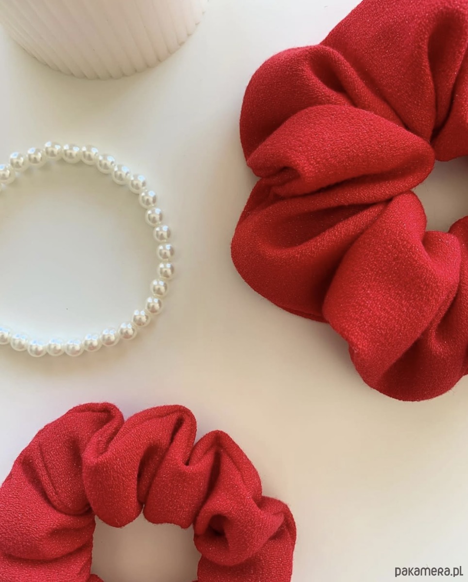 Scrunchie Juicy Red to gumka do włosów w soczystym odcieniu czerwieni, uszyta z materiału o delikatnie mieniących się drobinkach, które przy ruchu światła tworzą subtelny, elegancki blask. To idealny dodatek, gdy chcesz dodać stylizacji charakteru.