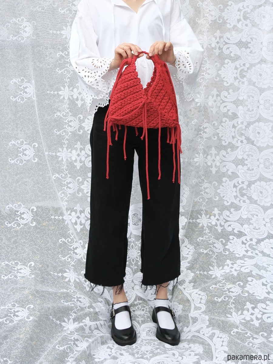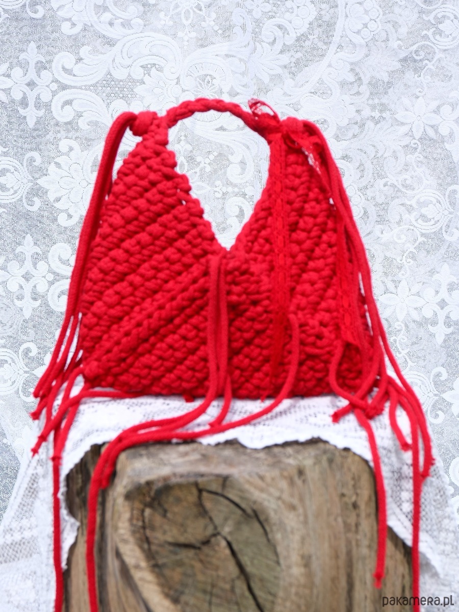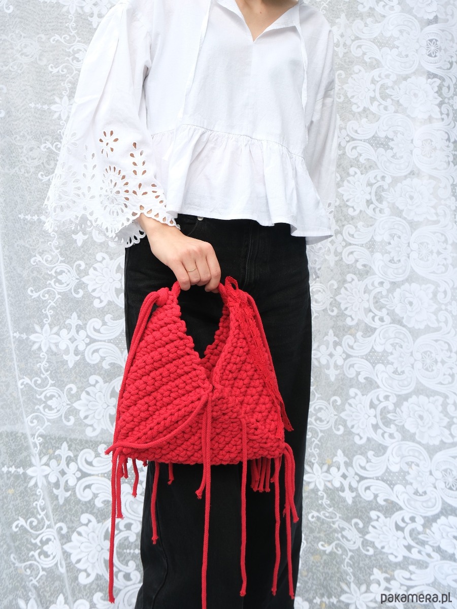 Czerwona Torebka ze Sznurka Bawełnianego z Recyklingu z Frędzlami