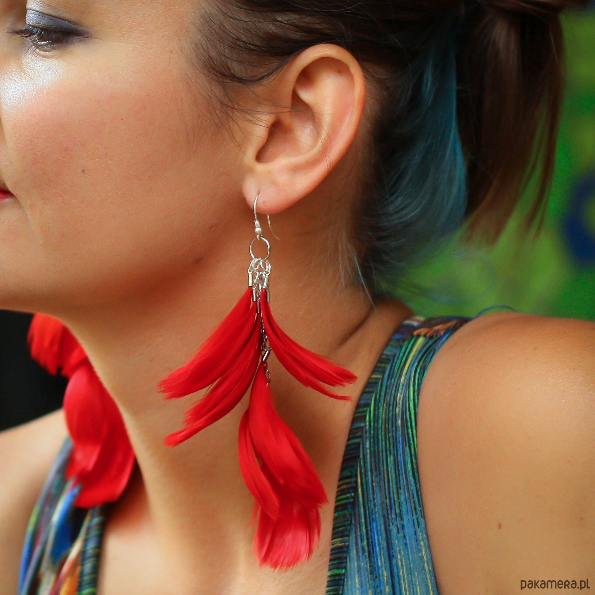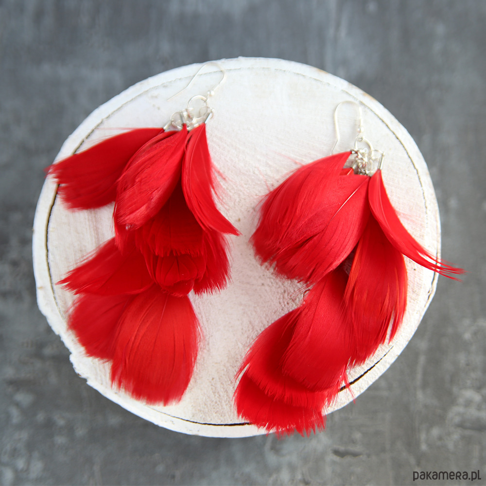 Długie, wyraziste, oryginalne kolczyki z naturalnymi piórami, w stylu boho - w odcieniu intensywnej czerwieni.