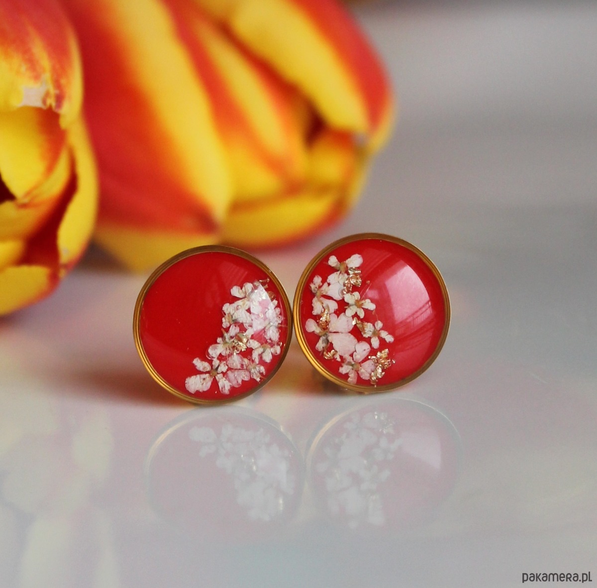 Czerwone kolczyki kwiatami złote prawdziwe kwiaty wkręty żywica