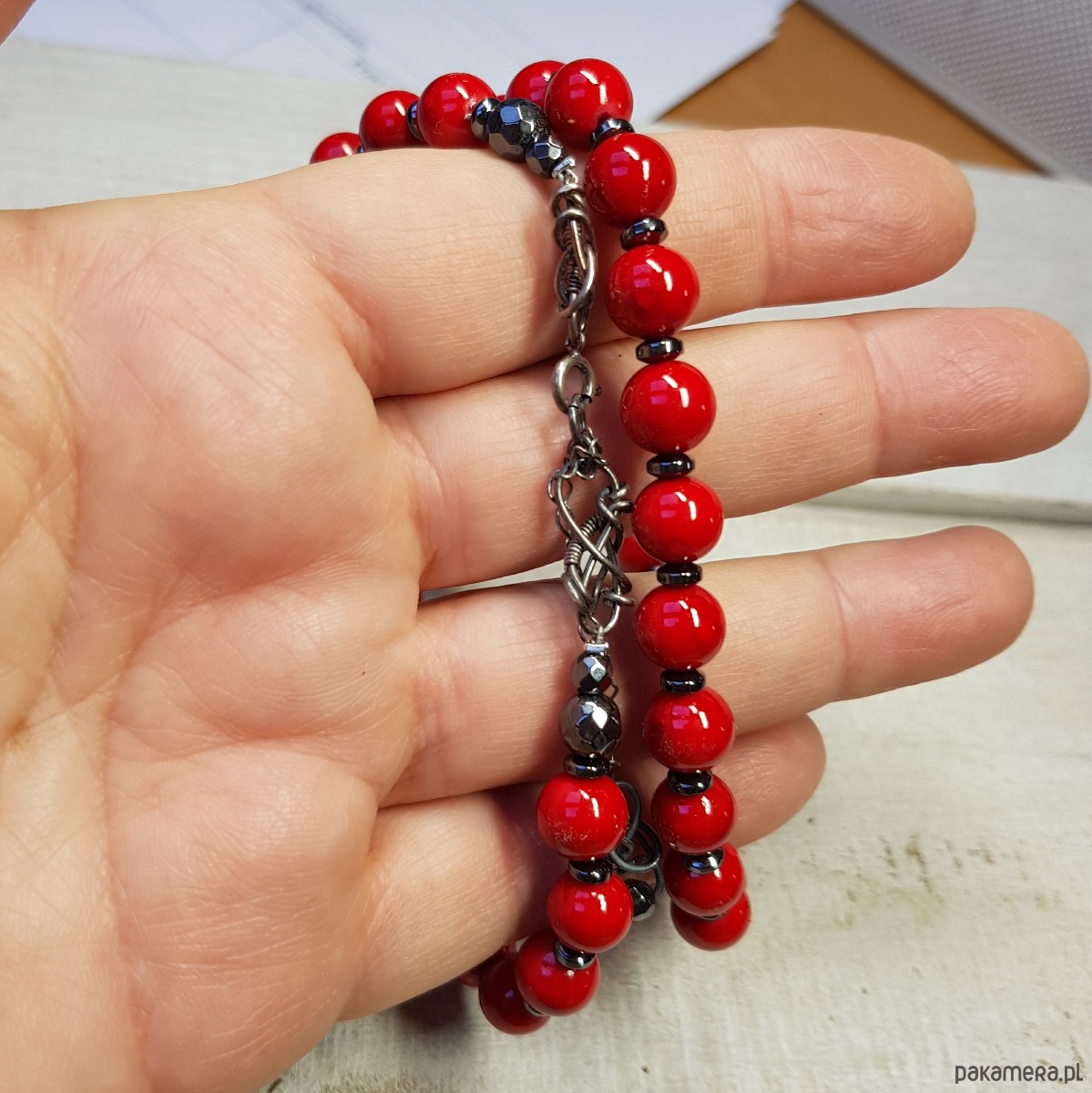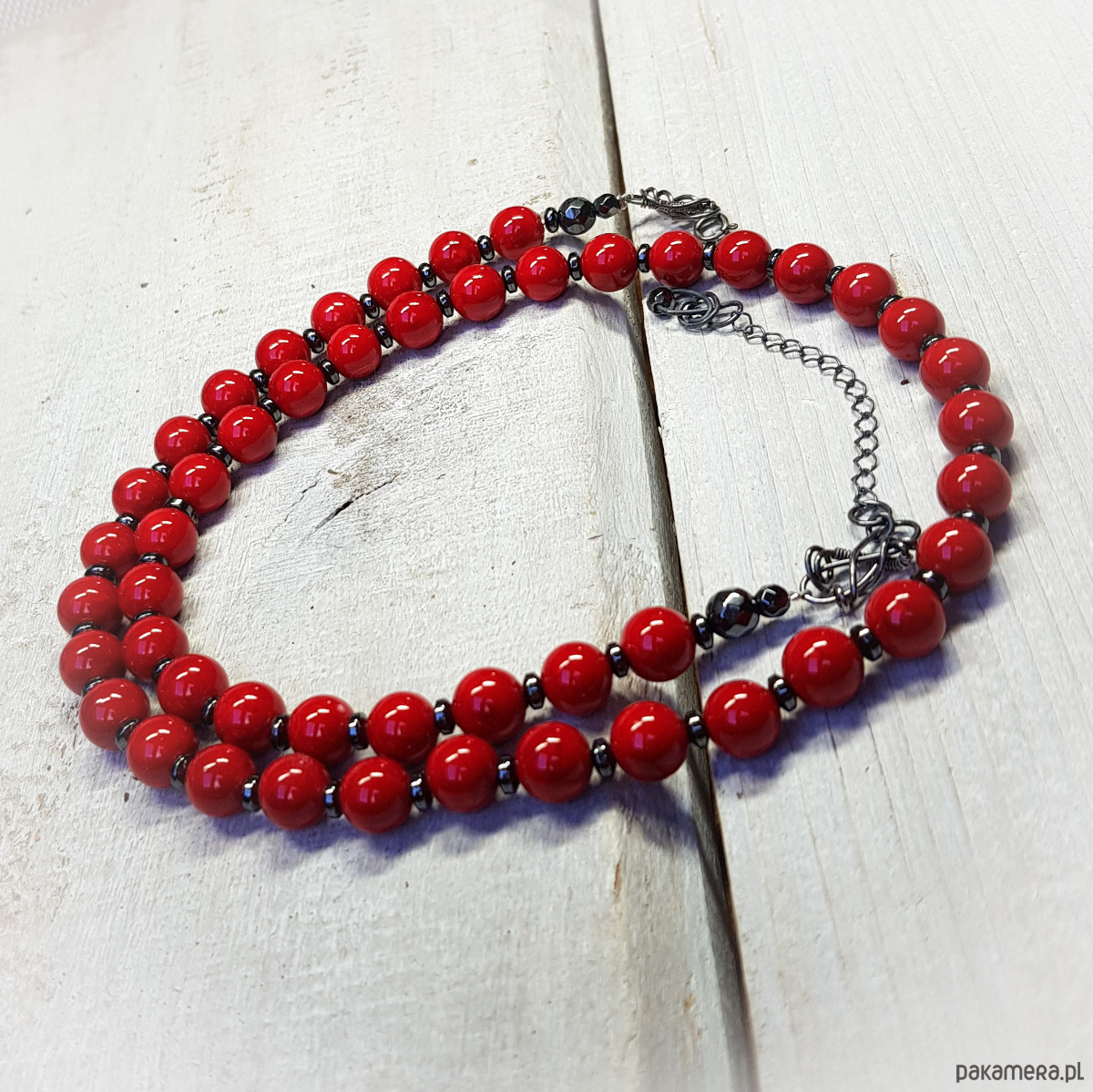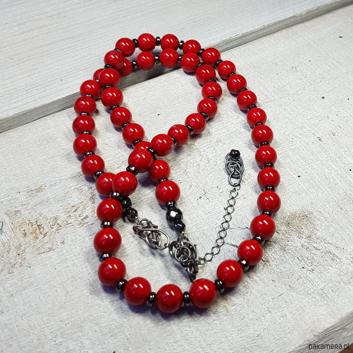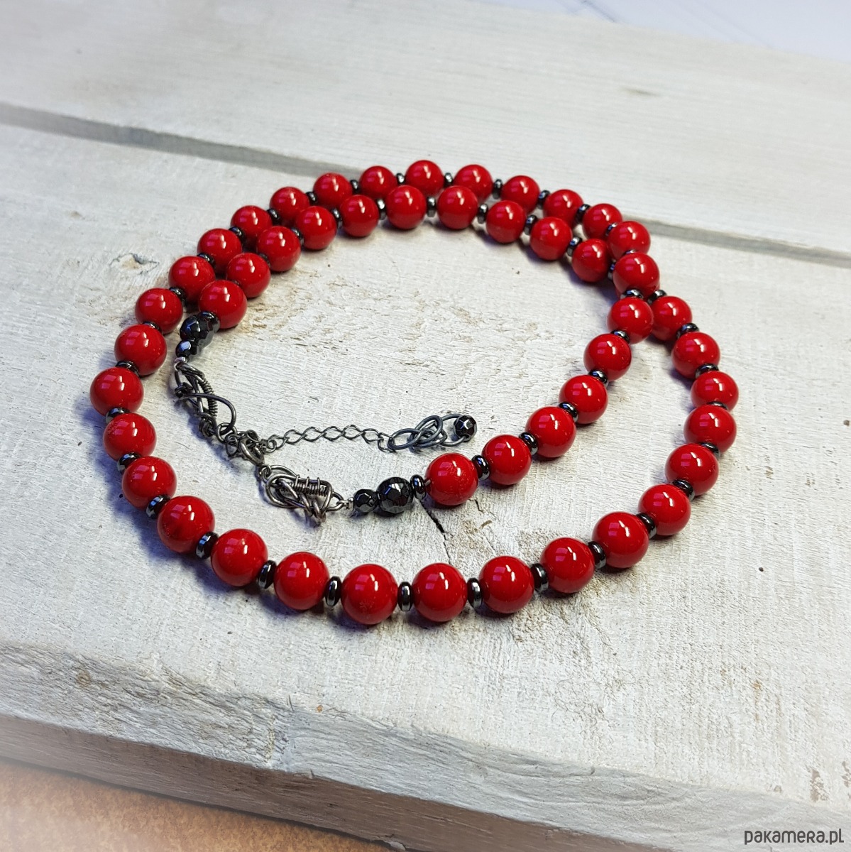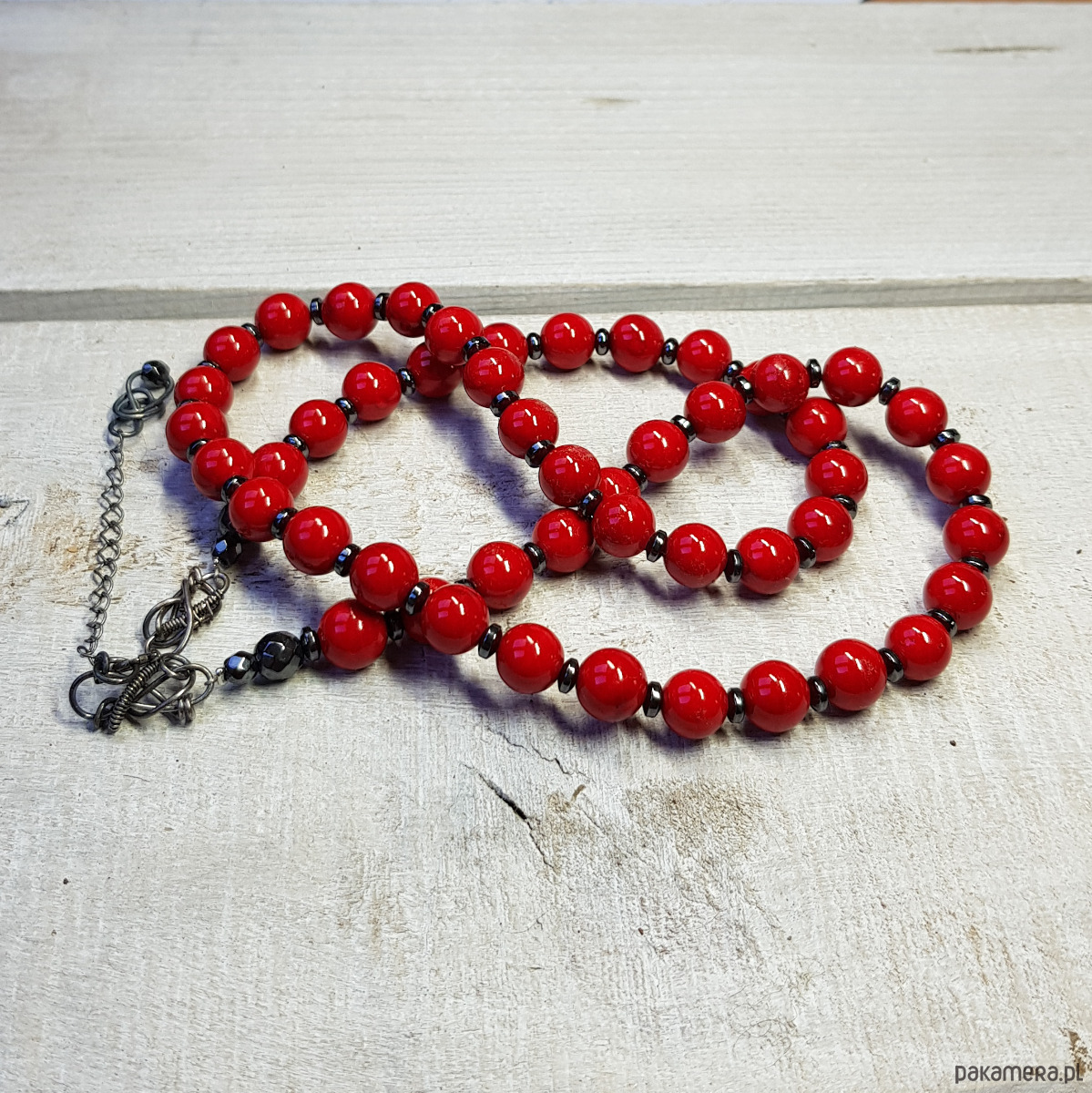 Sznur korali wykonany ręcznie z kulek (8mm) naturalnego jadeitu w pięknym czerwonym kolorze i przekładek hematytu. Wykończenia i zapięcie wykonane w srebrze 925, oksydowanym i wypolerowanym. Długość korali wynosi ok. 56cm plus przedłużka 5cm.