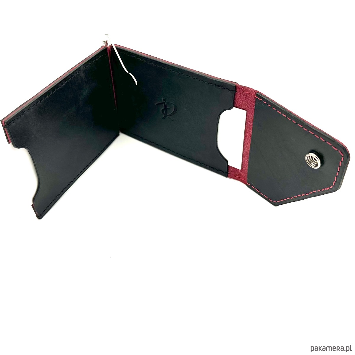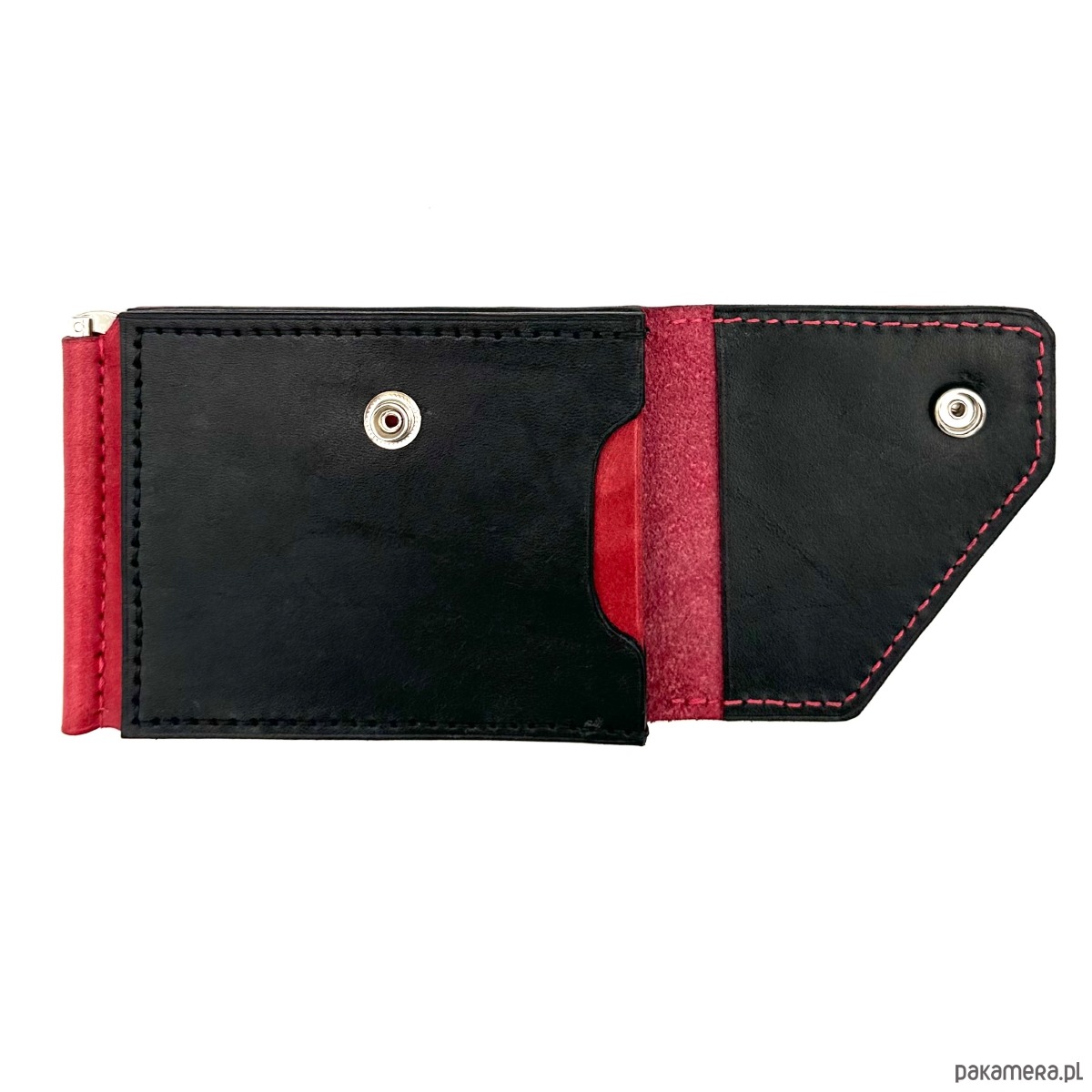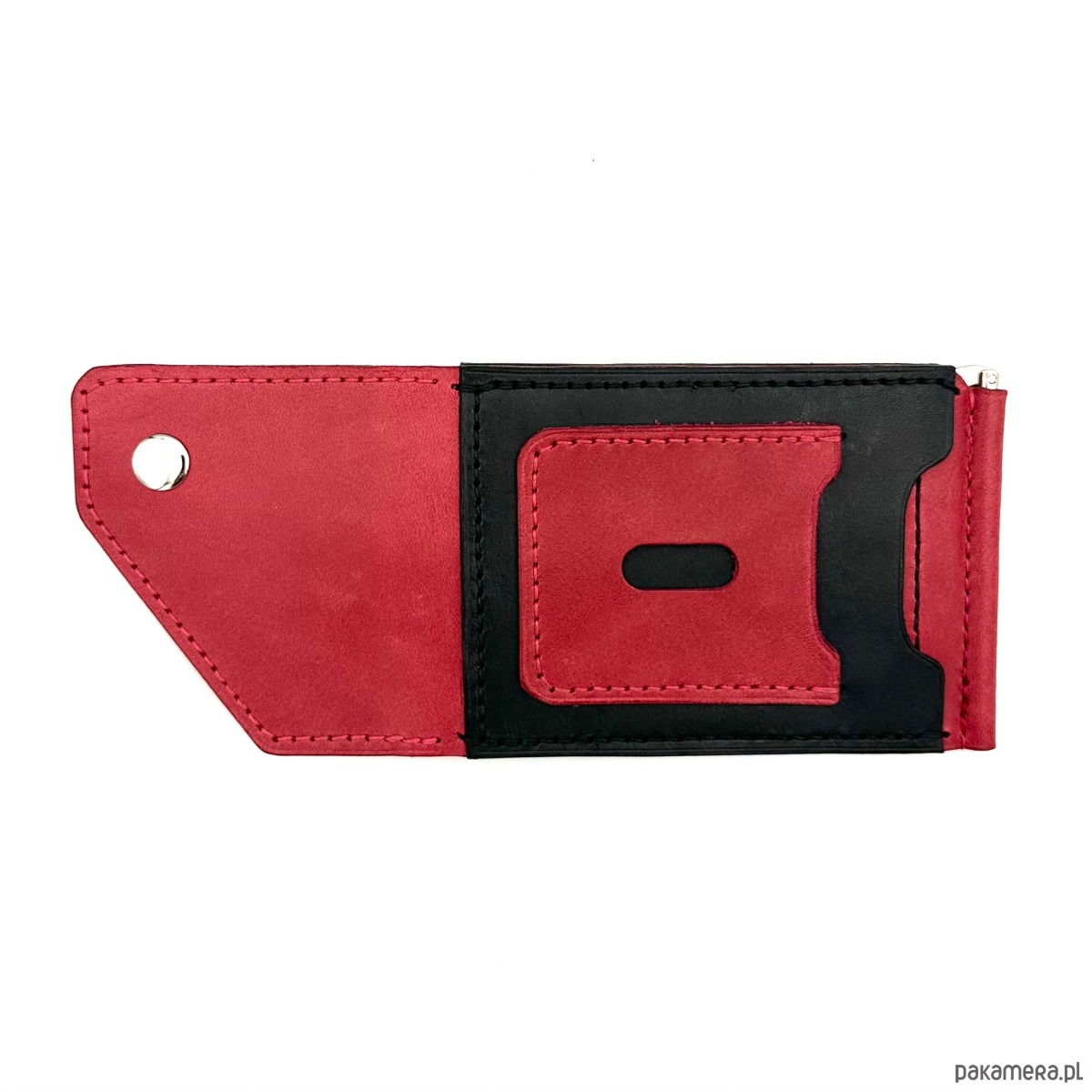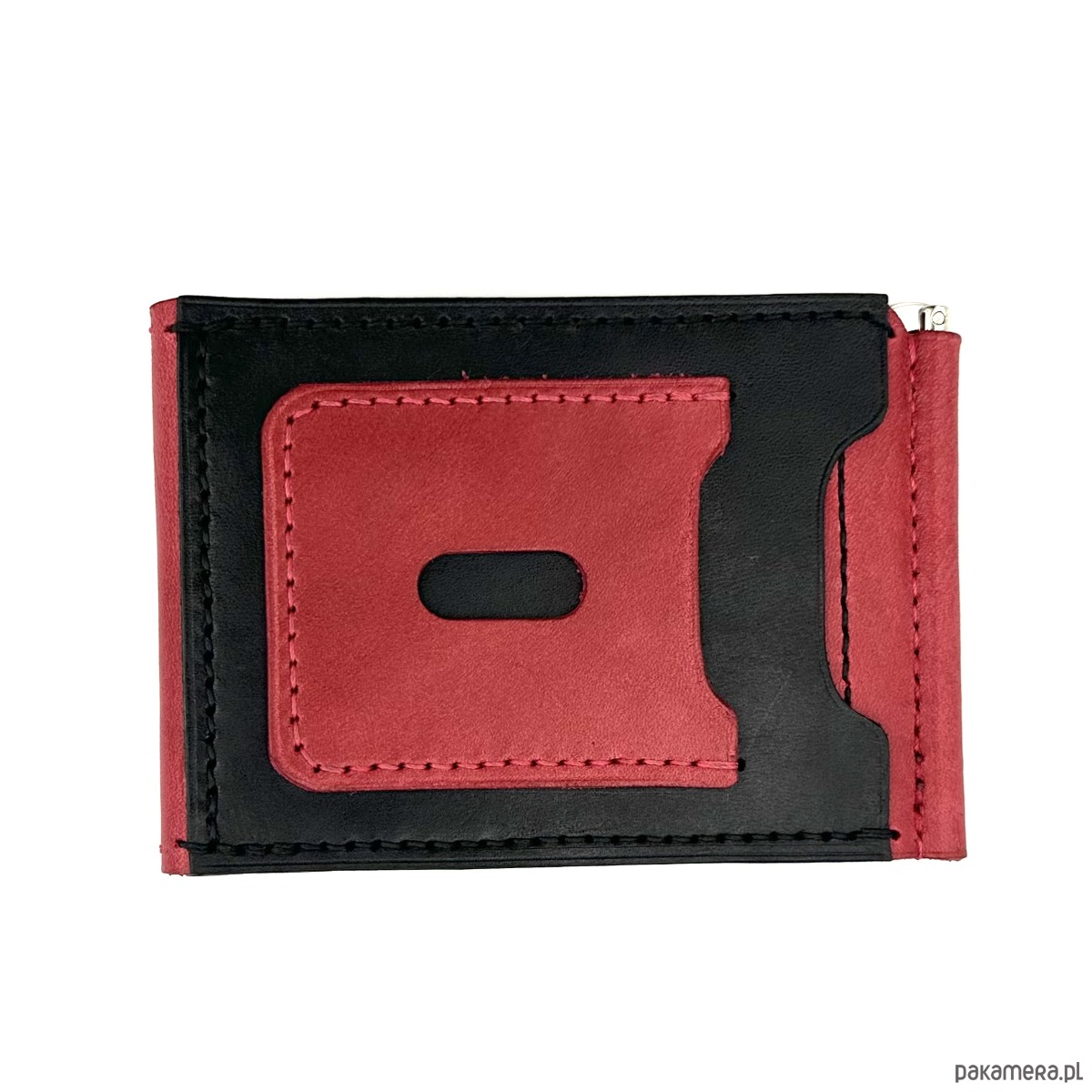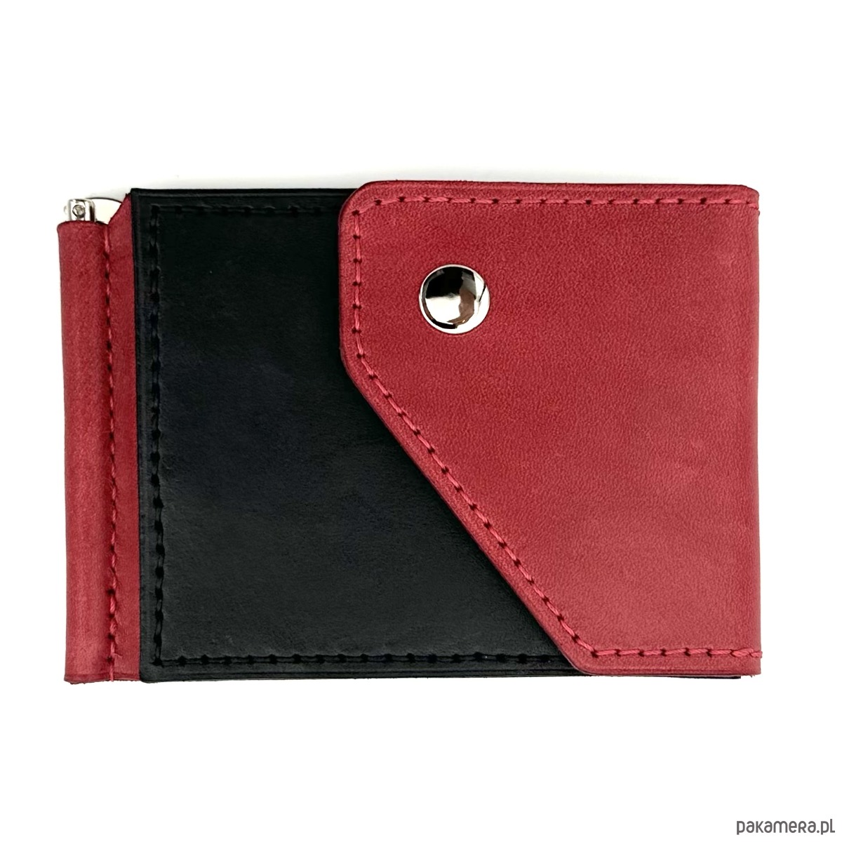 Czerwono-czarny portfel na klips skórzany ręcznie uszyty.
