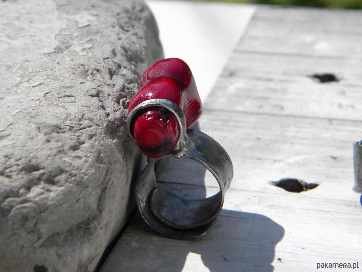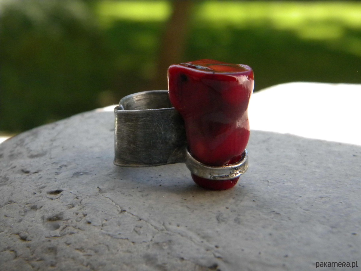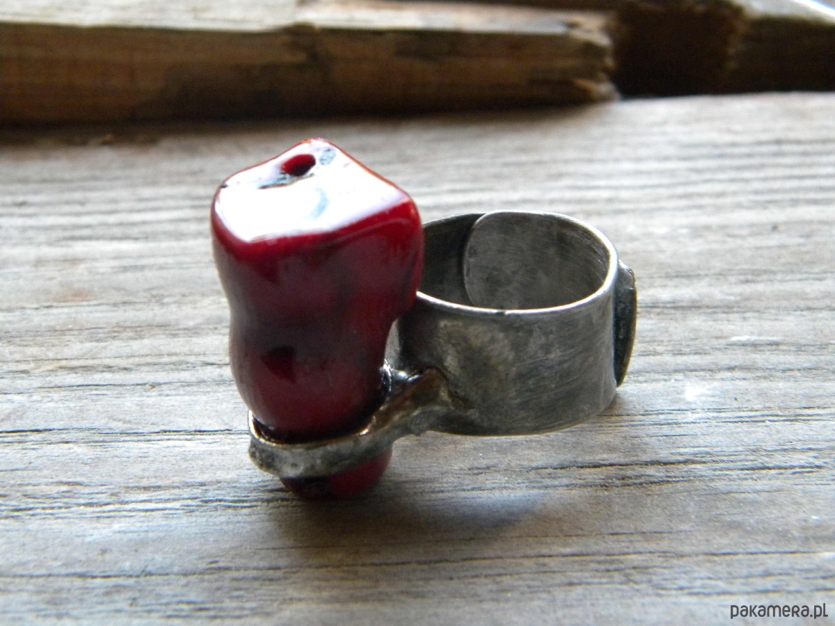 Pierścionek. koral tzw robaczywka w ocynowanej miedzi.