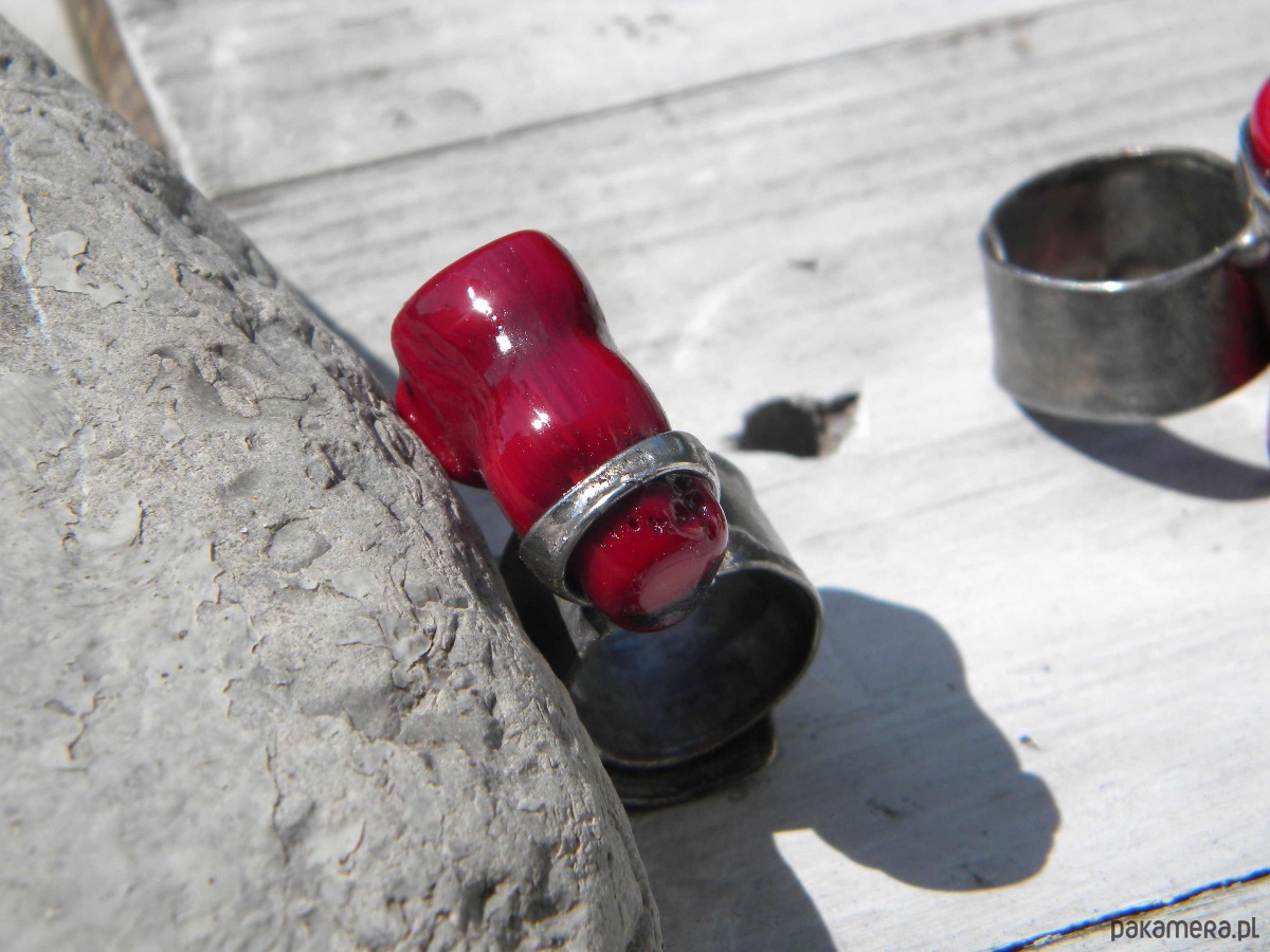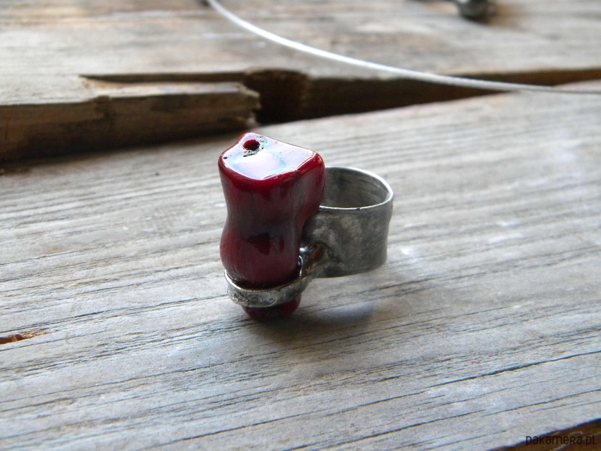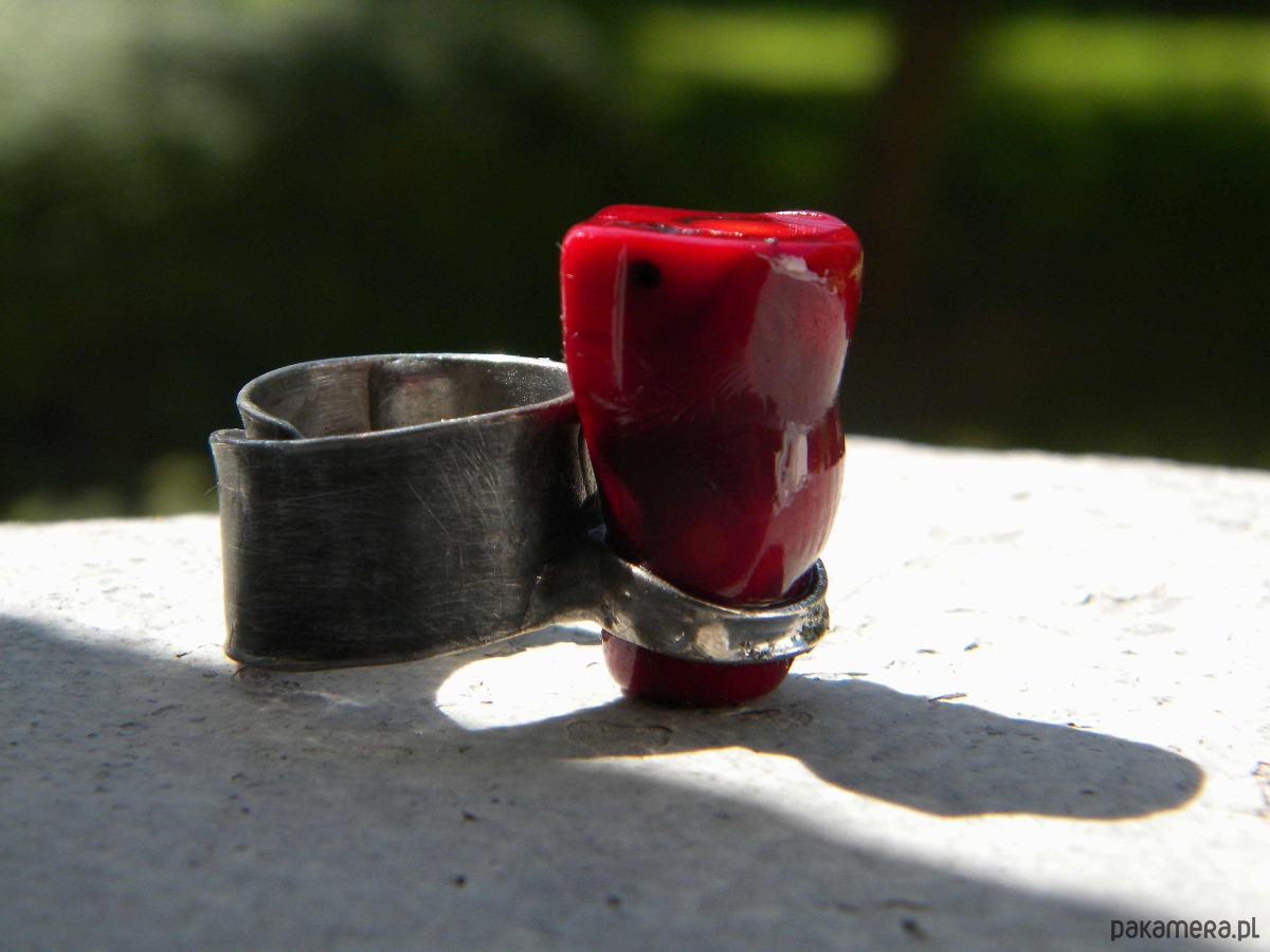 Pierścionek. koral tzw robaczywka w ocynowanej miedzi.