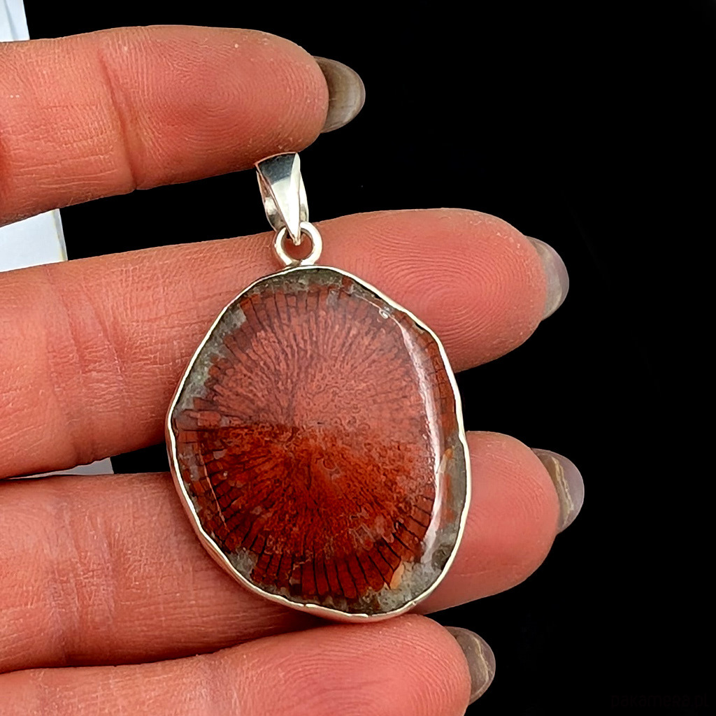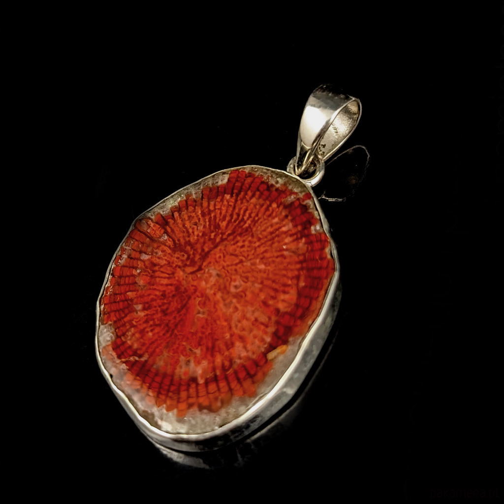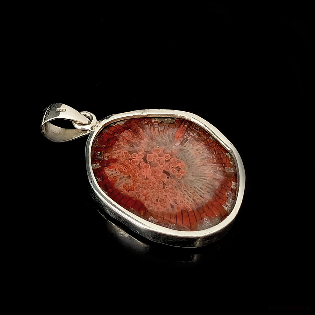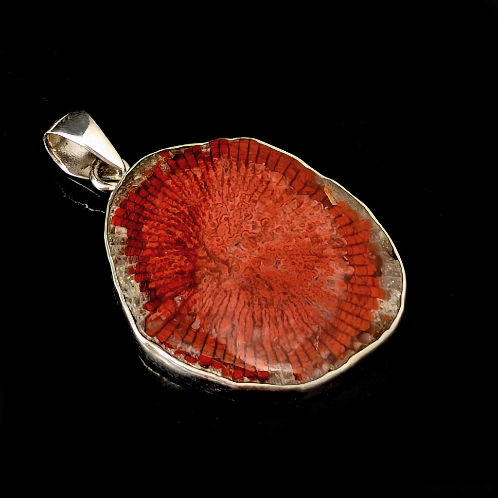 Rzadki, czerowny koral w surowej oprawie srebra próby 925. Wymiary całej oprawy kamienia 31 x 26 mm. Długość z krawatką 45mm. Waga wisiora 9,3 g. Wisior zostanie zapakowany w ozdobne pudełeczko. Wykonany przez dostawcę kamieni,