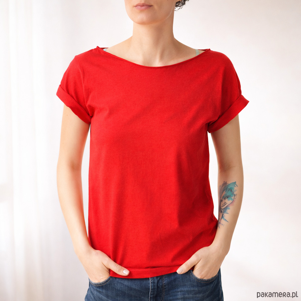 Czerwona koszulka z szerokim, opadającym dekoltem.