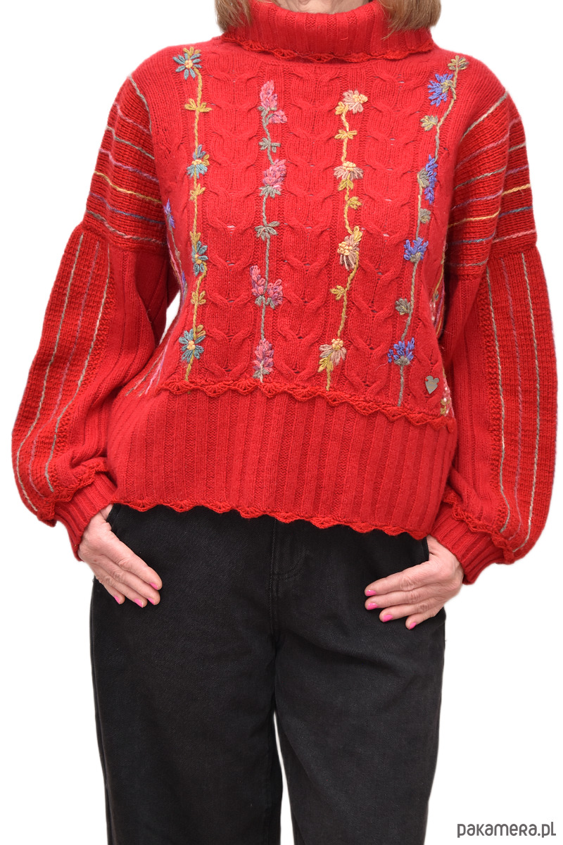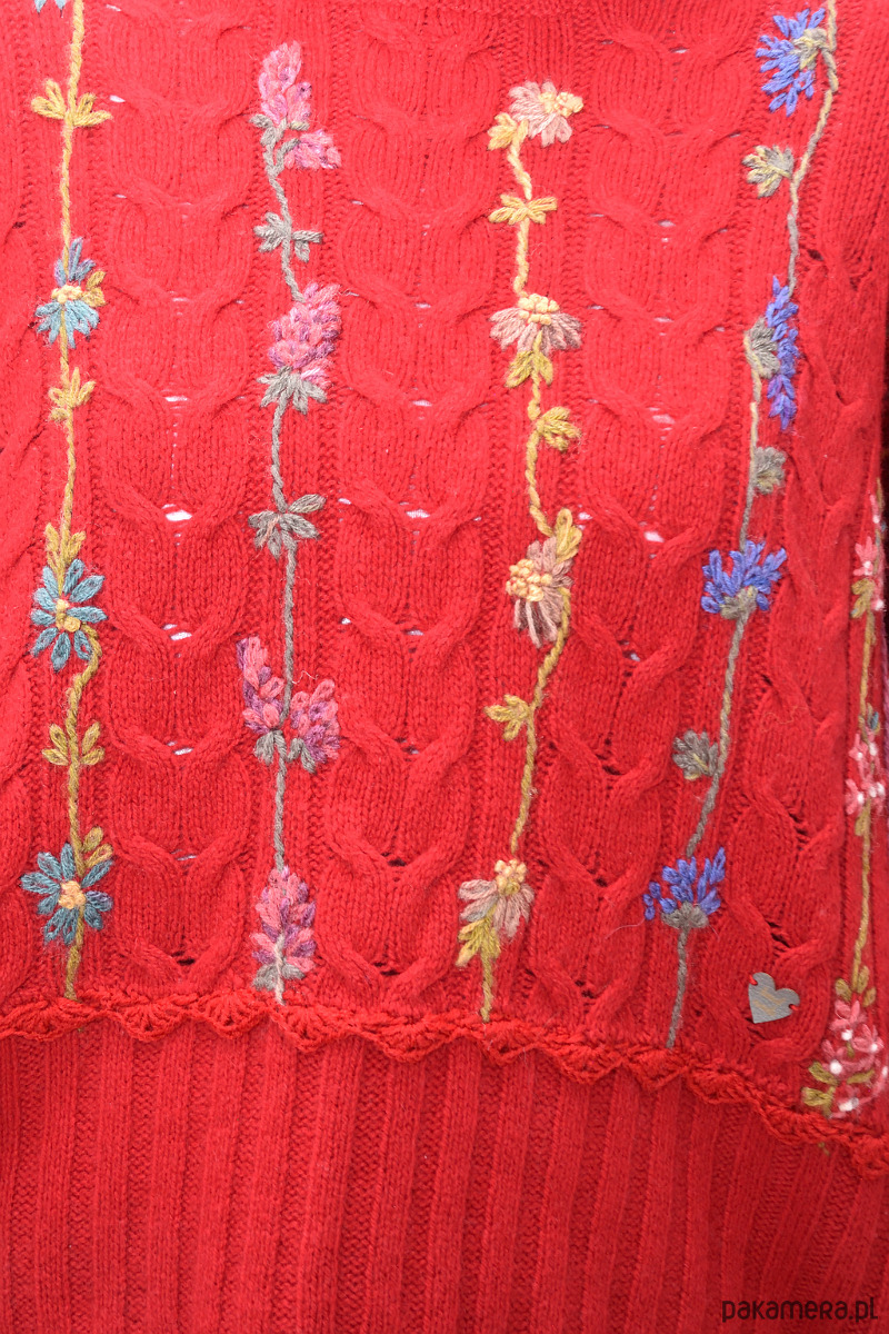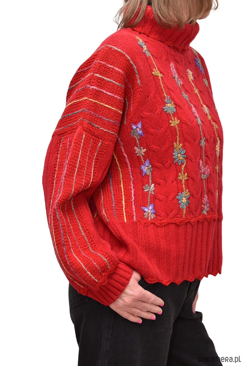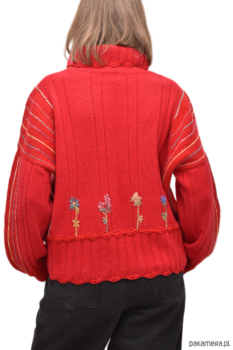 W tym swetrze będziesz wyglądać wyjątkowo. Energetyczna moc czerwieni doda blasku osobom o każdym typie urody, a luźny pudełkowy fason zapewni sylwetce swobodę i lekkość. Część przodu, tyłu i rękawów, jak również szeroki ściągacz i otulający szyję golf, to przyjemna w dotyku dzianina pochodząca z drugiego obiegu. Na tle warkoczy przodu oraz na tyle swetra wyhaftowano ręcznie delikatne gałązki kwiatów. Boki swetra oraz wstawki wzdłuż rękawów wydziergano ręcznie. Prążkowany haft zdobiący tę część swetra stanowi dopełnienie kolorystyczne motywów kwiatowych. Brzegi ściągaczy, mankietów i golfu zostały wykończone szydełkiem. Doskonale prezentuje się w zestawieniach z szerokimi spodniami i spódnicami.