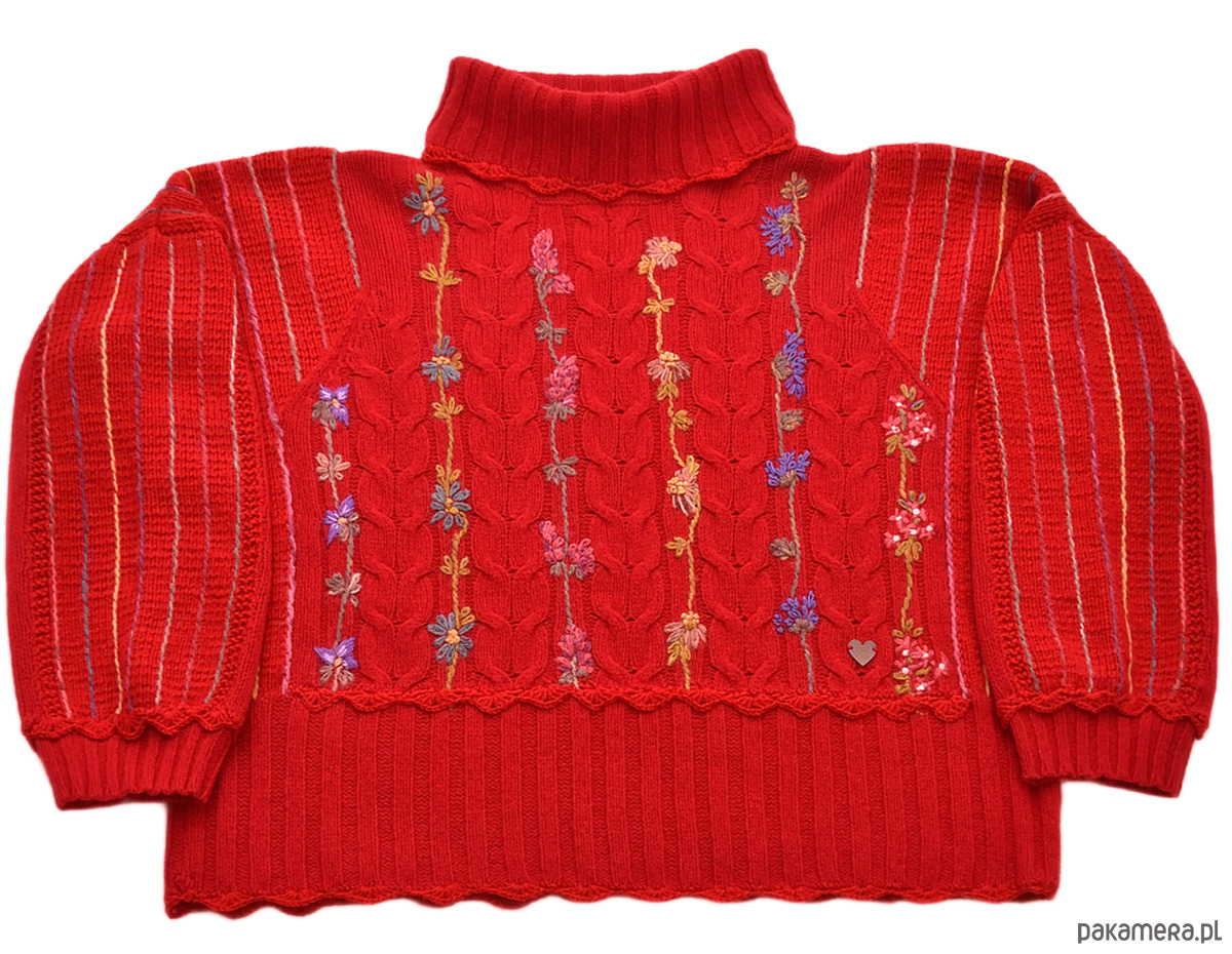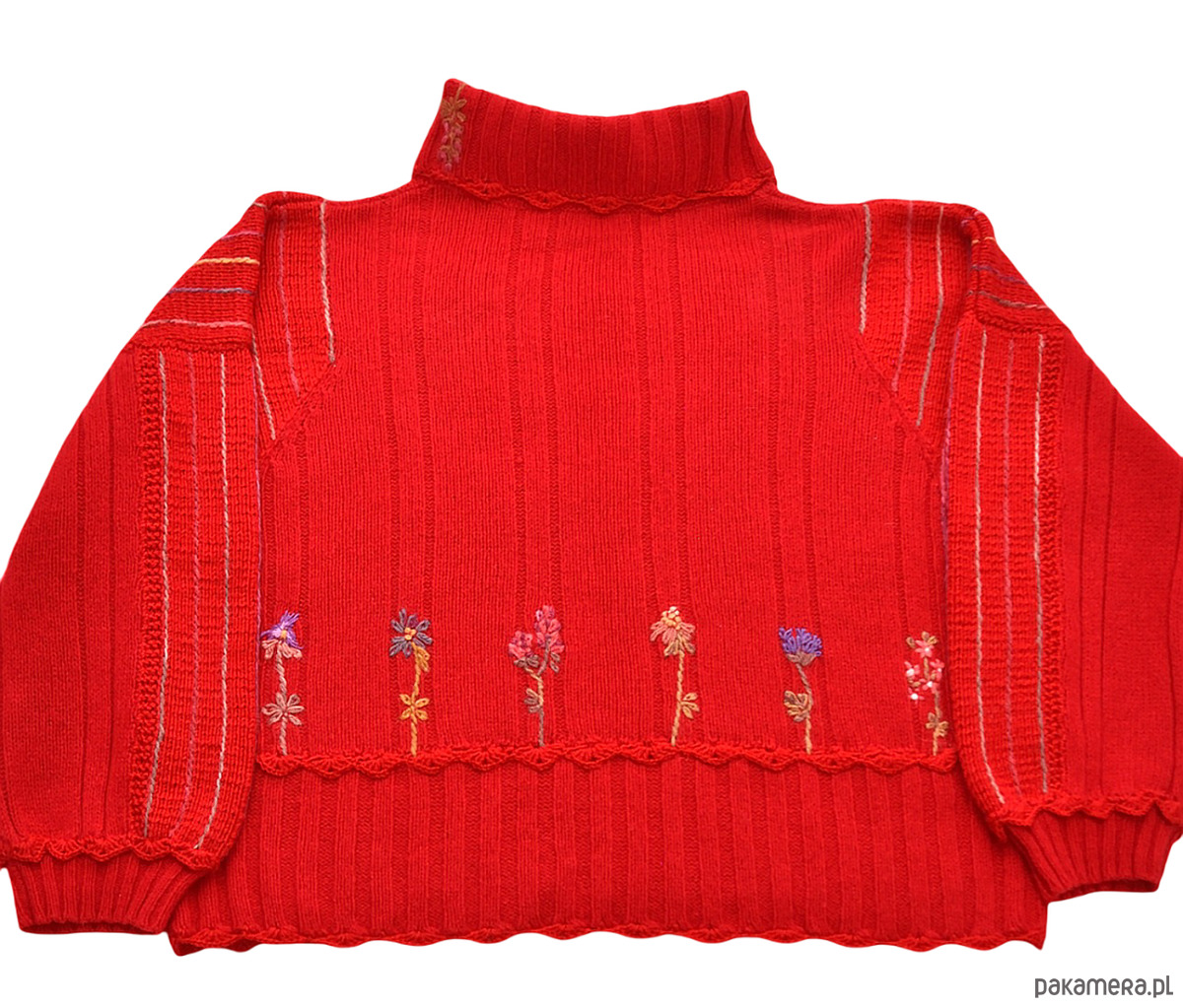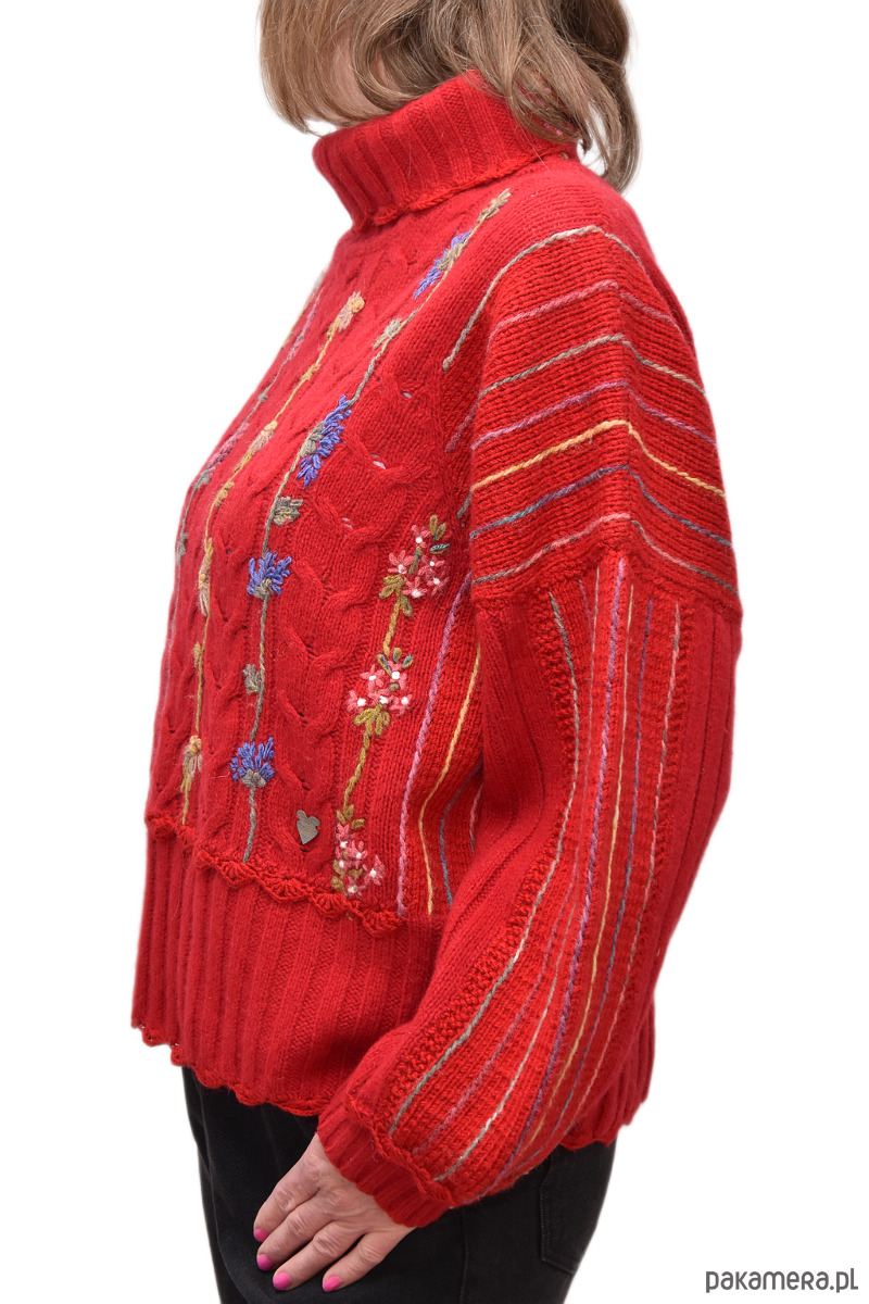 Czerwony sweter z golfem i haftami, rozmiar L/XL