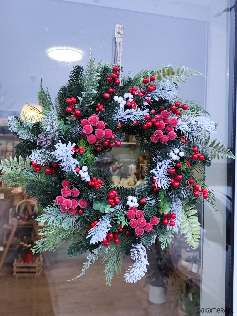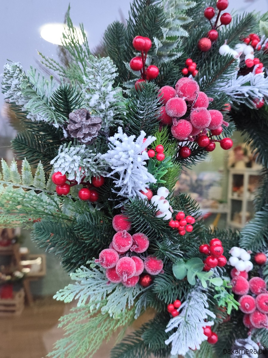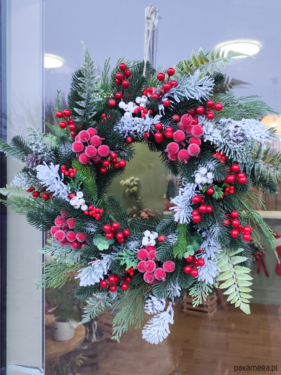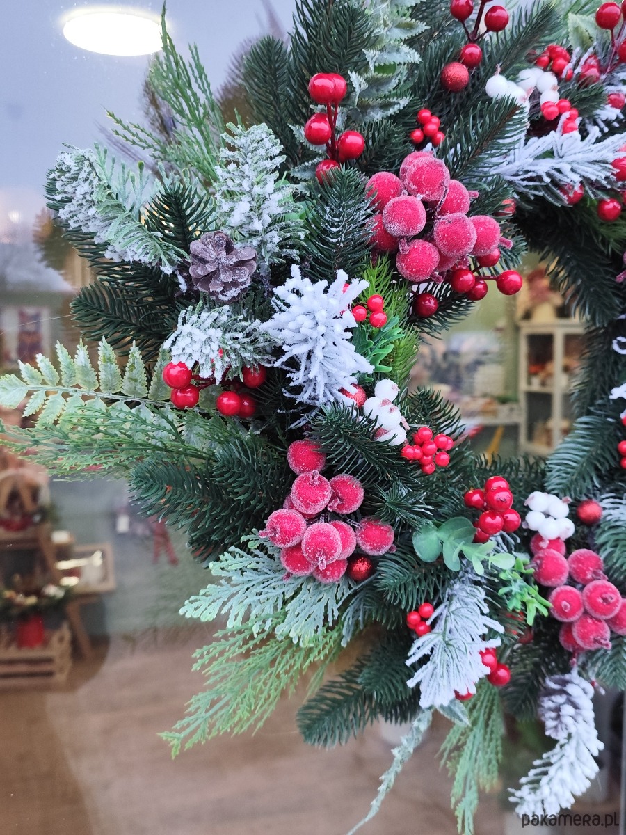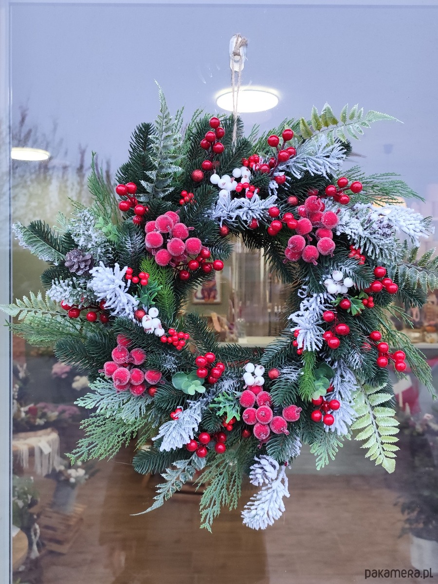 Efektowny, gęsty wianek ze sztucznych gałązek premium, pełen czerwonych owoców, zimowych gałązek i zieleni jodły. Delikatny „szron” dodaje mu elegancji i tworzy wyjątkowy, świąteczny klimat.