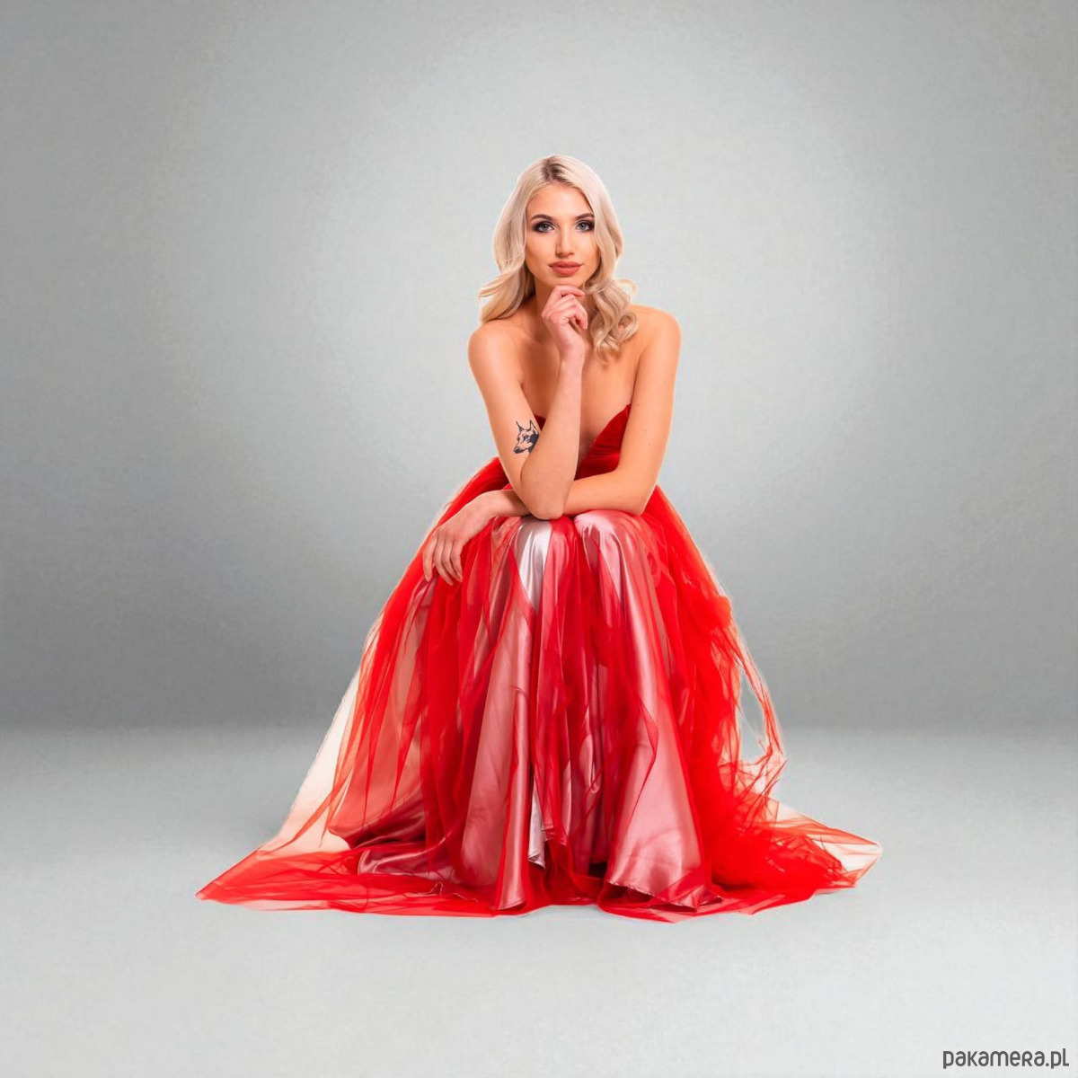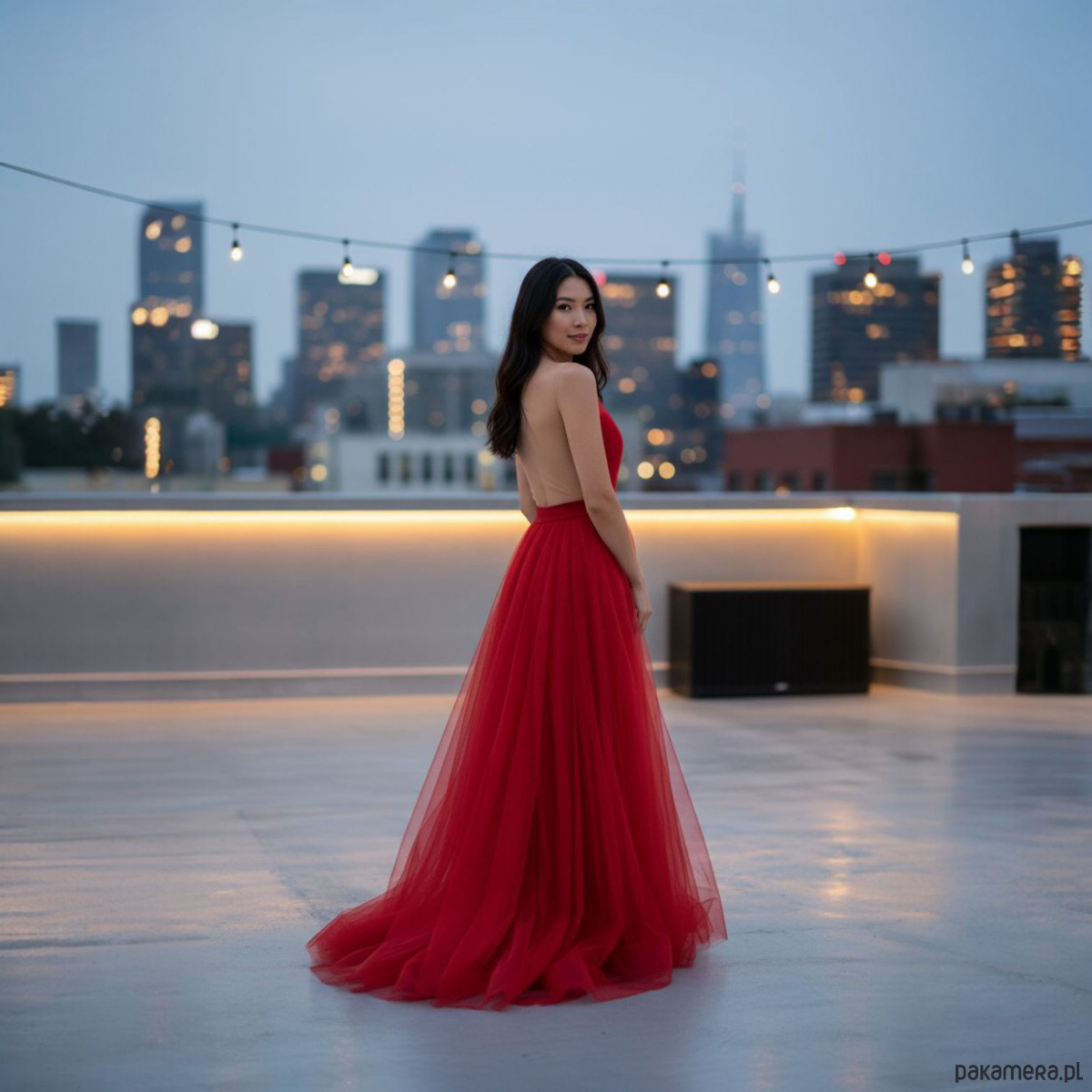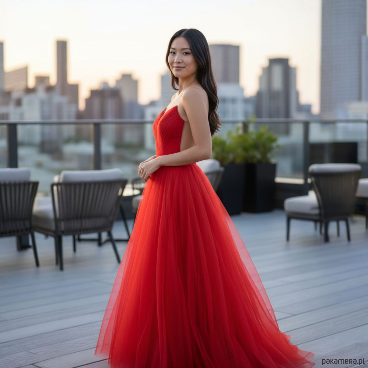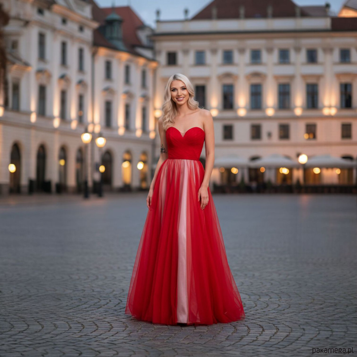 Dół uszyty z wysokogatunkowej, jedwabistej satyny w odcieniu cappuccino, skrojonej z pełnego koła – pokryty lekkim, czerwonym tiulem. To połączenie tworzy niezwykły efekt baleyage: głębia satyny przenika spod warstwy tiulu, nadając sukni wyjątkowego blasku i przestrzenności.
