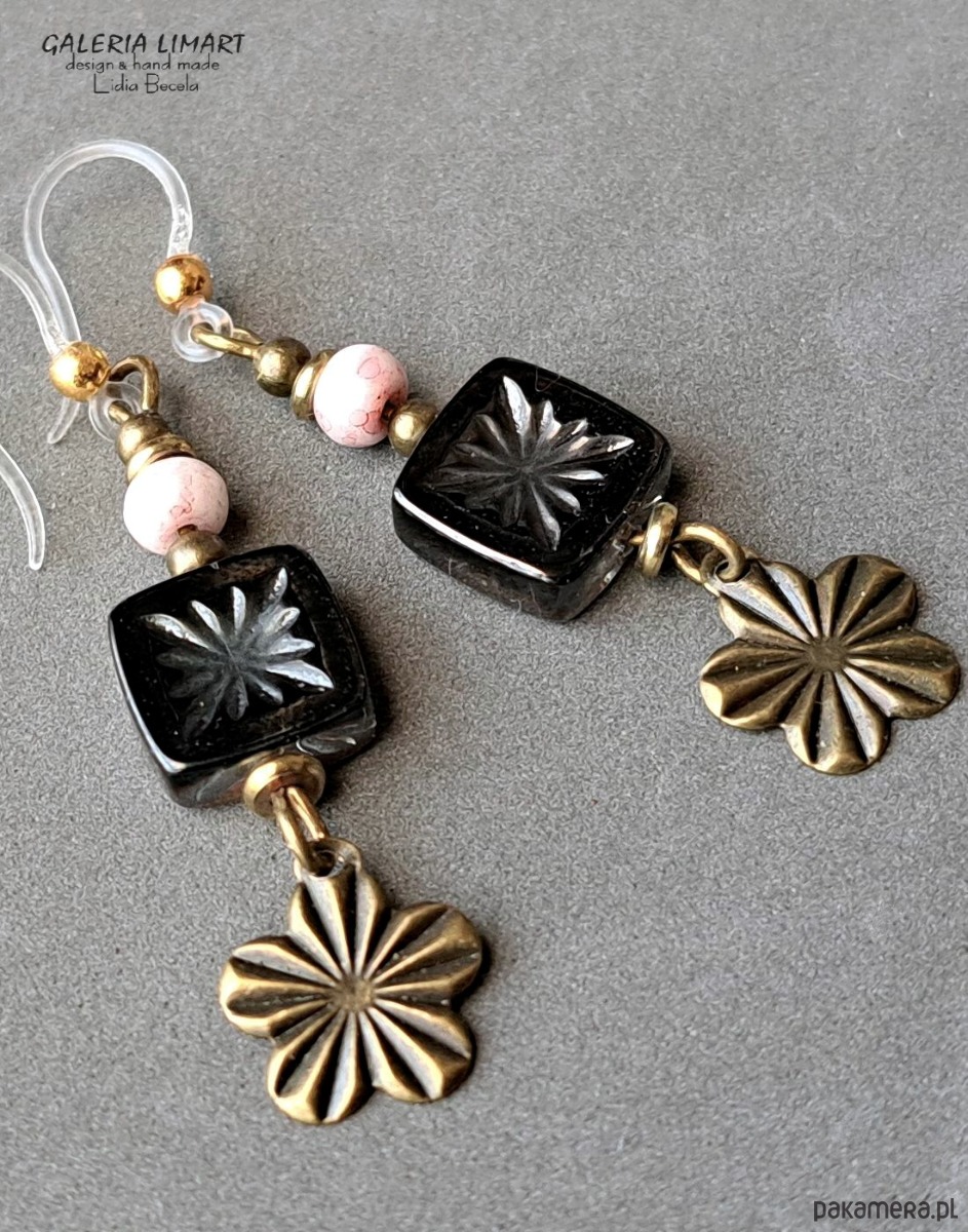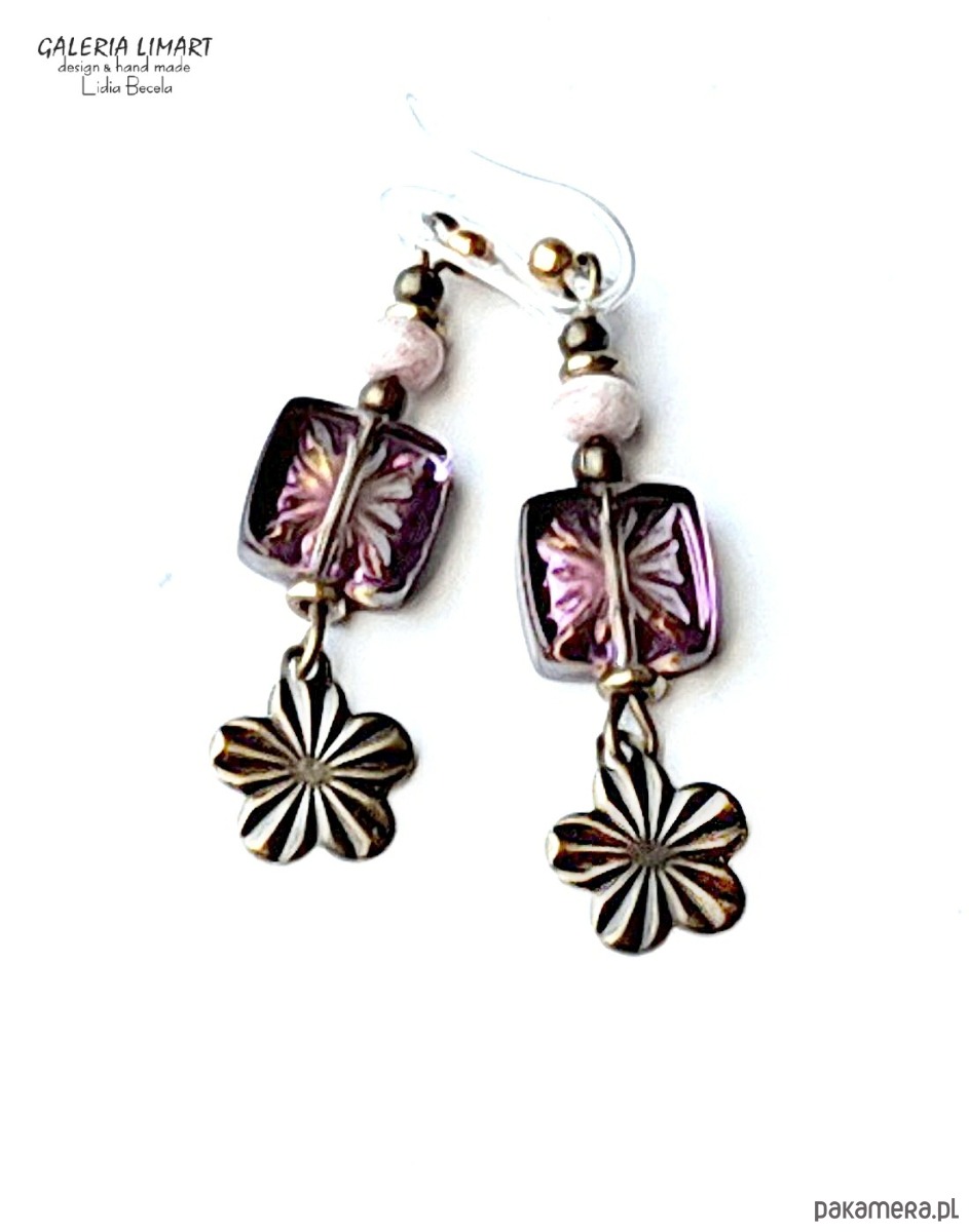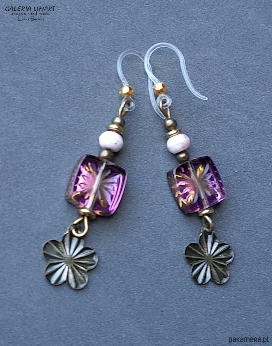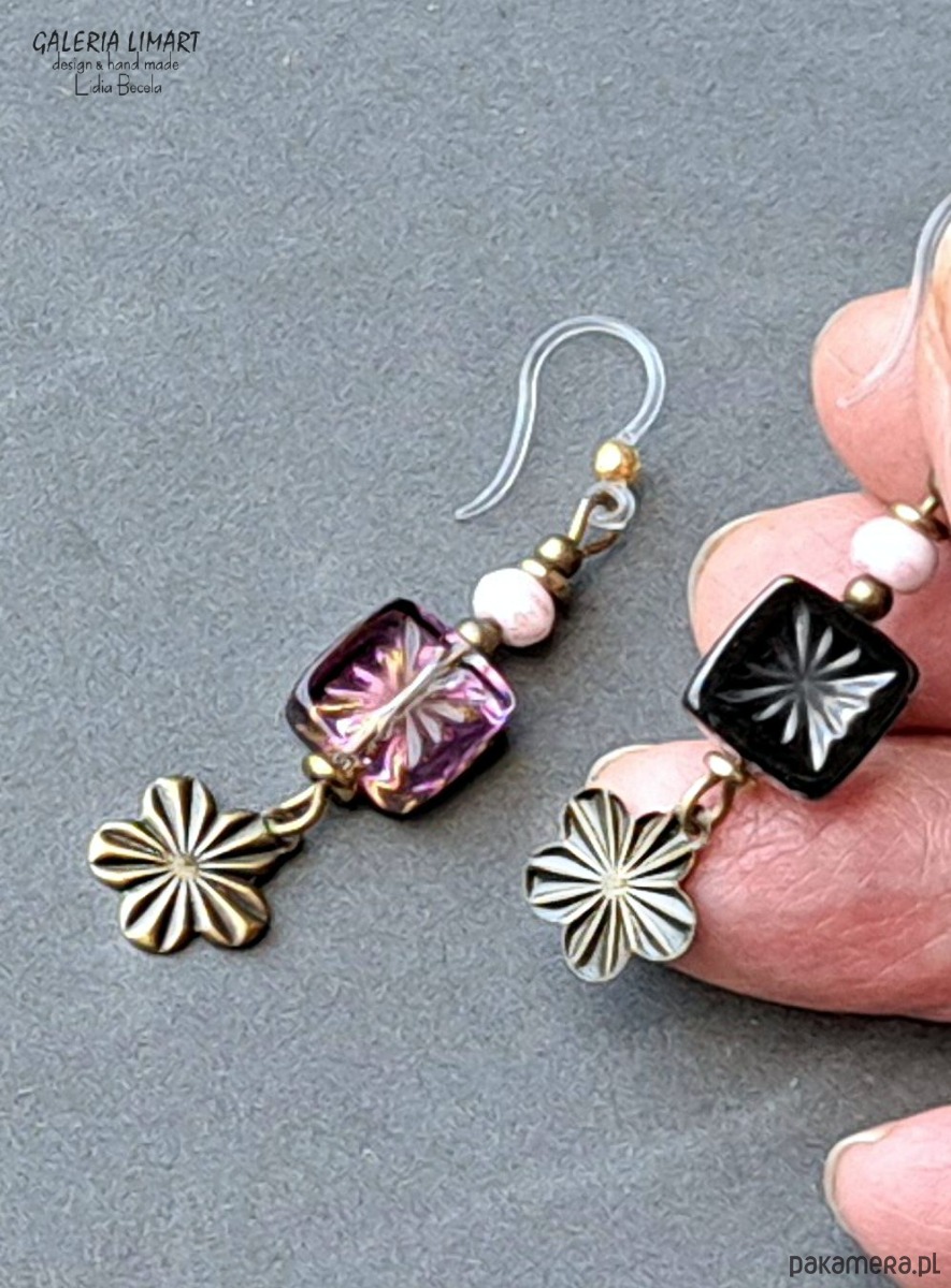 Połączenie kwadratowych szklanych czeskich koralików w cudnym odcieniu fioletu z mosiądzem dało miły dla oka ciekawy i efekt. Kolczyki sa dwustronne: z jednej strony piękny fiolet z drugiej czarne, czyli dwa w jednym. Nowoczesne antyalergiczne silikonowe bigle.