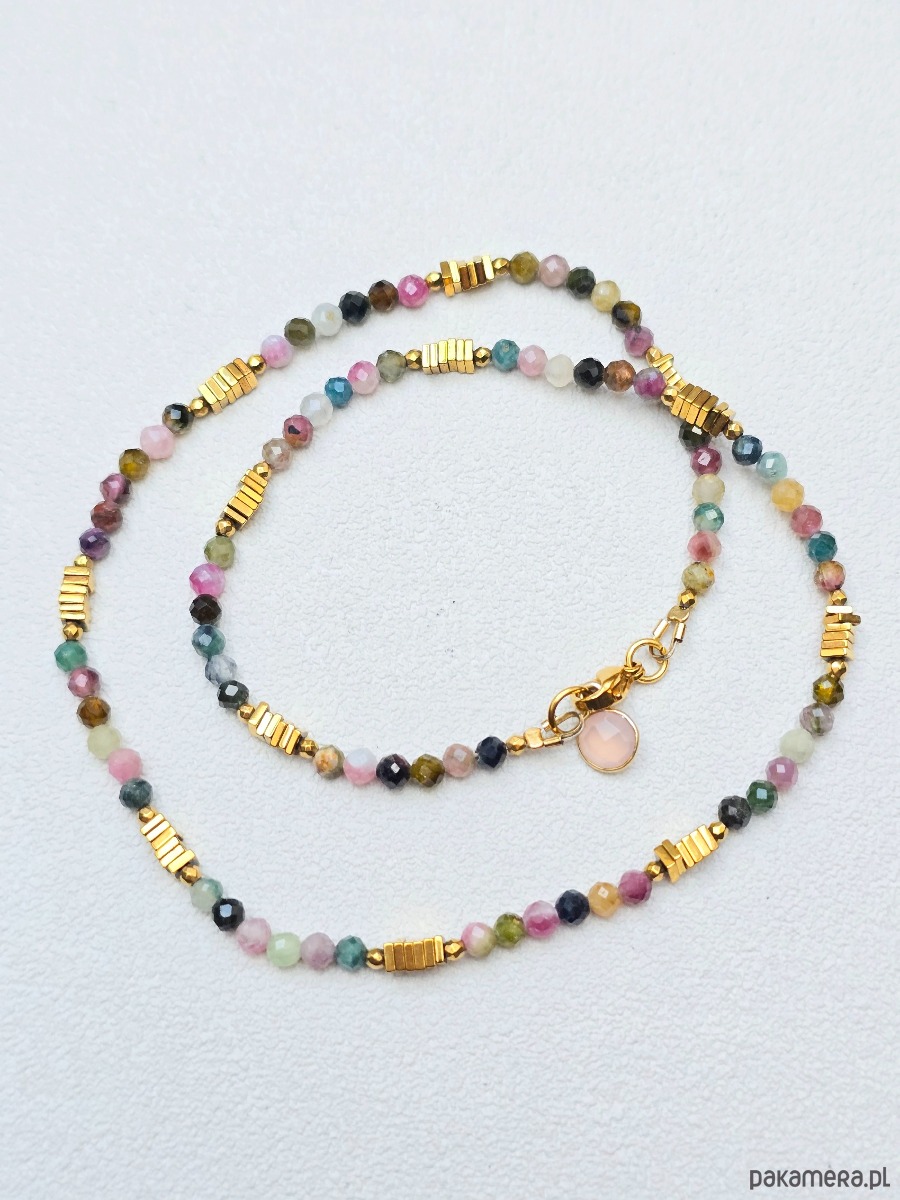 Subtelny naszyjnik/czoker z kolorowych turmalinów i złoconego hematytu.