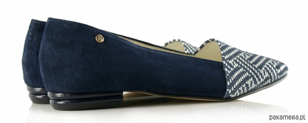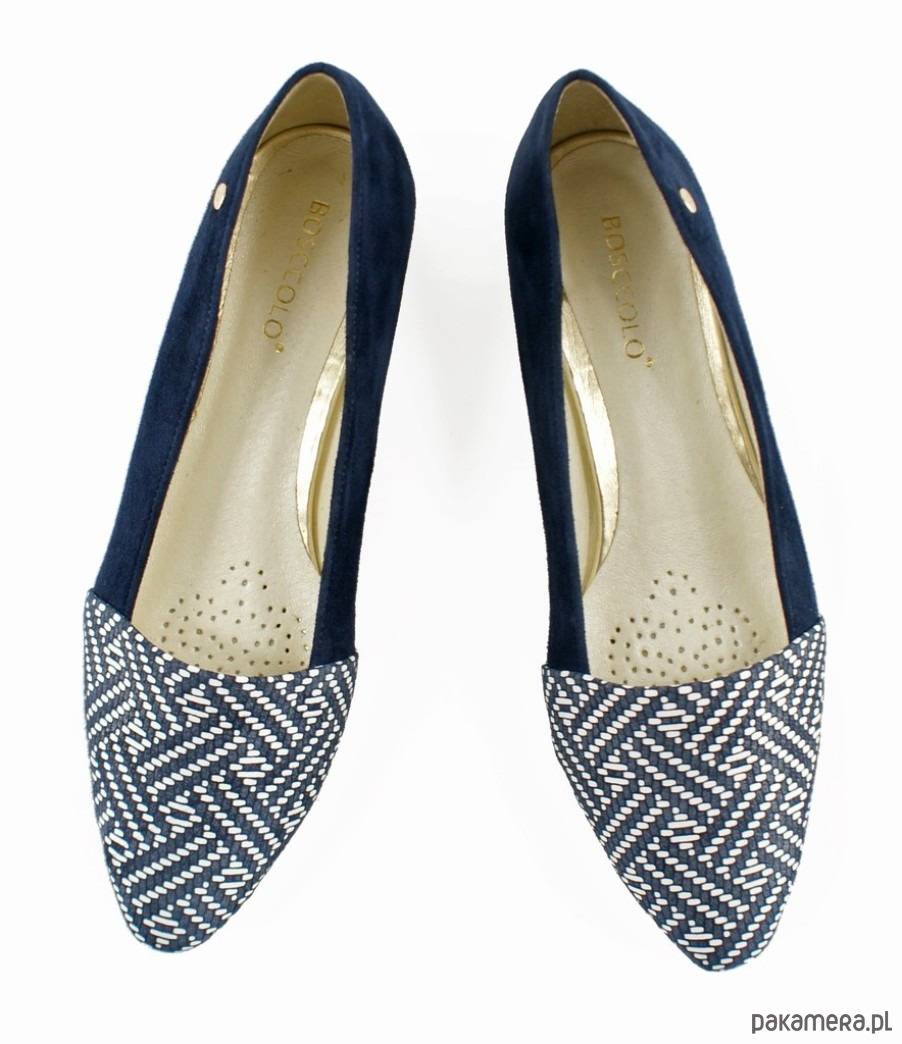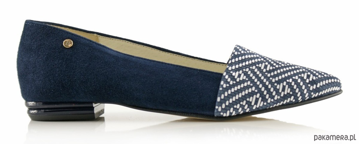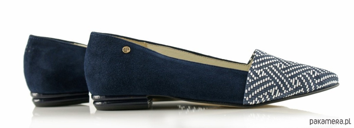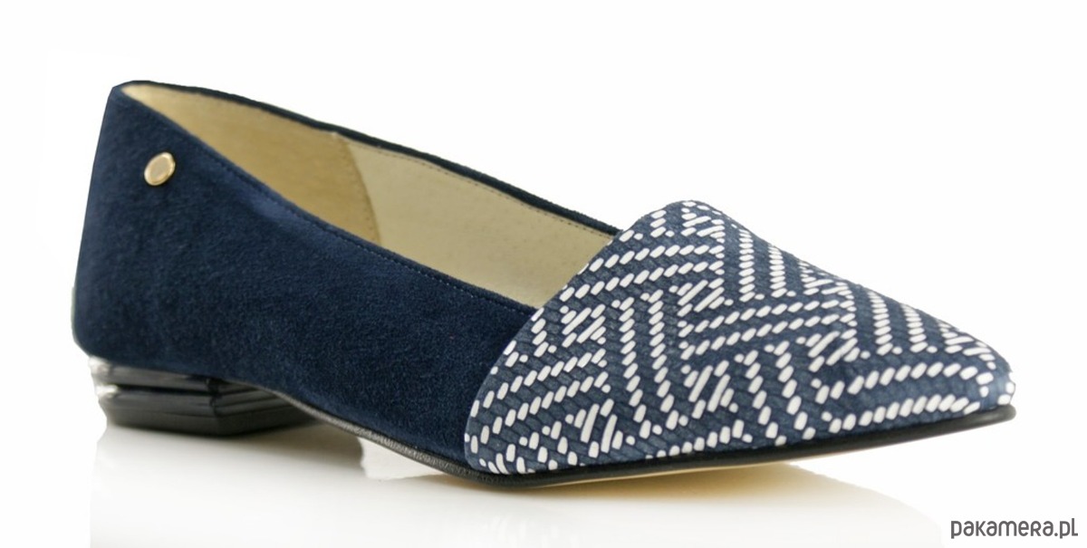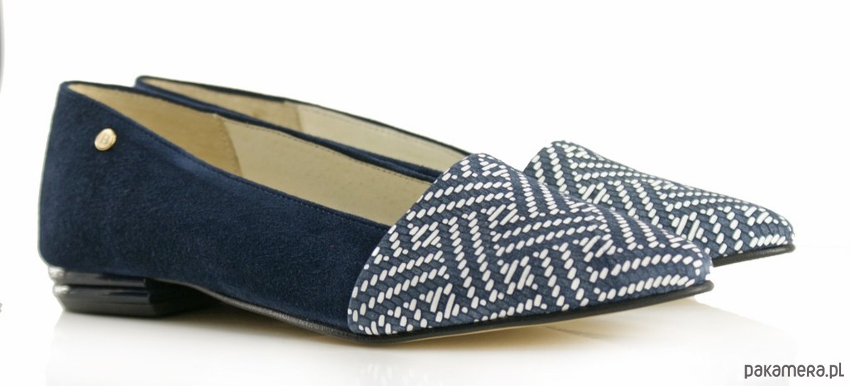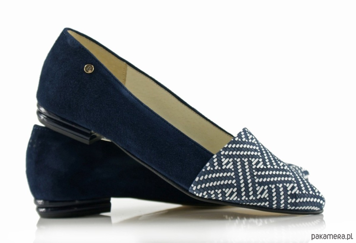 Eleganckie buty damskie z rodzaju balerin, wykonane ze skóry naturalnej, zamszowej z przodem z wzorzystej skóry.