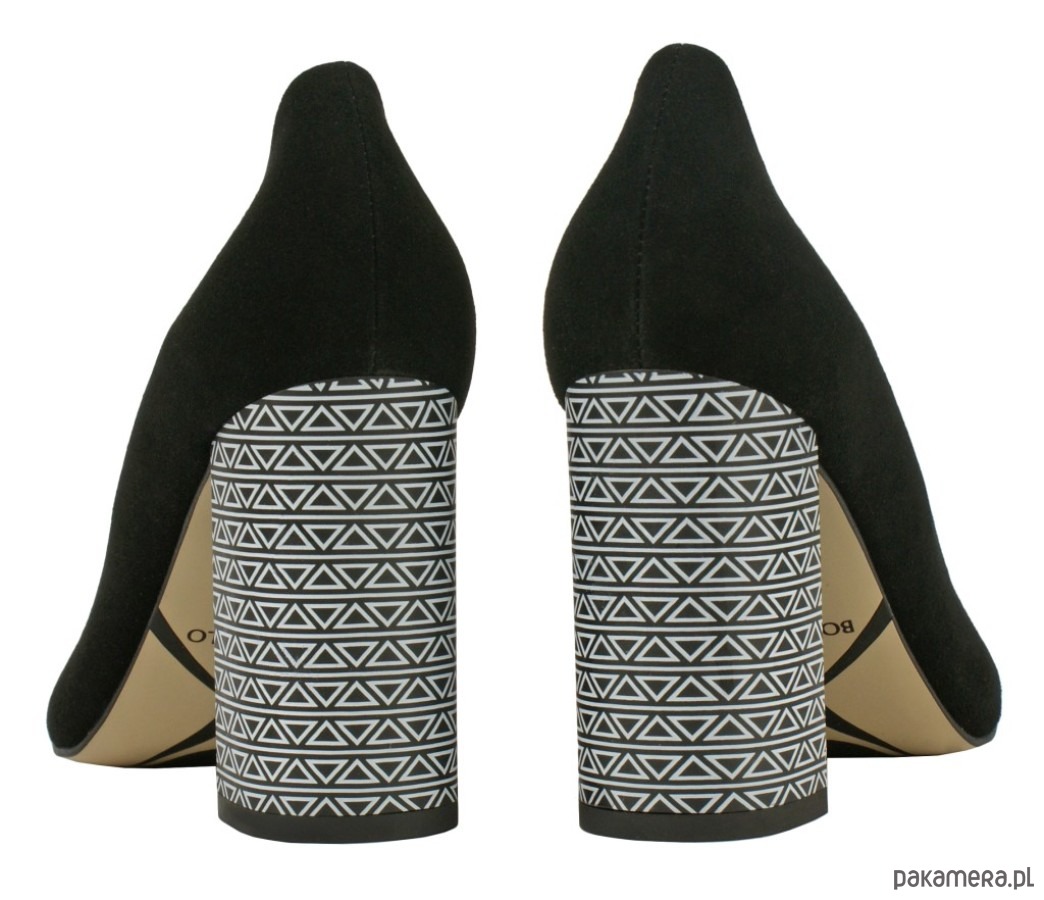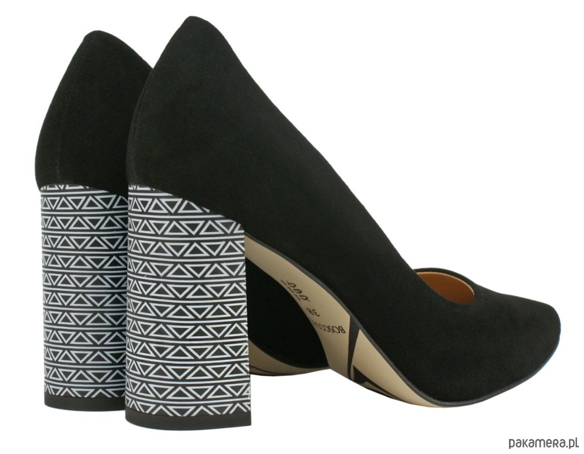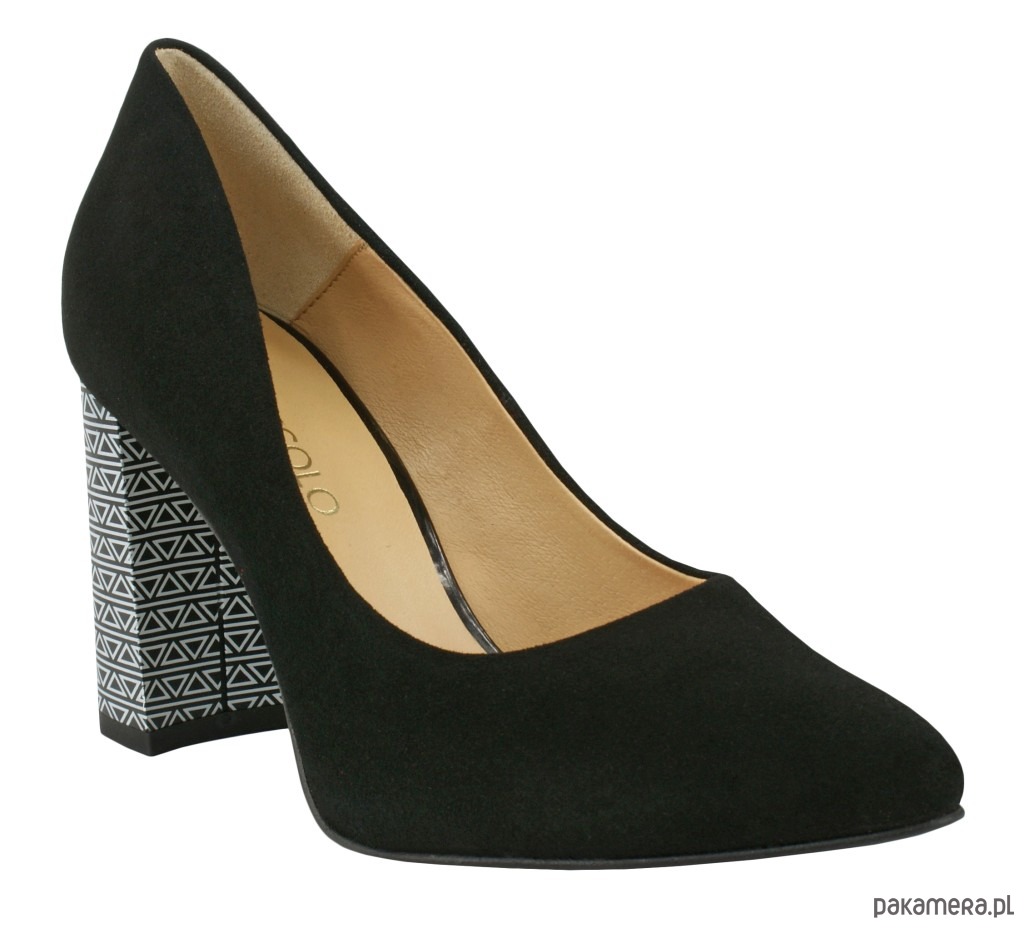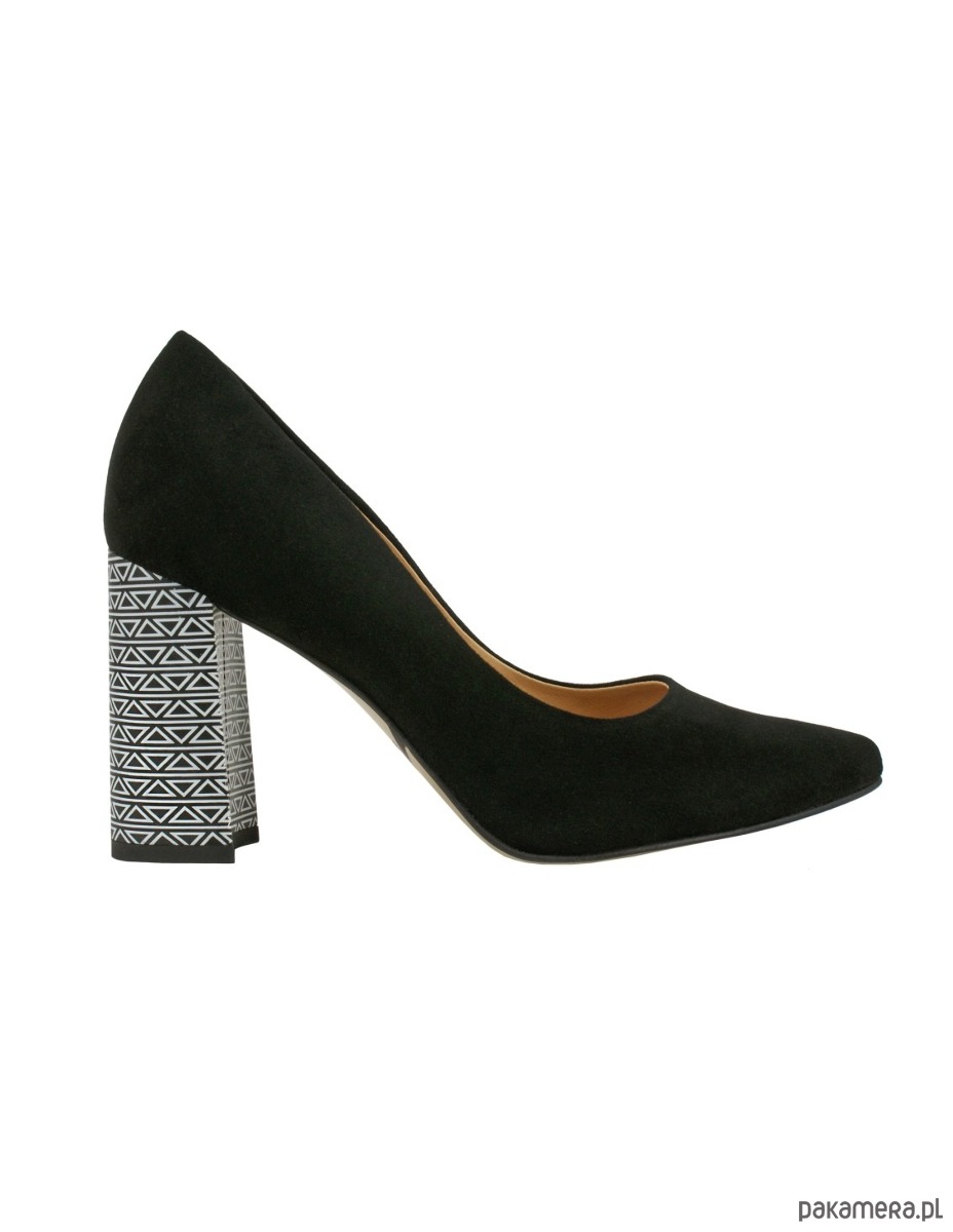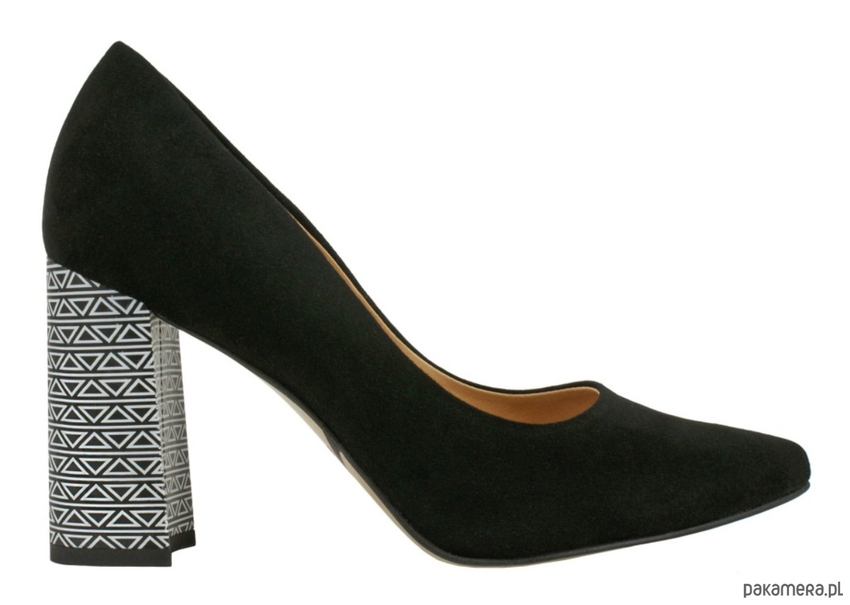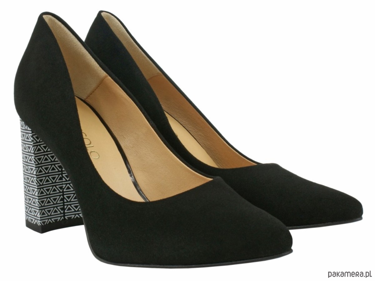 Eleganckie czółenka ze skóry naturalnej, zamszowej na wysokim, zdobionym obcasie.