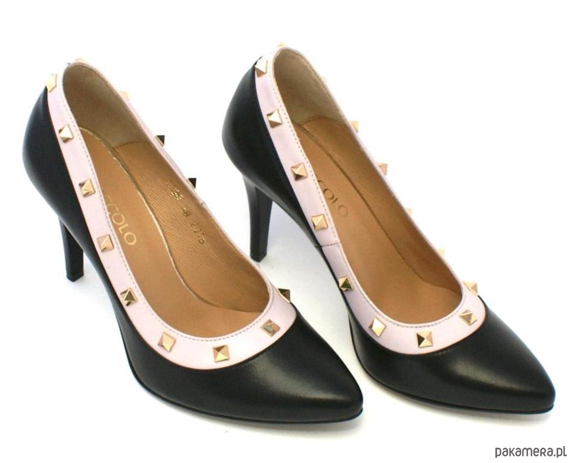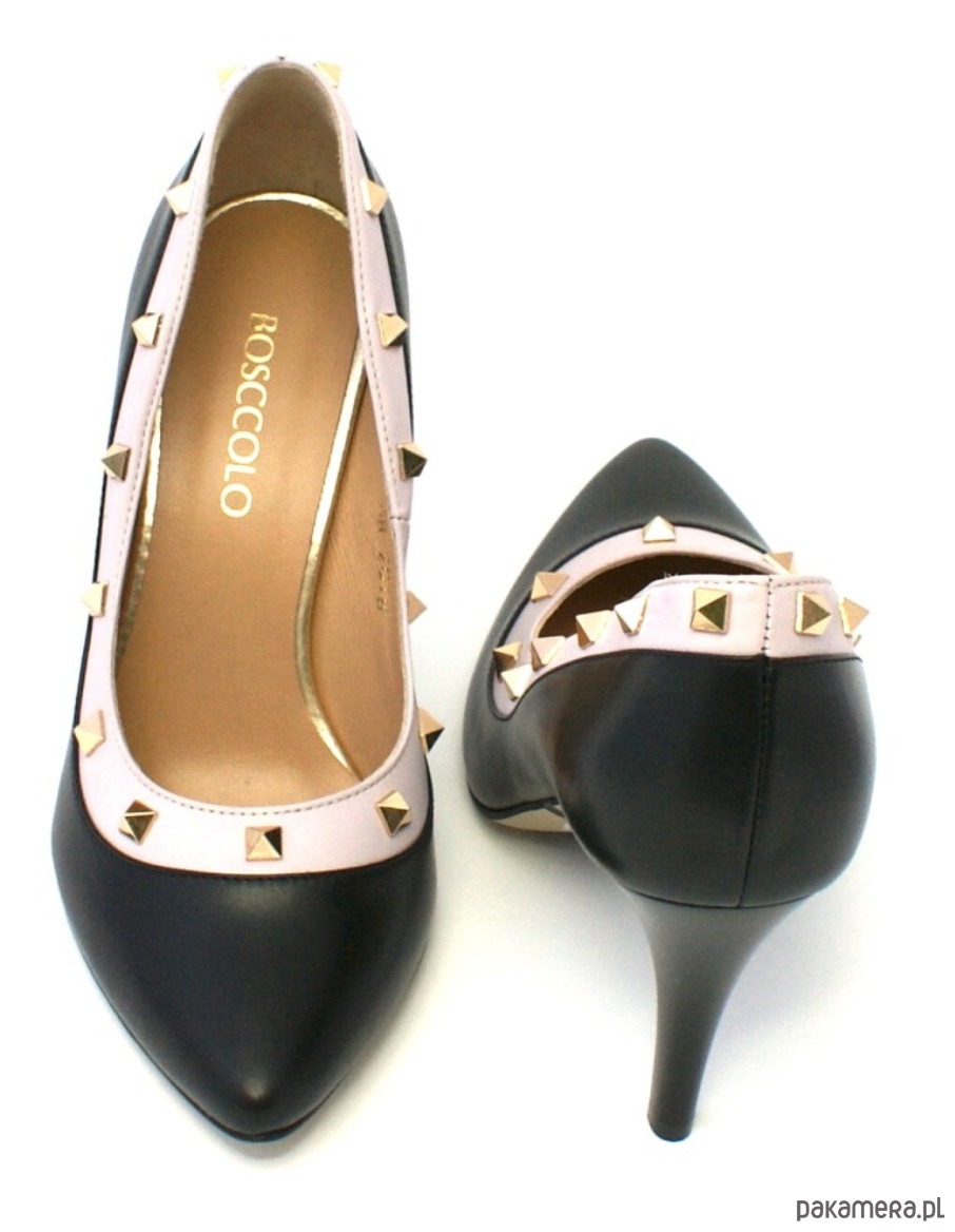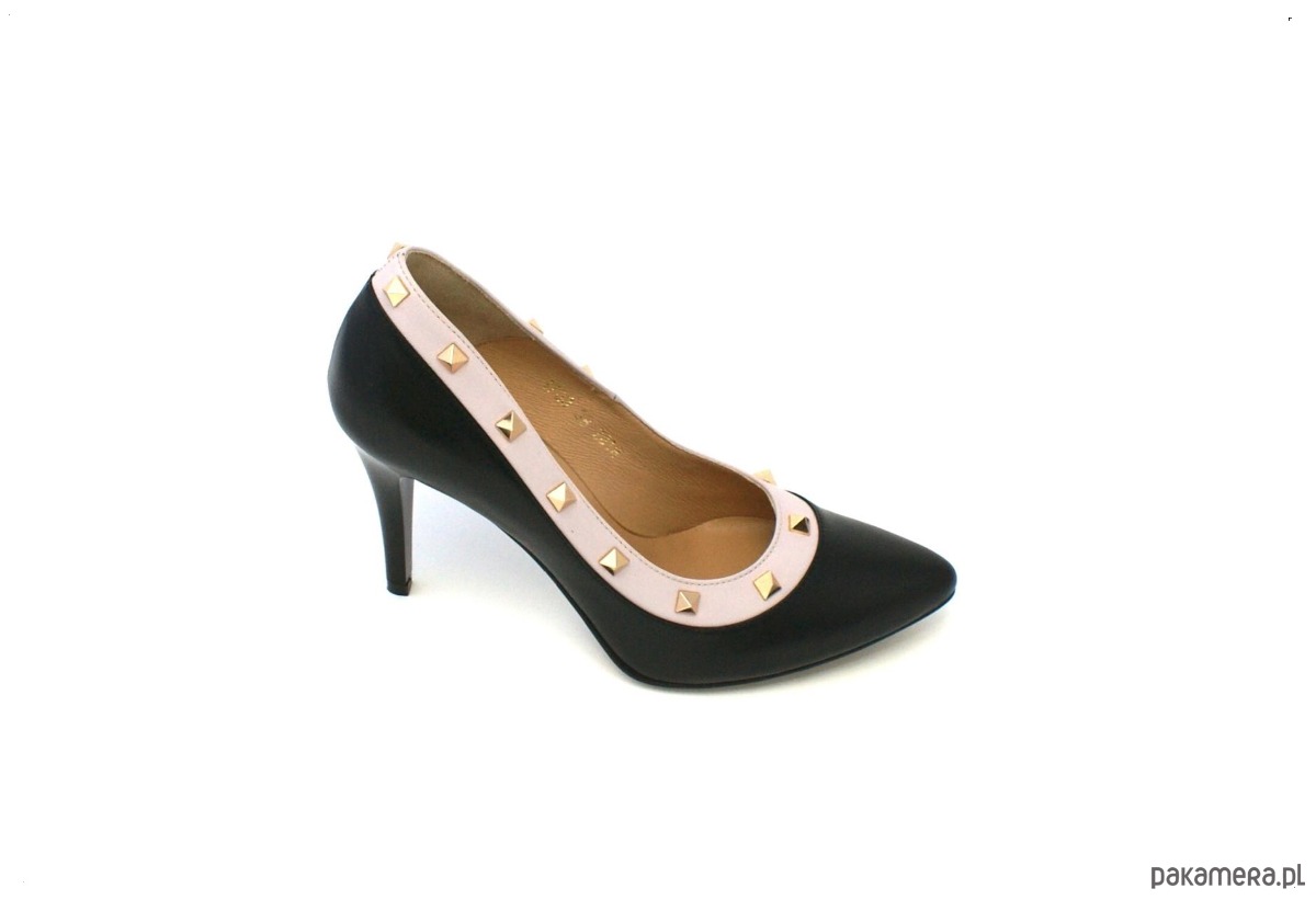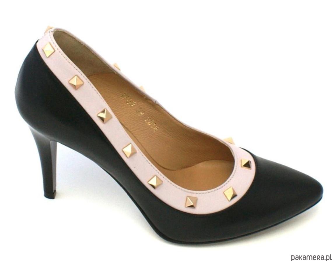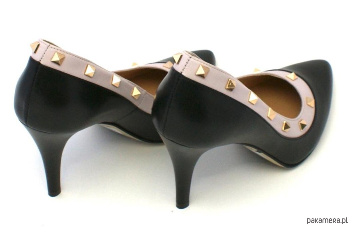 Eleganckie czółenka ze skóry naturalniej, na szpilce, ozdobne złote ćwieki.