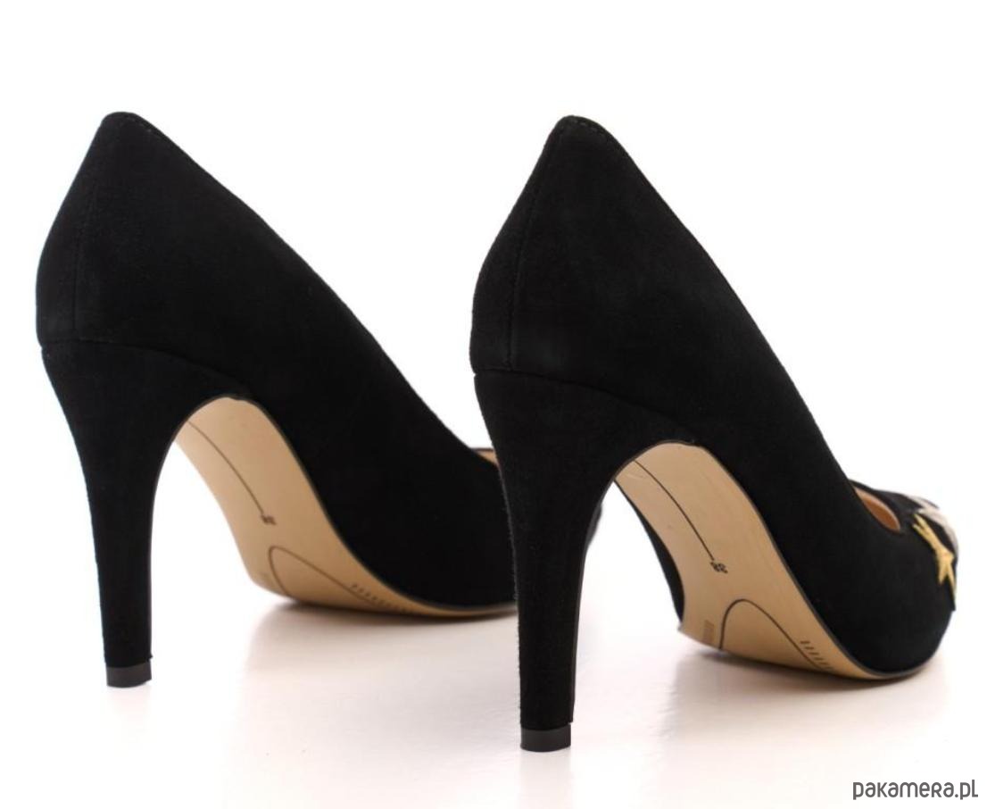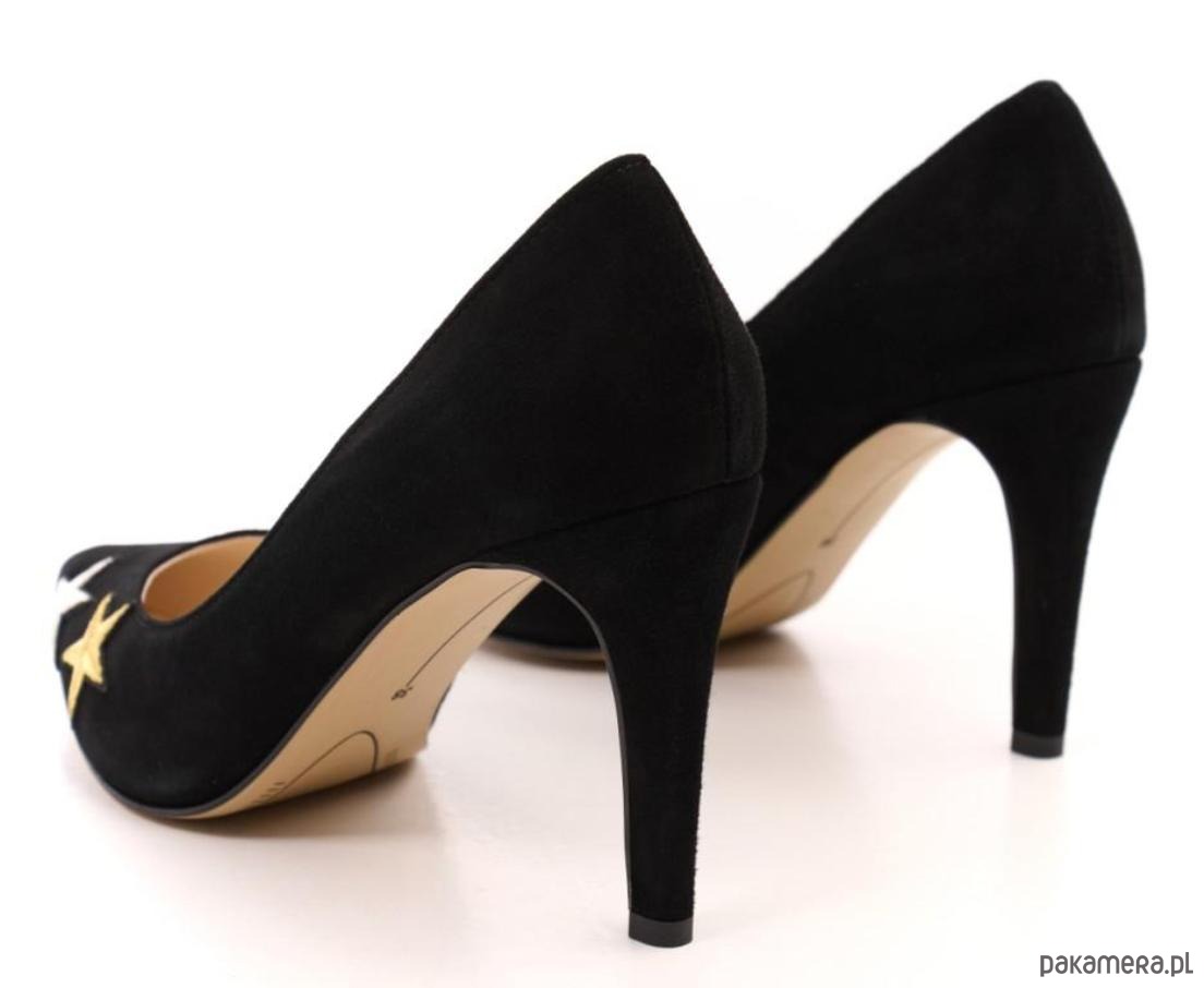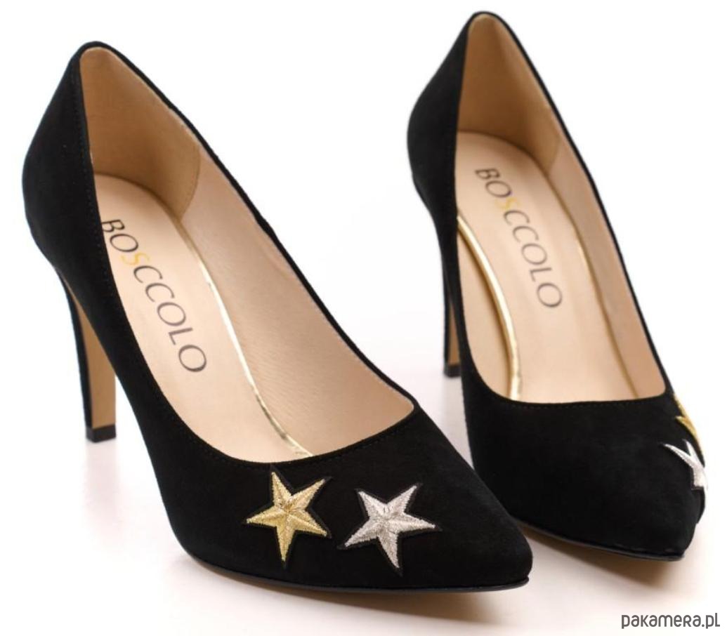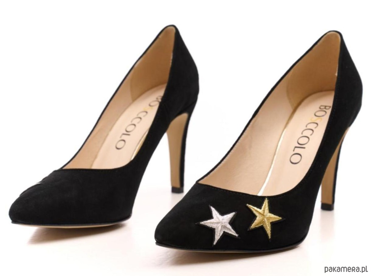 Eleganckie czółenka ze skóry naturalniej, zamszowej, na szpilce, ozdobny haft w gwiazdy.