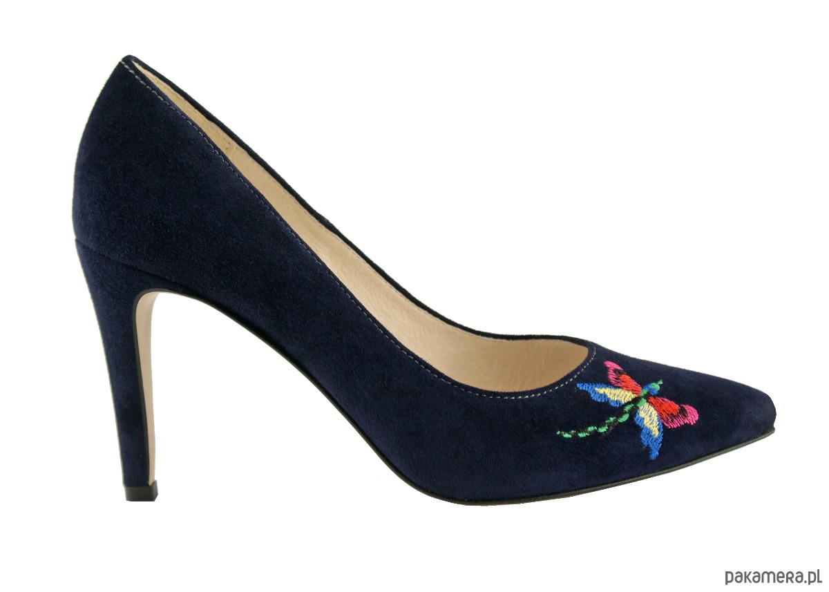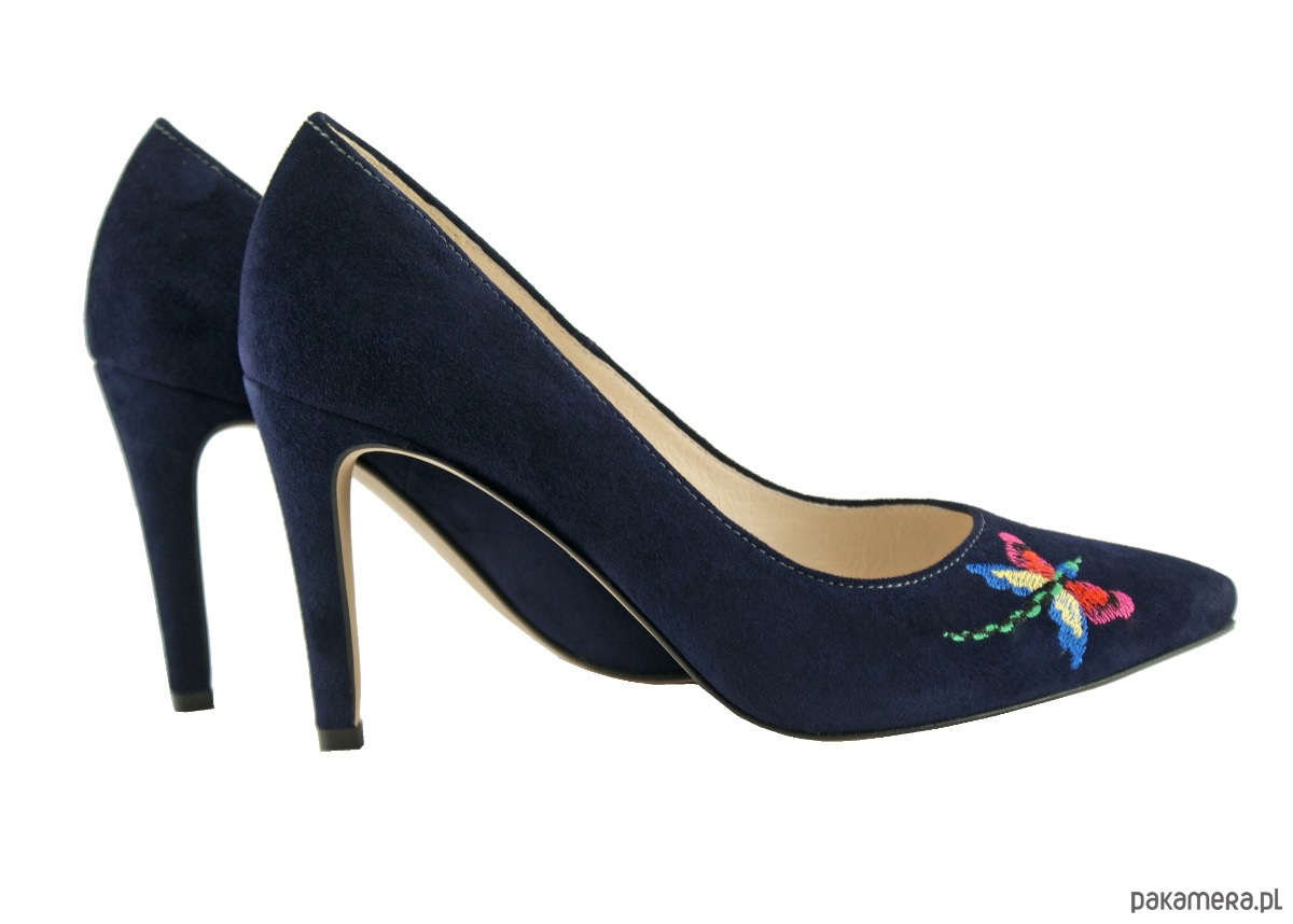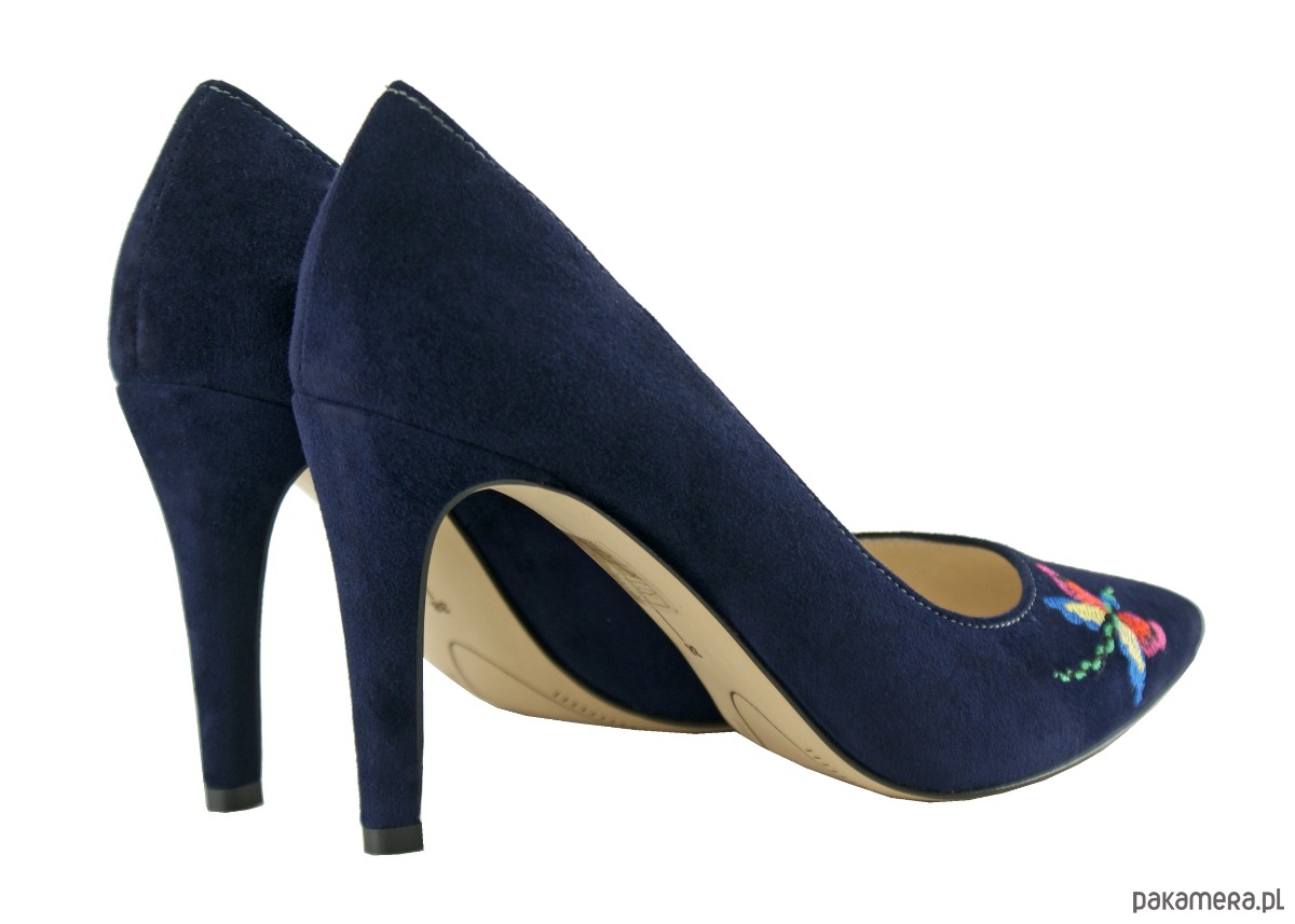 Eleganckie czółenka ze skóry naturalniej, zamszowej, na szpilce, ozdobny haft.