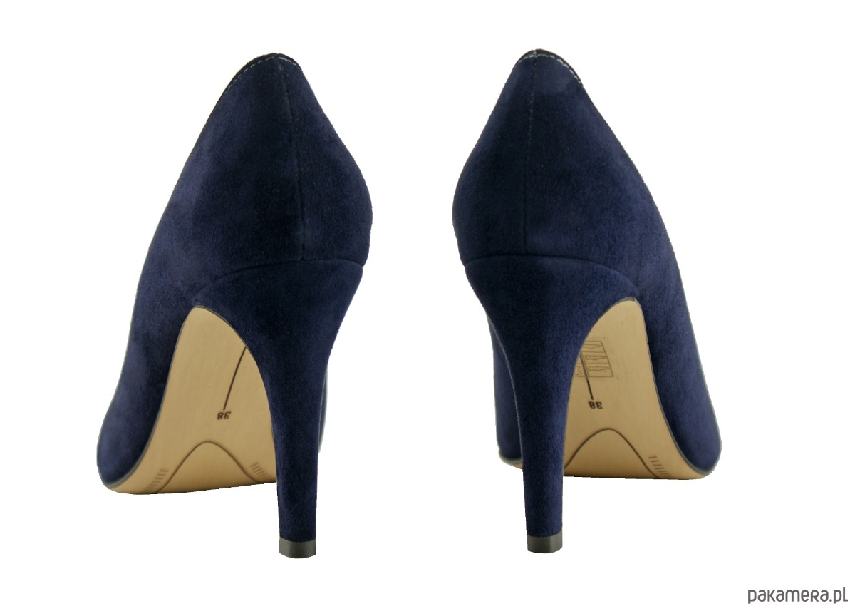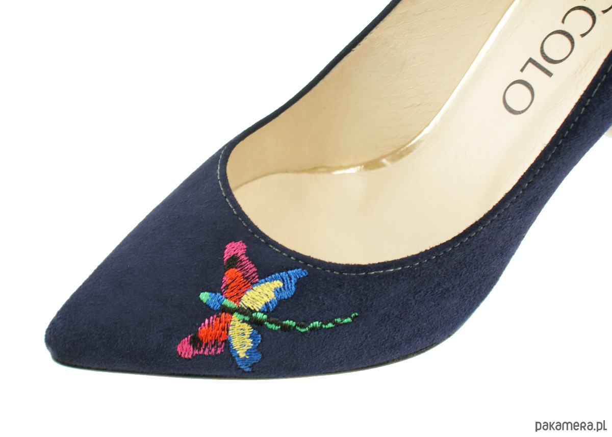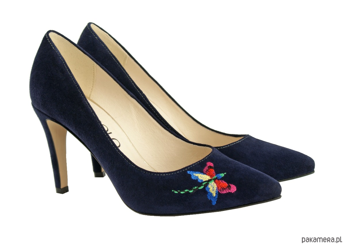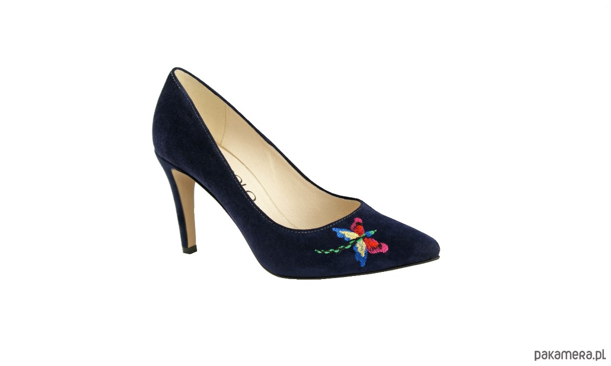Eleganckie czółenka ze skóry naturalniej, zamszowej, na szpilce, ozdobny haft.