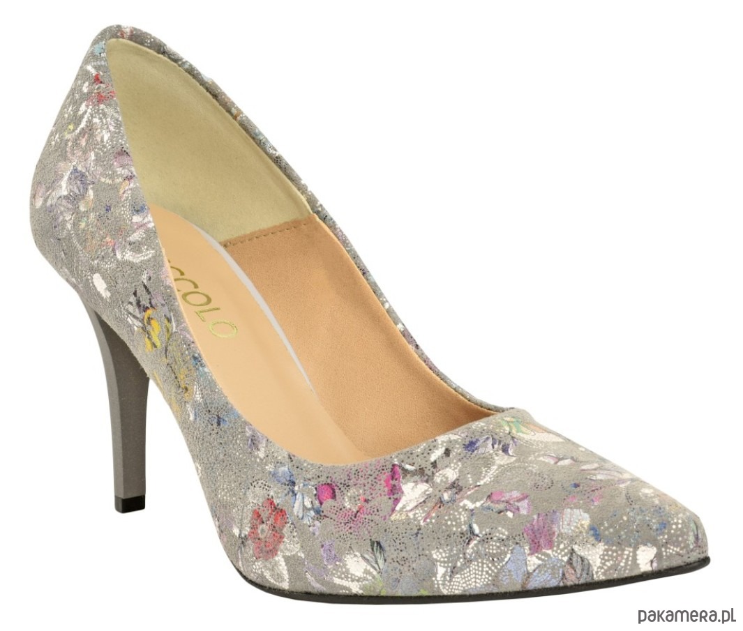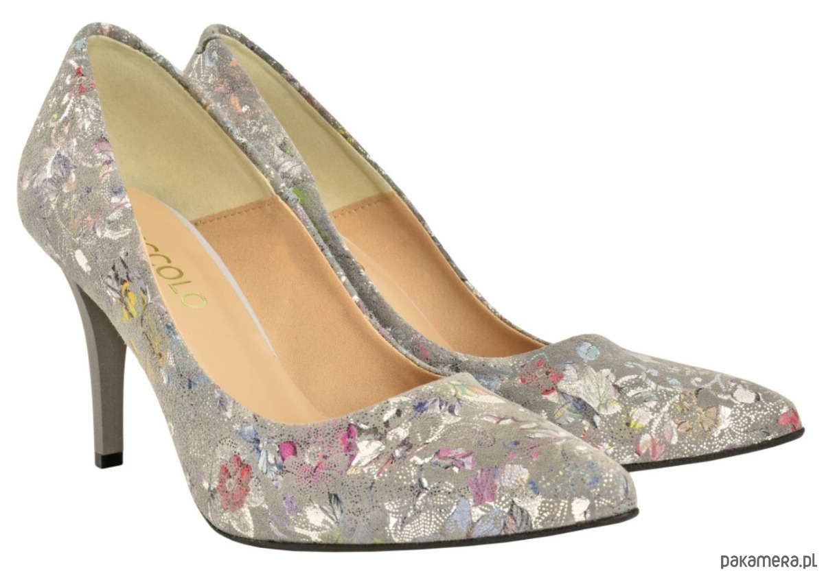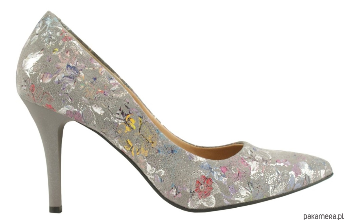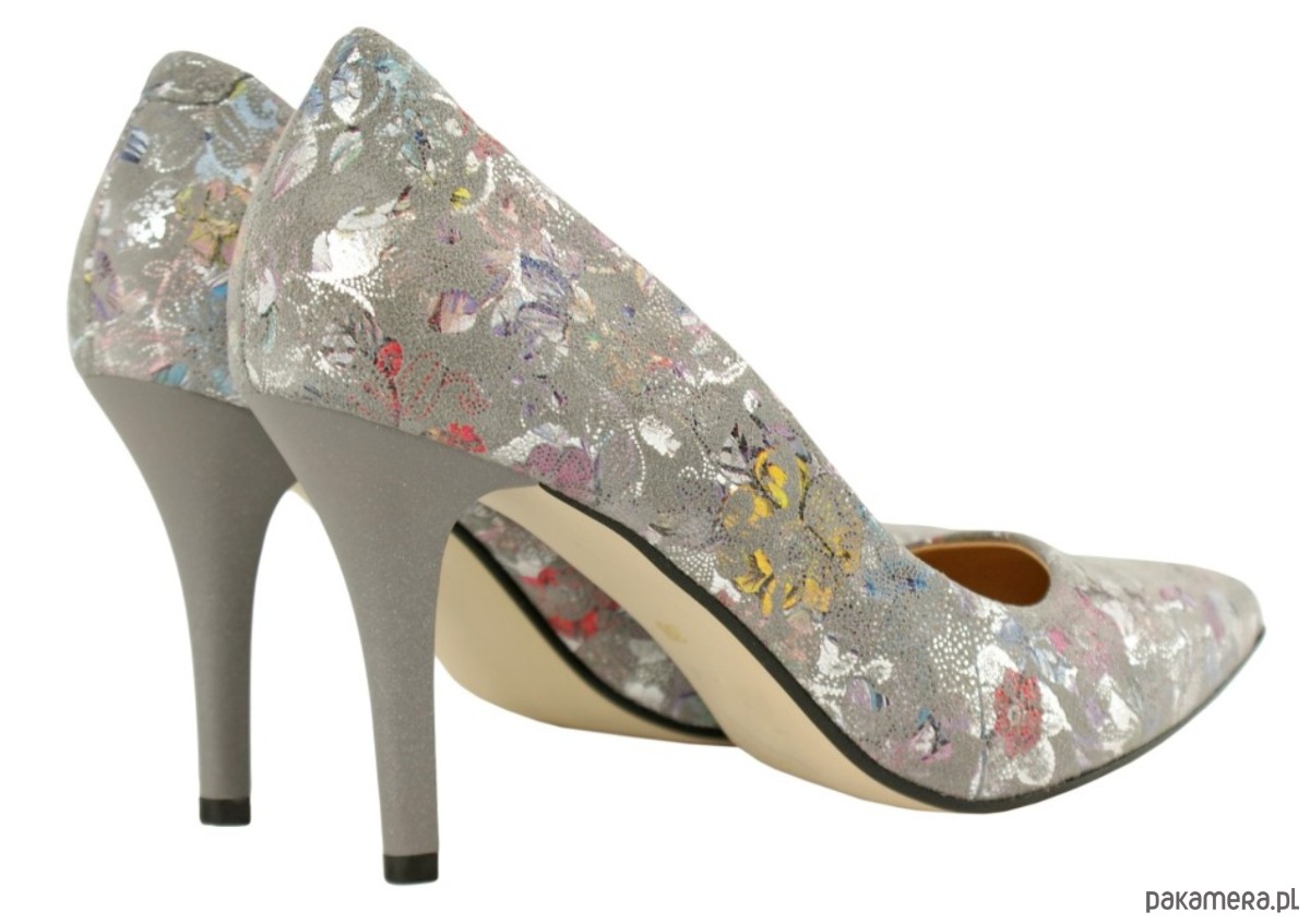 Eleganckie czółenka ze skóry naturalniej w kolorowe kwiatki, na szpilce.